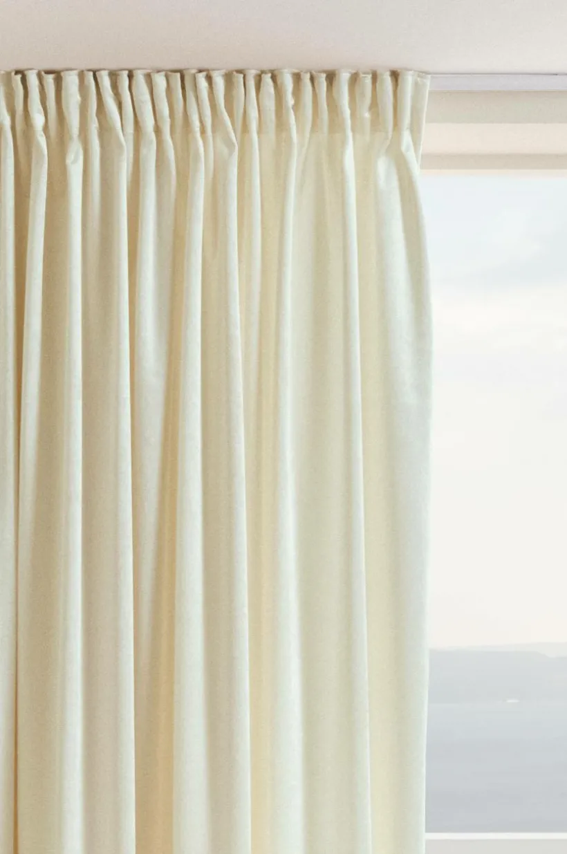 En gardinlängd i elegant sammet av polyester. Sammetstyget skimrar vackert, färgnyansen upplevs olika beroende på hur ljuset faller. Längden har påsytt multifunktionsband. Gardinen kan hängas upp med fingerkrokar, kanal samt dold hälla.