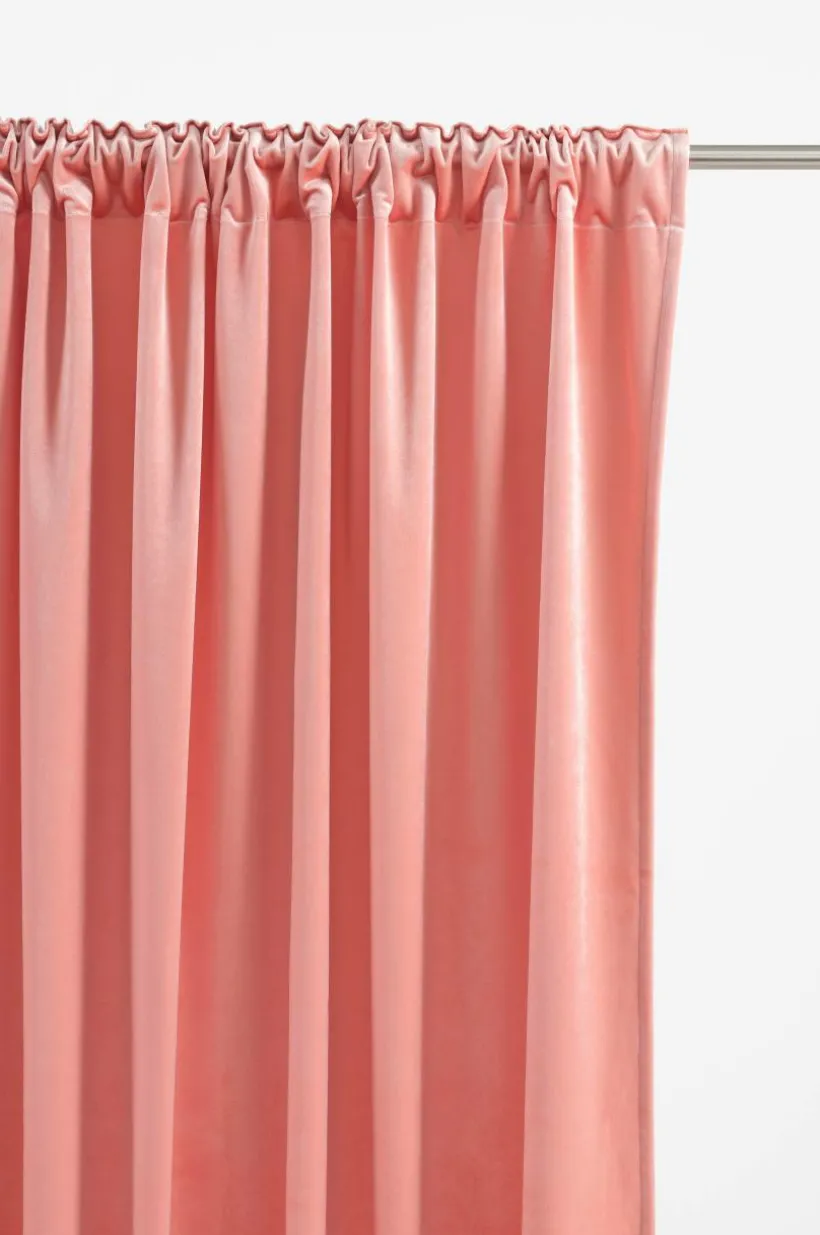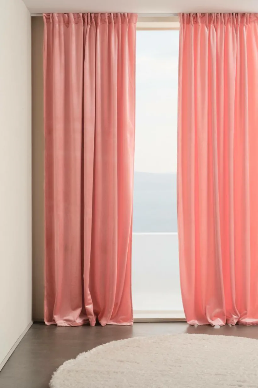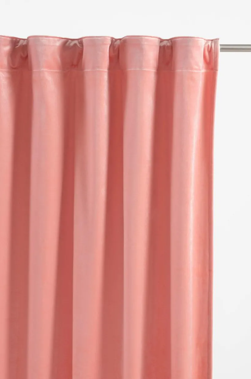 Två gardinlängder i elegant sammet av polyester. Sammetstyget skimrar vackert, färgnyansen upplevs olika beroende på hur ljuset faller. Längden har påsytt multifunktionsband. Gardinen kan hängas upp med fingerkrokar, kanal samt dold hälla.