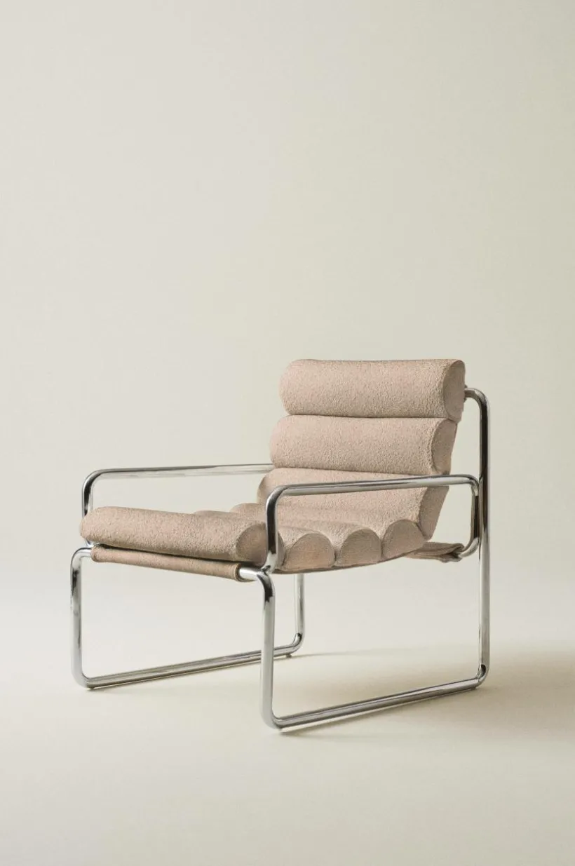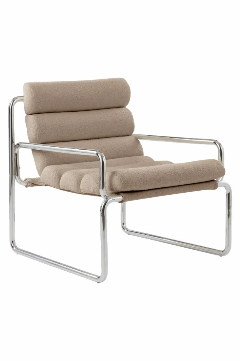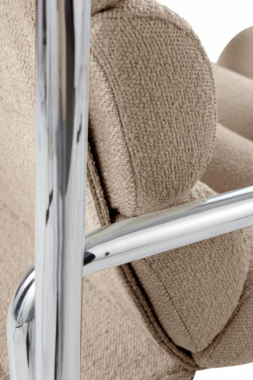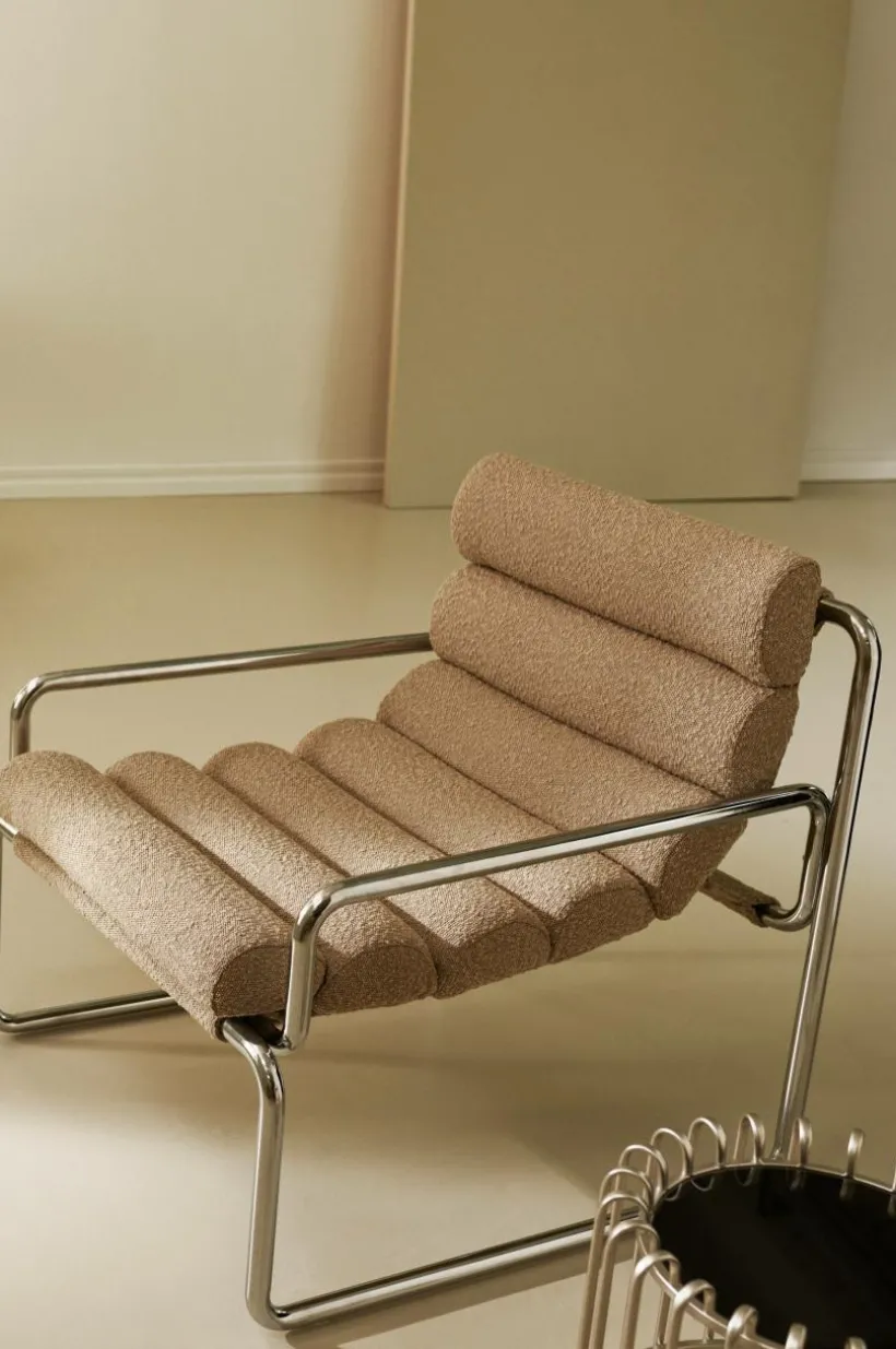 I fåtöljen SINES kombinerar vi kromade stålrör och cylinderformad sits på bästa 80-talsvis. Resultatet blir en bekväm och lättplacerad fåtölj som ger rummet en luftig och fräsch känsla. Det ljusa tyget är en mjuk bouclé av återvunnet material och stoppningen av skum ger komfort. Järnrören har kromad plätering.