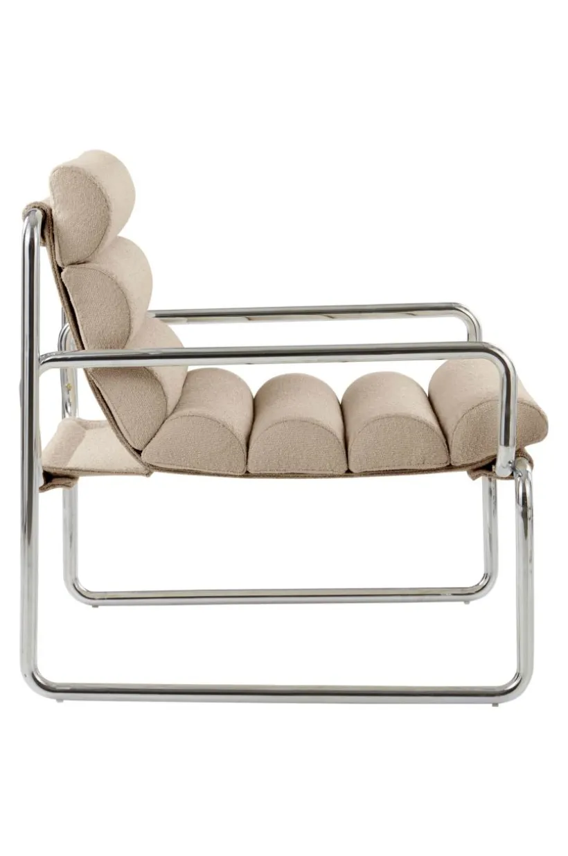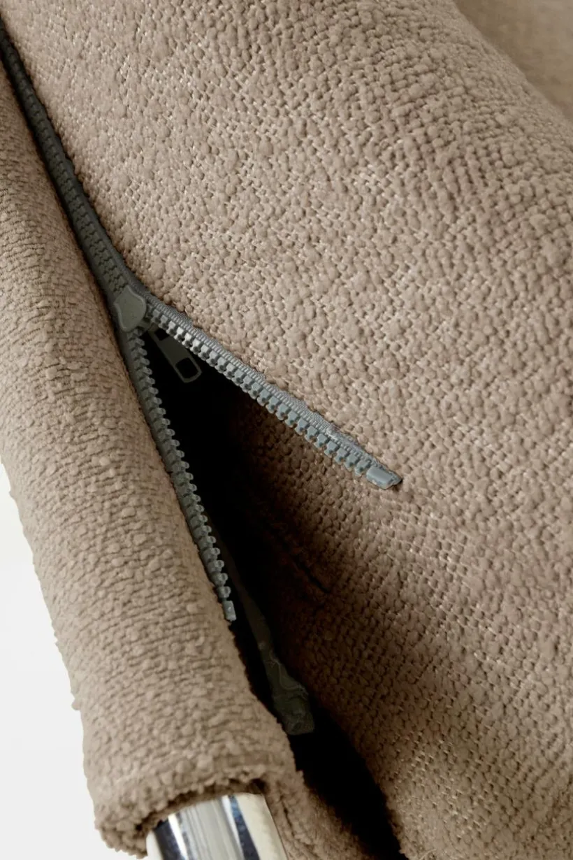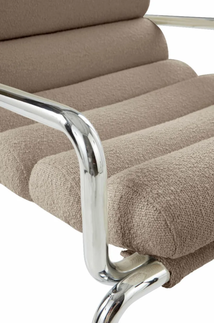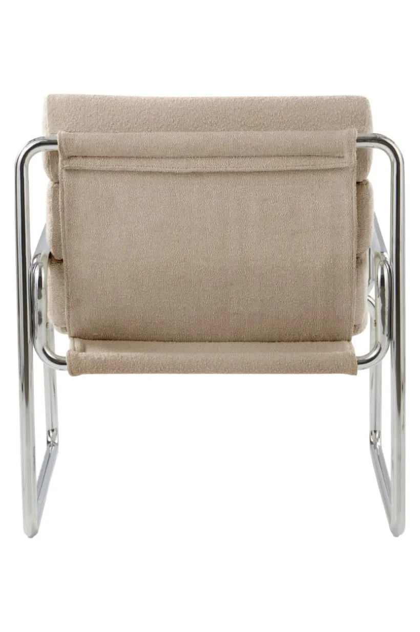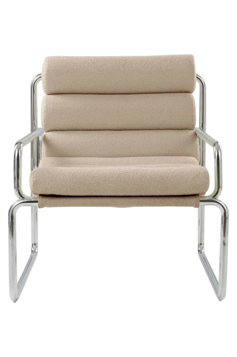 I fåtöljen SINES kombinerar vi kromade stålrör och cylinderformad sits på bästa 80-talsvis. Resultatet blir en bekväm och lättplacerad fåtölj som ger rummet en luftig och fräsch känsla. Det ljusa tyget är en mjuk bouclé av återvunnet material och stoppningen av skum ger komfort. Järnrören har kromad plätering.