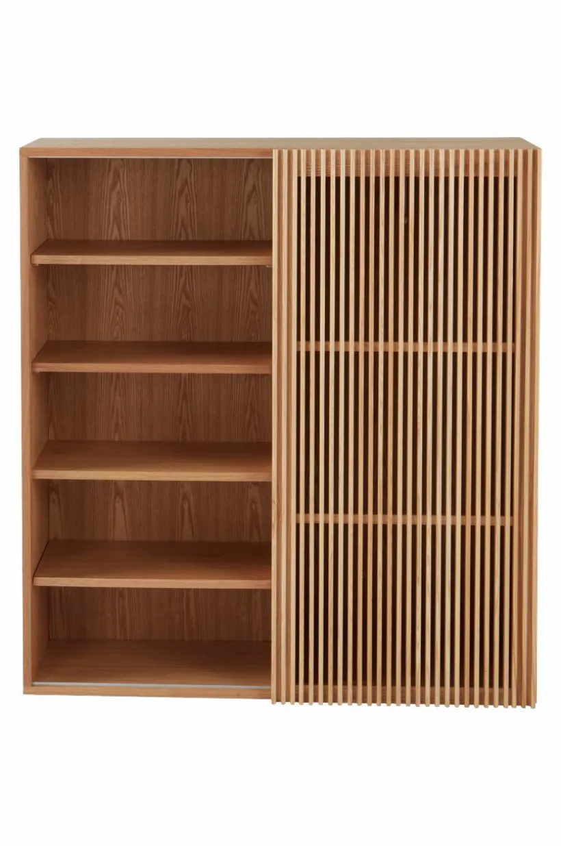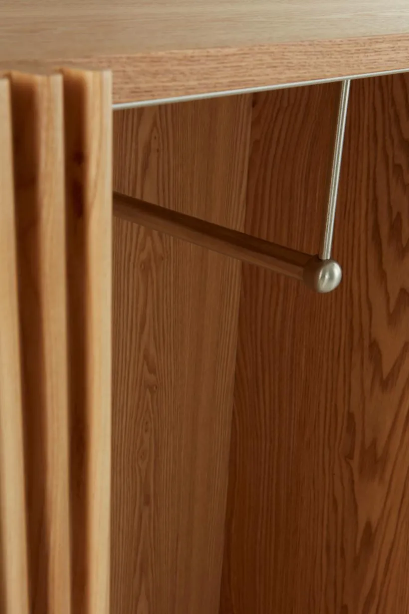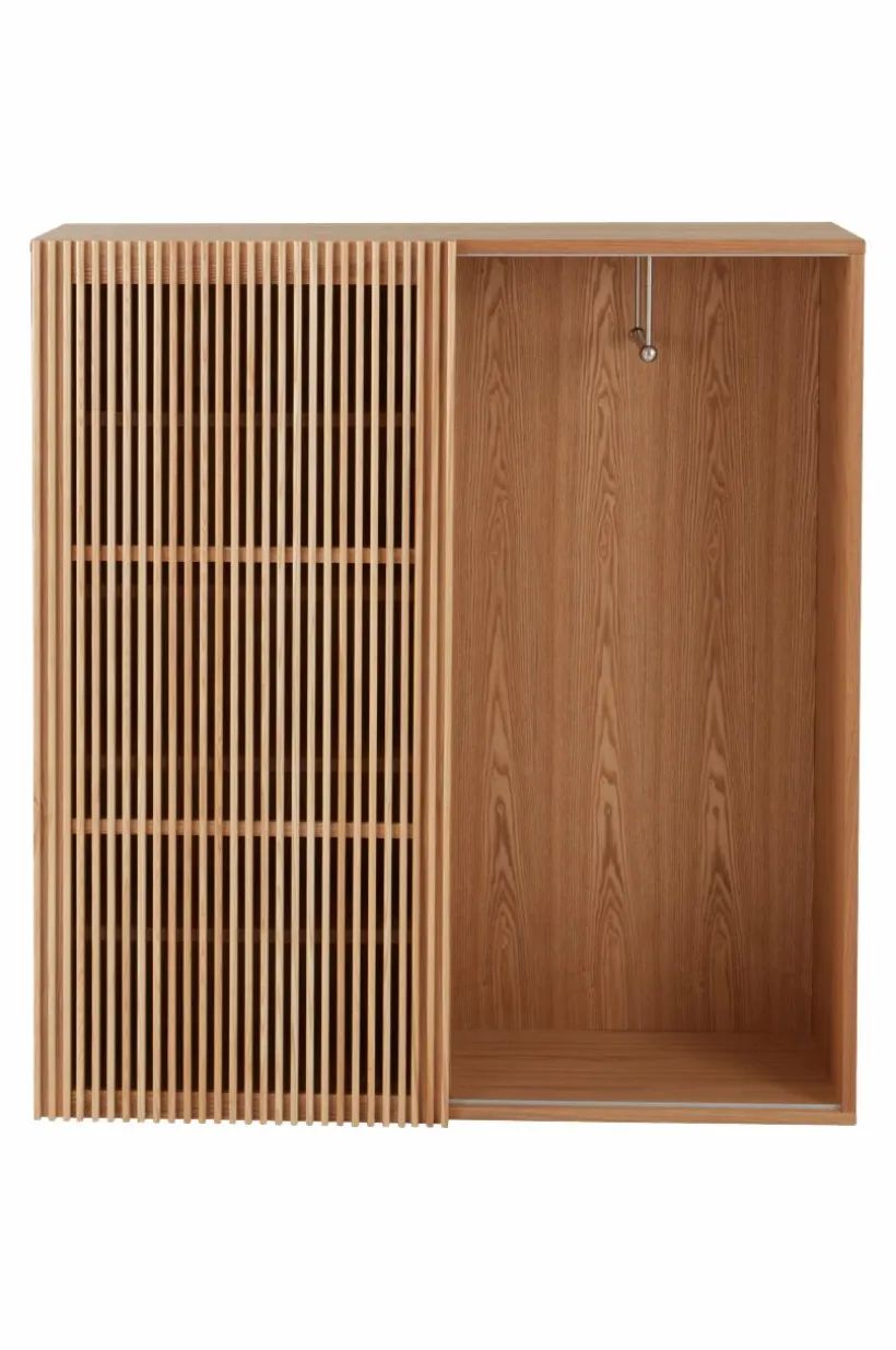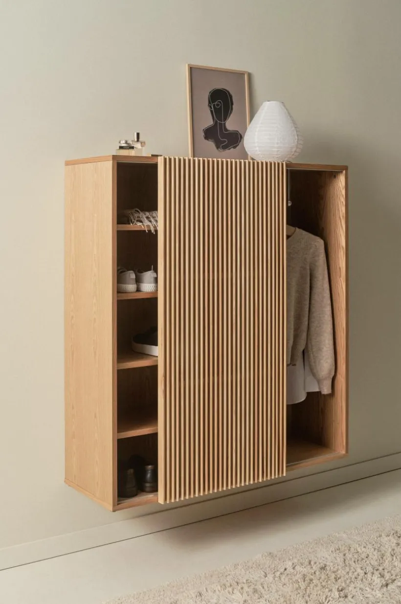 Vägghängt skåp, perfekt hallförvaring med en skjutdörr av massiv ask, stomme av MDF med askfaner. Skåpet ger en naturlig känsla i sin skandinaviska stil med en touch av retro. Den stilrena dörren består av askribbor med rundad kant och lätt transparens uppstår i mellanrummen. Skjutdörren döljer halva skåpet där det finns hängare för kläder och resterande del blir öppna hyllor för till exempel skor, väskor, mössor och vantar. Skåpet har ett fyra hyllplan som kan justeras i höjd. Skruvar medföljer. Viss montering krävs. Monteringsanvisning medföljer.
