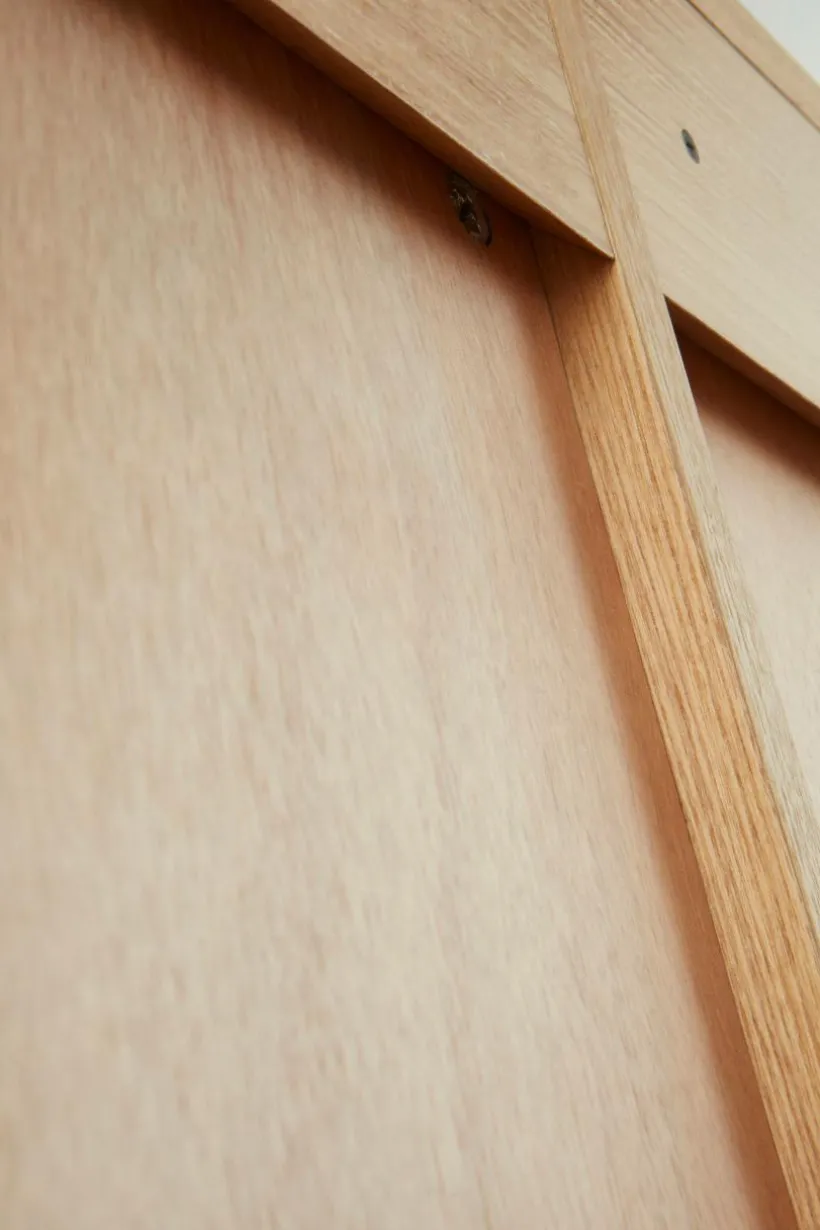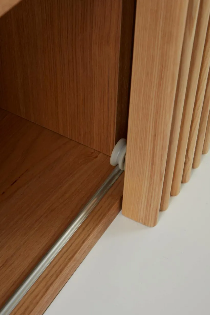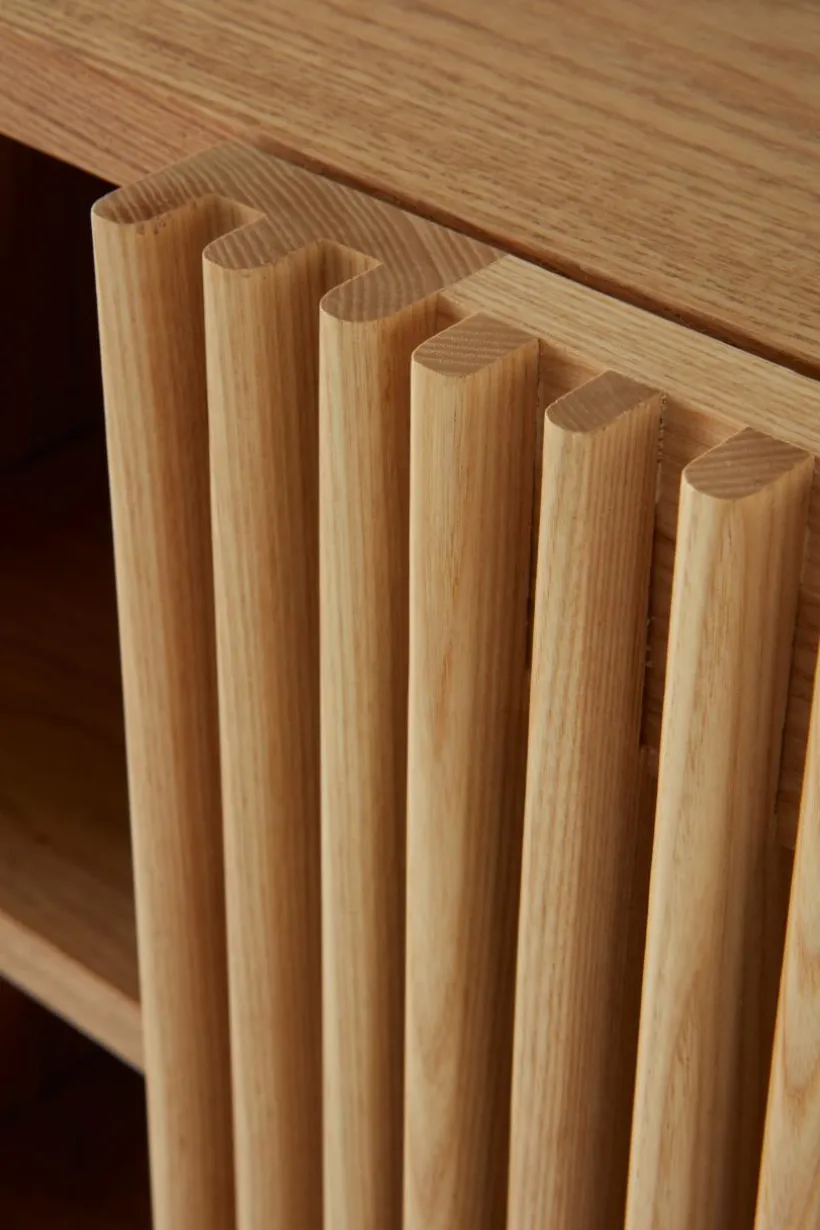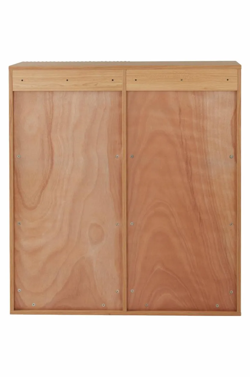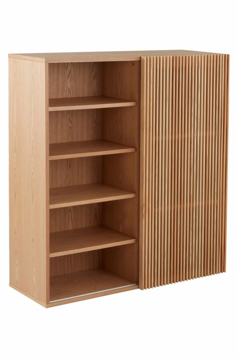 Vägghängt skåp, perfekt hallförvaring med en skjutdörr av massiv ask, stomme av MDF med askfaner. Skåpet ger en naturlig känsla i sin skandinaviska stil med en touch av retro. Den stilrena dörren består av askribbor med rundad kant och lätt transparens uppstår i mellanrummen. Skjutdörren döljer halva skåpet där det finns hängare för kläder och resterande del blir öppna hyllor för till exempel skor, väskor, mössor och vantar. Skåpet har ett fyra hyllplan som kan justeras i höjd. Skruvar medföljer. Viss montering krävs. Monteringsanvisning medföljer.