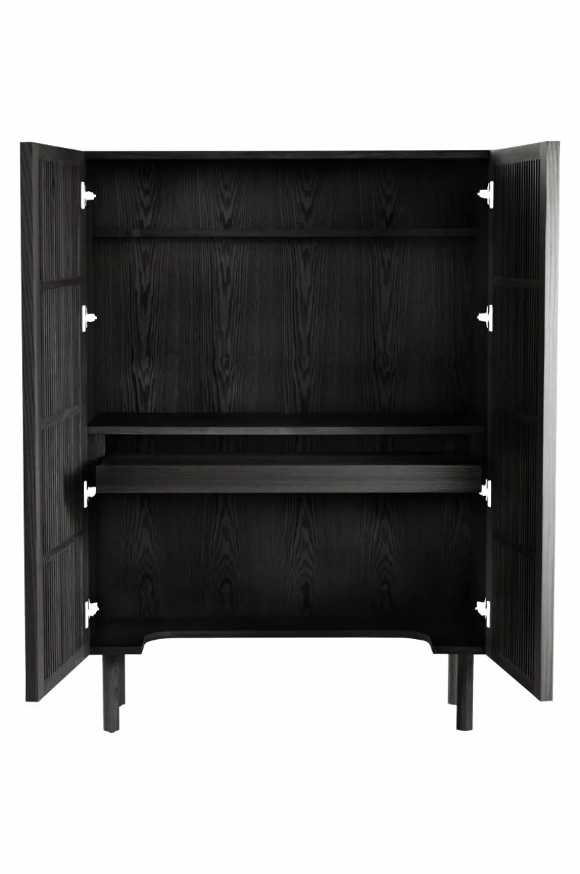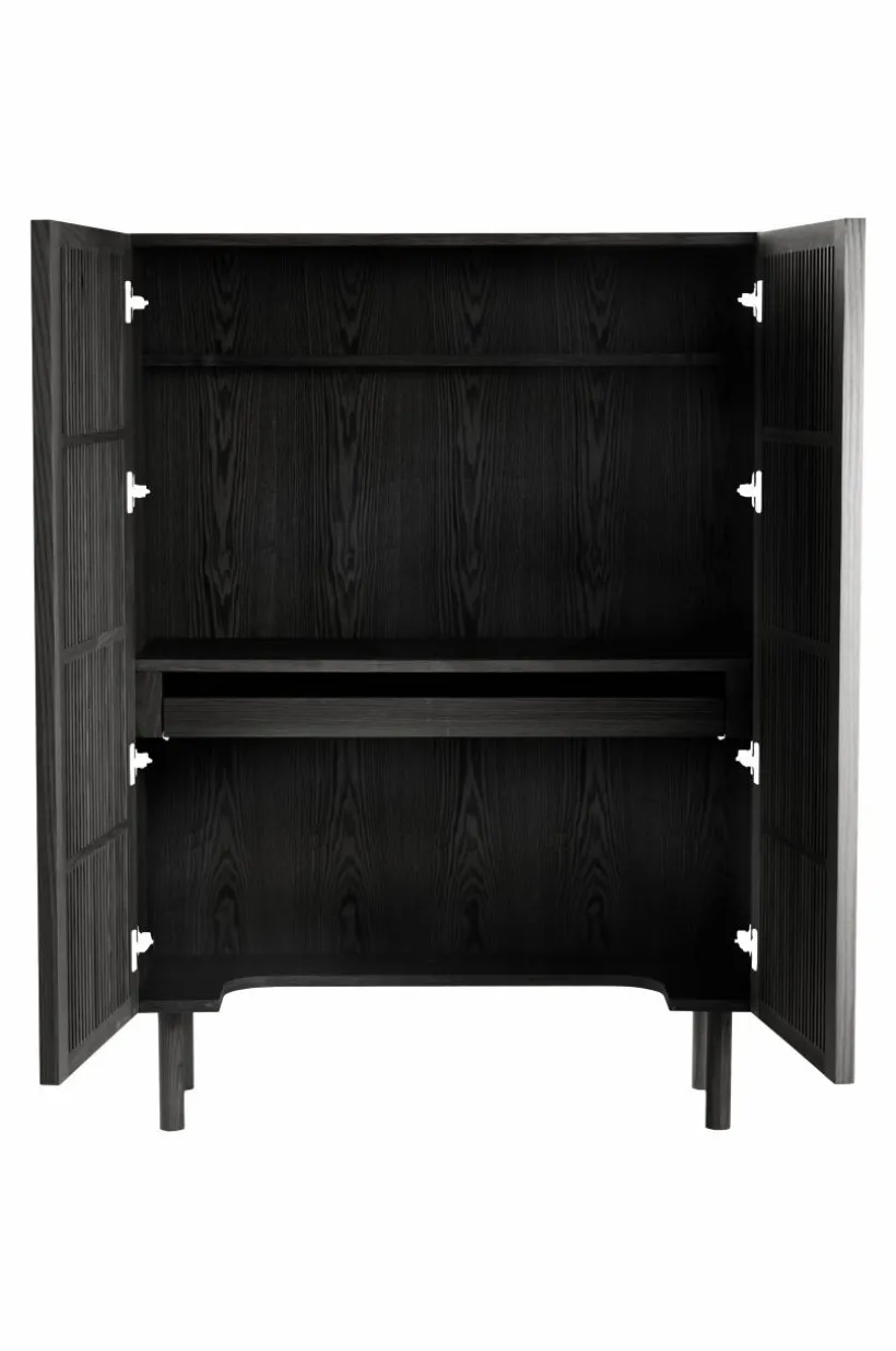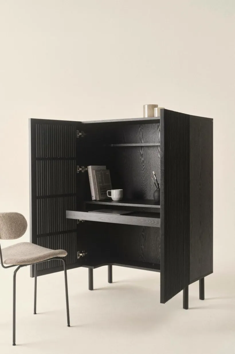 Skåp med inbyggt skrivbord. Skåpet har dörrar och ben av massiv ask, stomme av MDF med askfaner. Med detta skåpet får du det perfekta hemmakontoret som döljer din dator och arbetstillbehör när du är ledig. Bakom dörrarna finns ett utdragbart skrivbord och en specialhylla för din skärm. Hyllan ovanför skärmen lämnar utrymme för skärmen och den nedersta hyllan är formad så du får benutrymme när du sitter och arbetar. Skåpet ger en naturlig känsla i sin skandinaviska stil med en touch av retro. De stilrena dörrarna består av askribbor med rundad kant och lätt transparens uppstår i mellanrummen. Raka, runda ben ger en nätt känsla. Hål finns i bakstycket för eventuella kablar. Skruvar medföljer. Viss montering krävs. Monteringsanvisning medföljer.