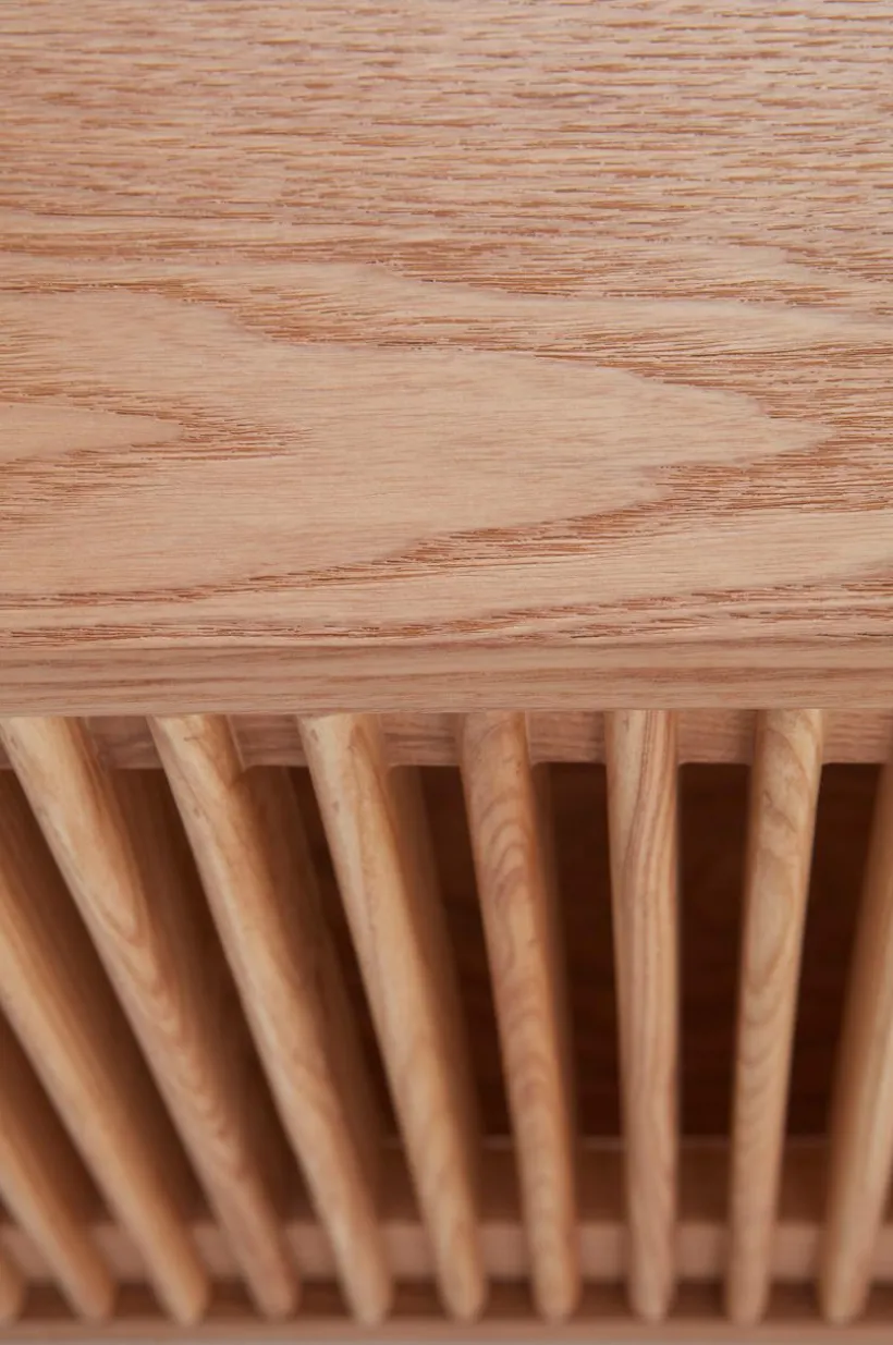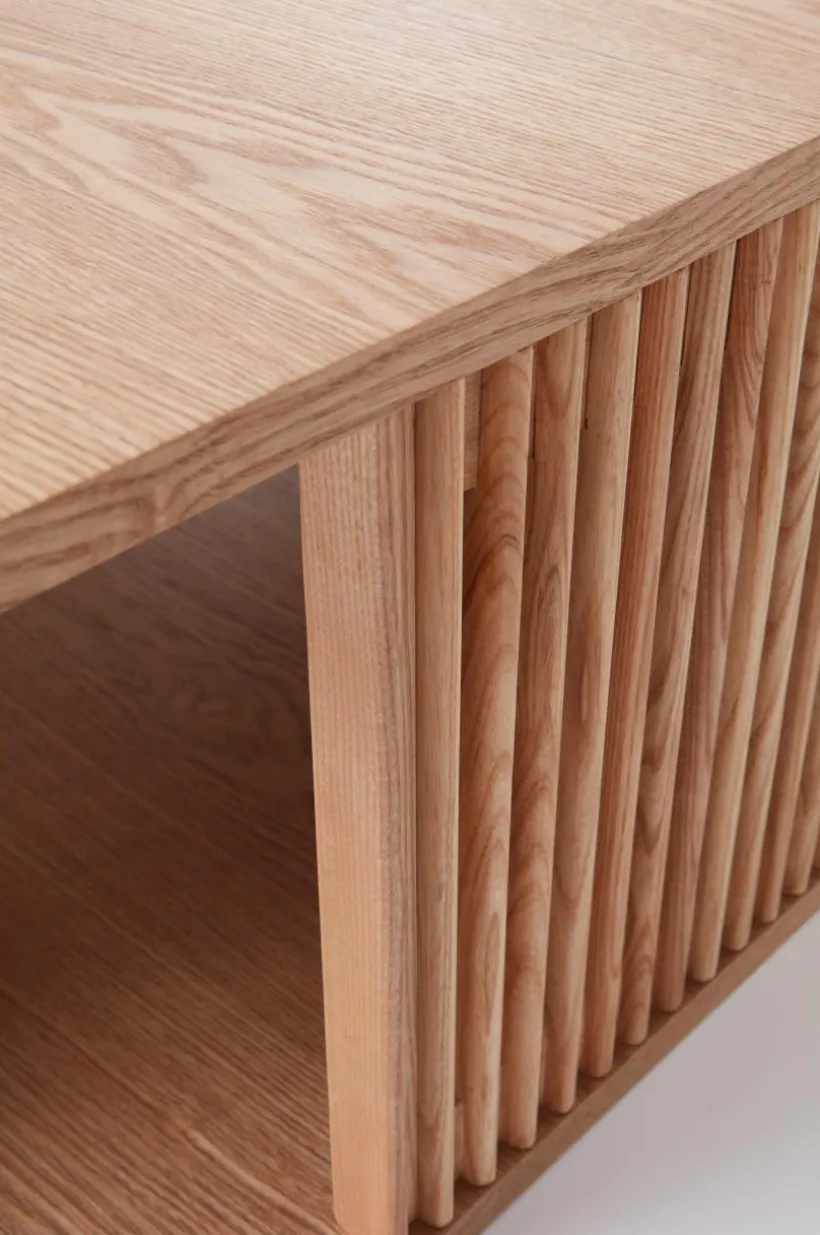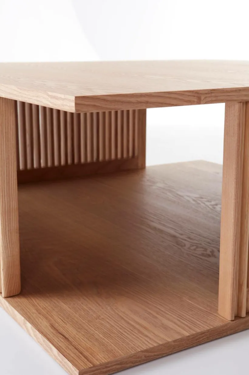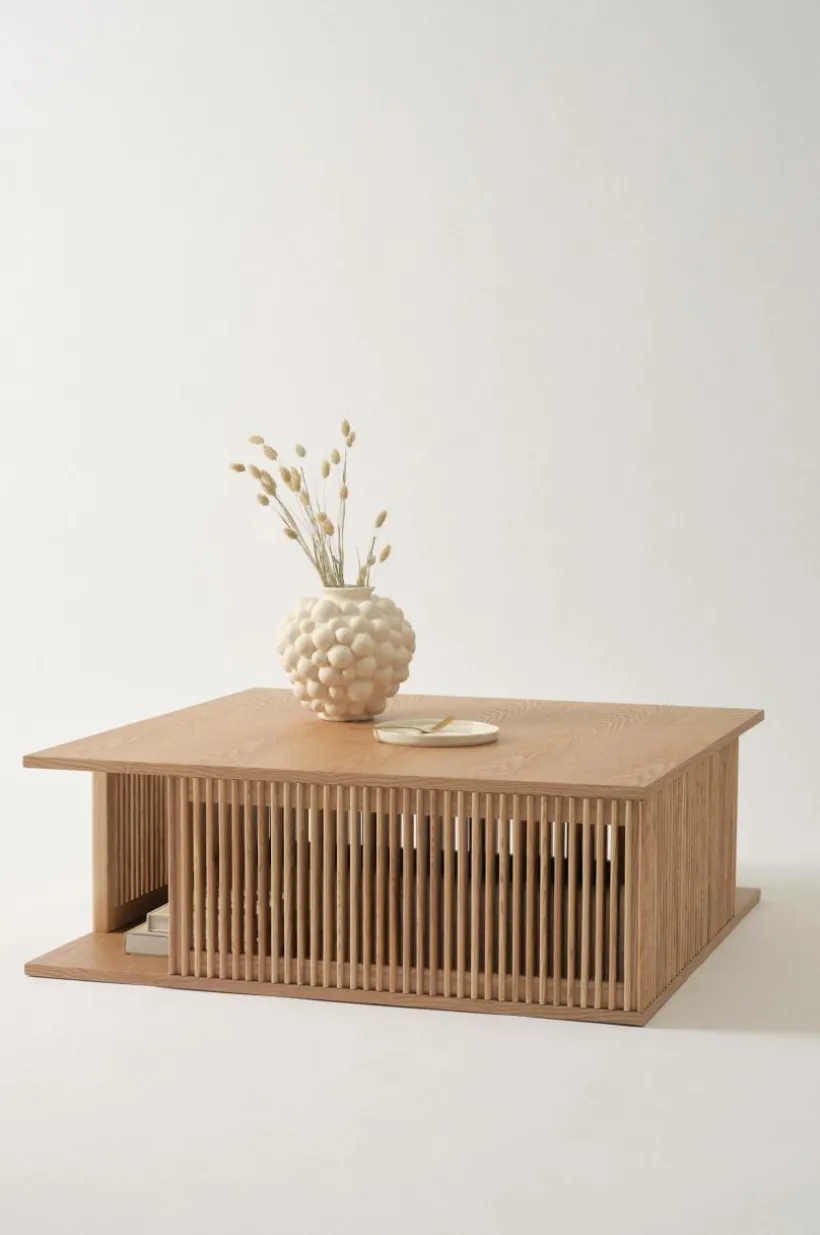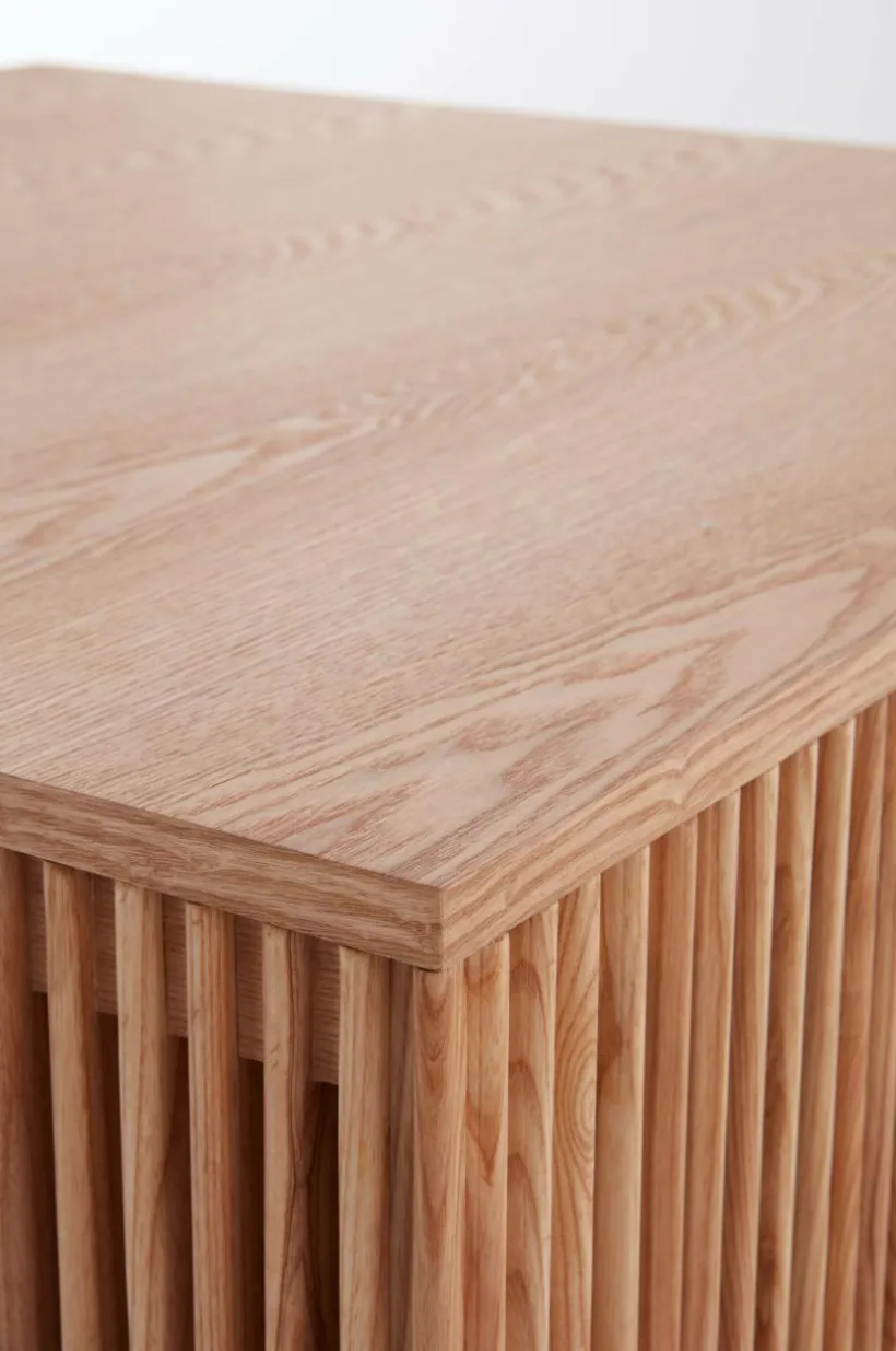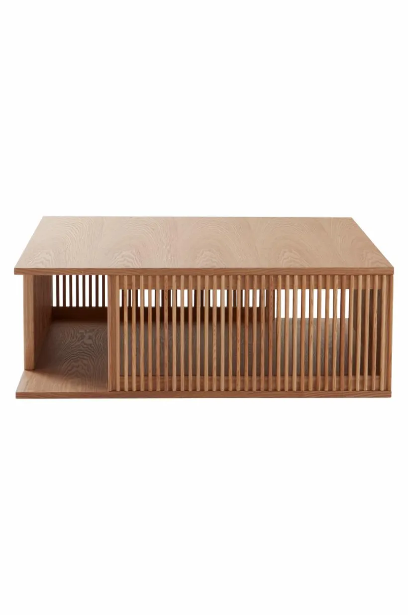 Kvadratiskt soffbord med vertikala ribbor runt om av massiv ask. Bordsskivan och stommen är tillverkade av MDF med askfaner. Bordet ger en naturlig känsla i sin skandinaviska stil med en touch av retro. De vackra askribborna har rundad kant och lätt transparens uppstår i mellanrummen. På varje sida om bordet finns en öppning så du kan utnyttja utrymmet under bordsskivan till förvaring.