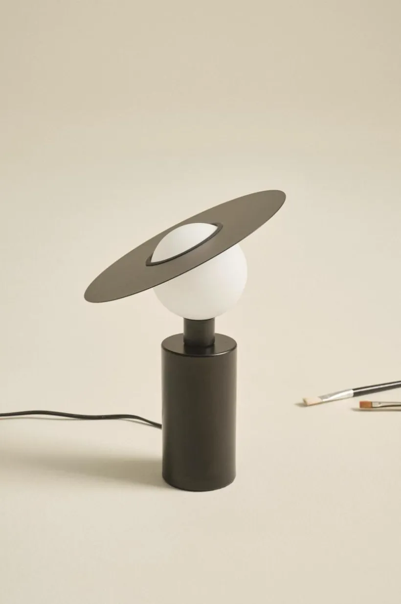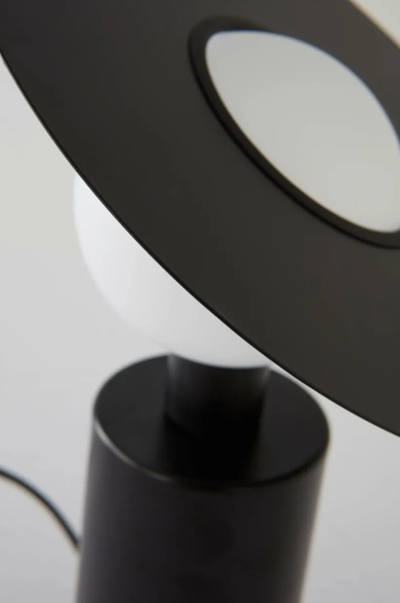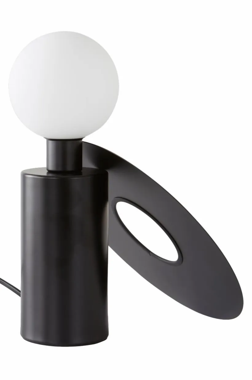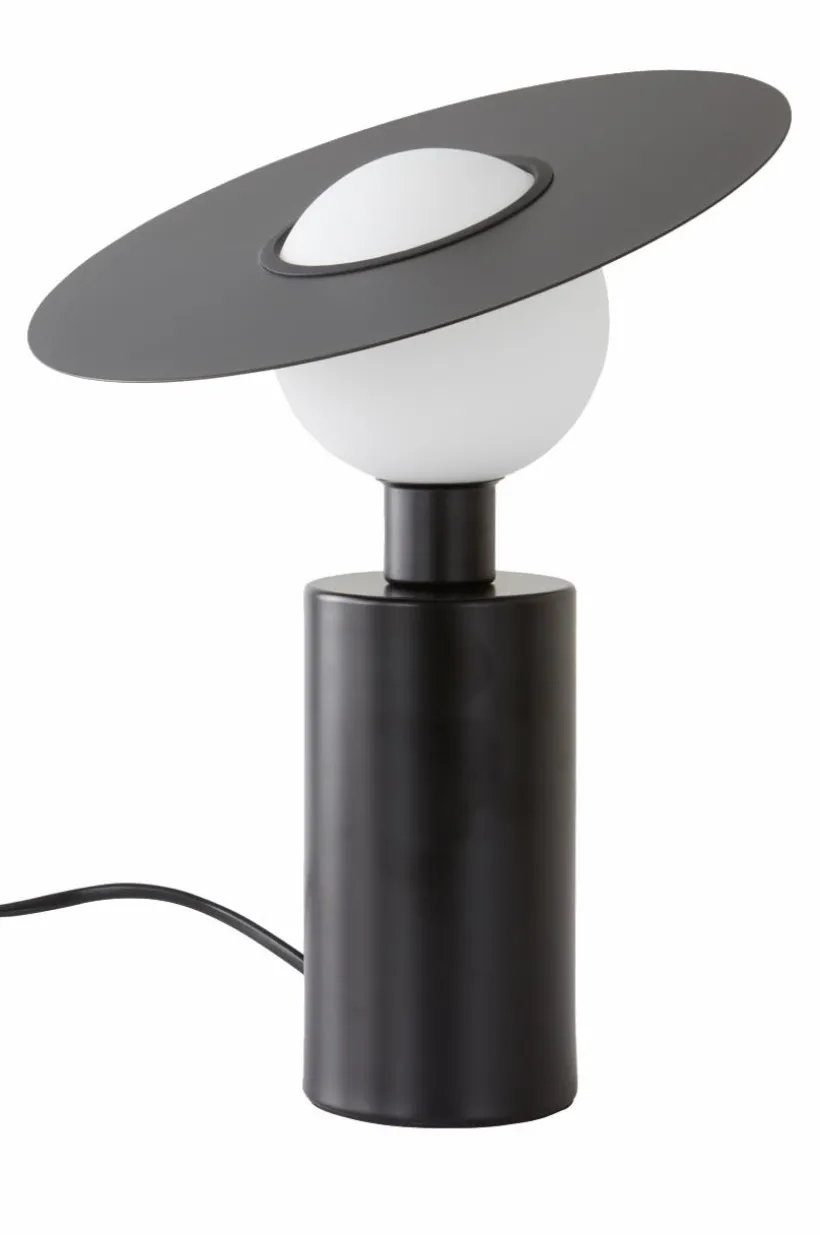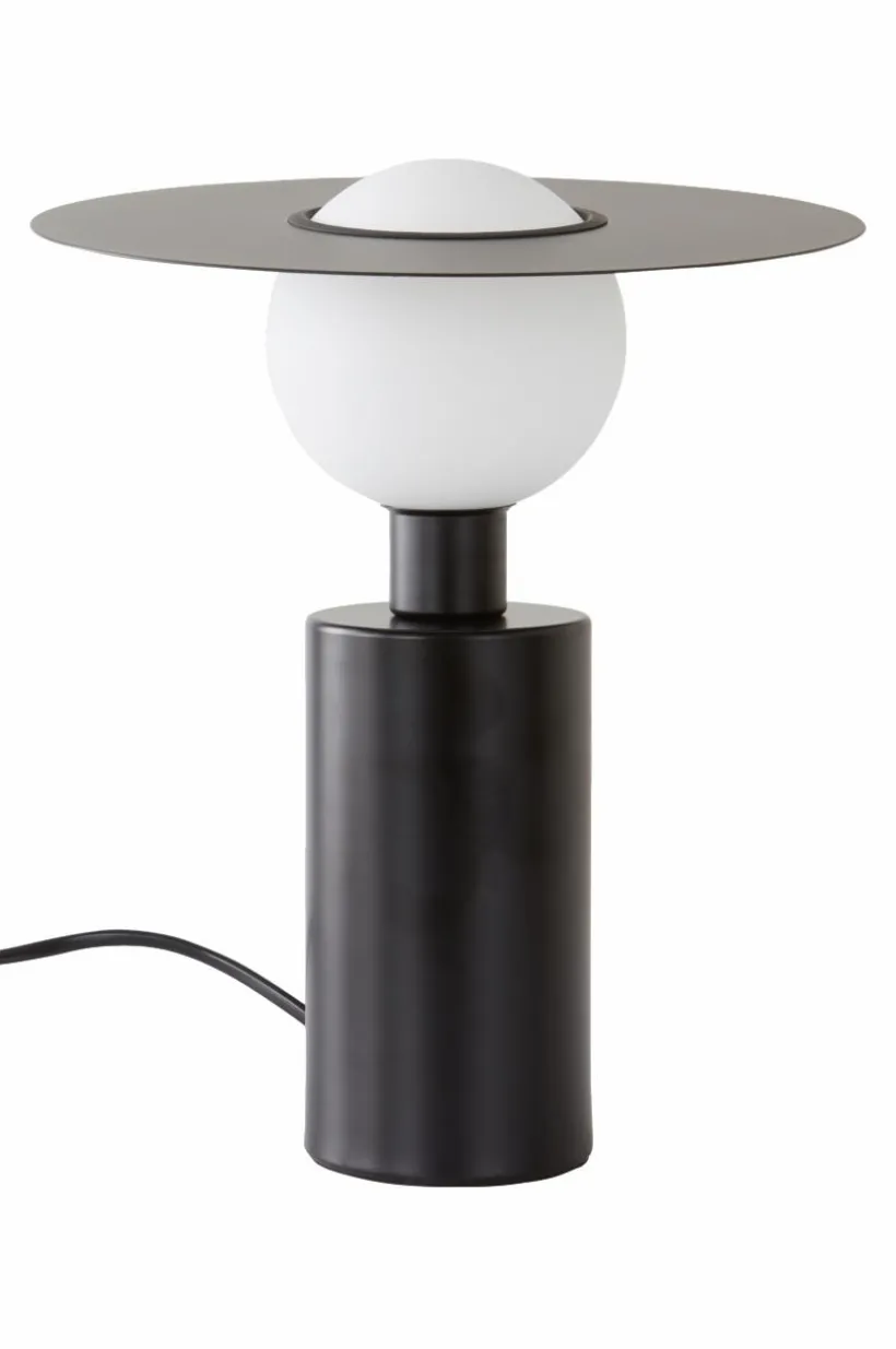 Spännande bordslampa av metall med rund kupa av opalglas, en lampa som ger flexibelt ljus tack vare skärmen på toppen. Skärmen kan du placera fritt som du vill på kupan och på så sätt skapa stämningsfullt ljus. Svart sladd med strömbrytare på sladden.
