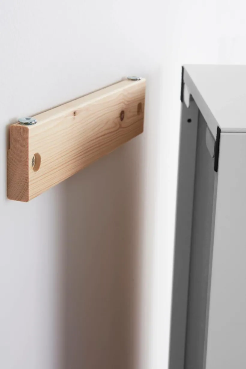 Hyllan har smakfullt fasade kanter framtill och denna hylla har fast hyllplan i mitten, de två andra hyllplanen är flyttbara. Hyllan monteras på väggen i den höjd du önskar det vilket ger ett stilrent och effektfullt resultat. Upphängningslist medföljer, skruvar och plugg ingår ej.