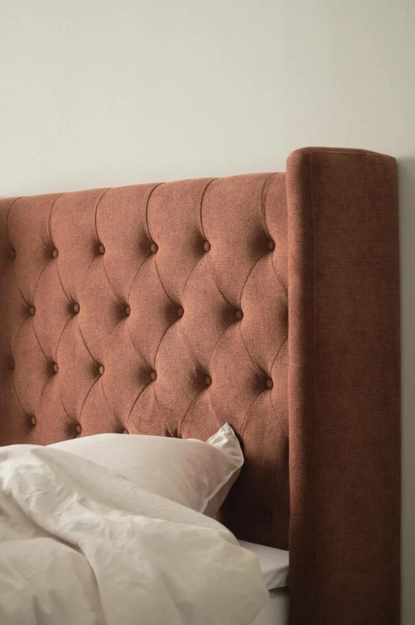 Fristående sänggavel klädd med ett enfärgat tyg som är mjukt och behagligt. Sänggaveln har vingar framåt och de djuphäftade, klädda knapparna ger en lyxig känsla. Stommen är av plywood och massivt trä som vadderats med skumgummifyllning. Väggfäste ingår, en ramp på baksidan gör det enkelt att hänga upp gaveln om du vill det. Du kan också klämma fast sänggaveln mellan sängen och väggen. Viss monterings krävs. Monteringsanvisning medföljer.