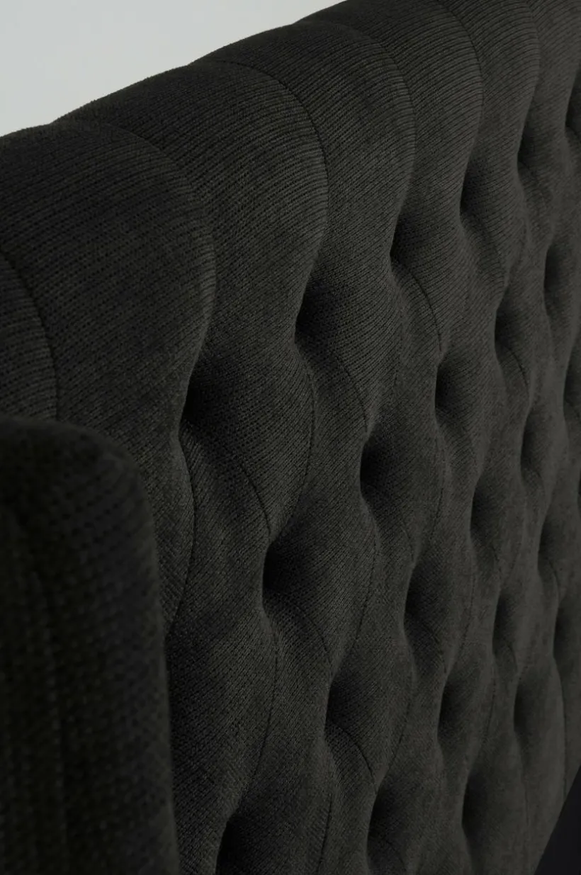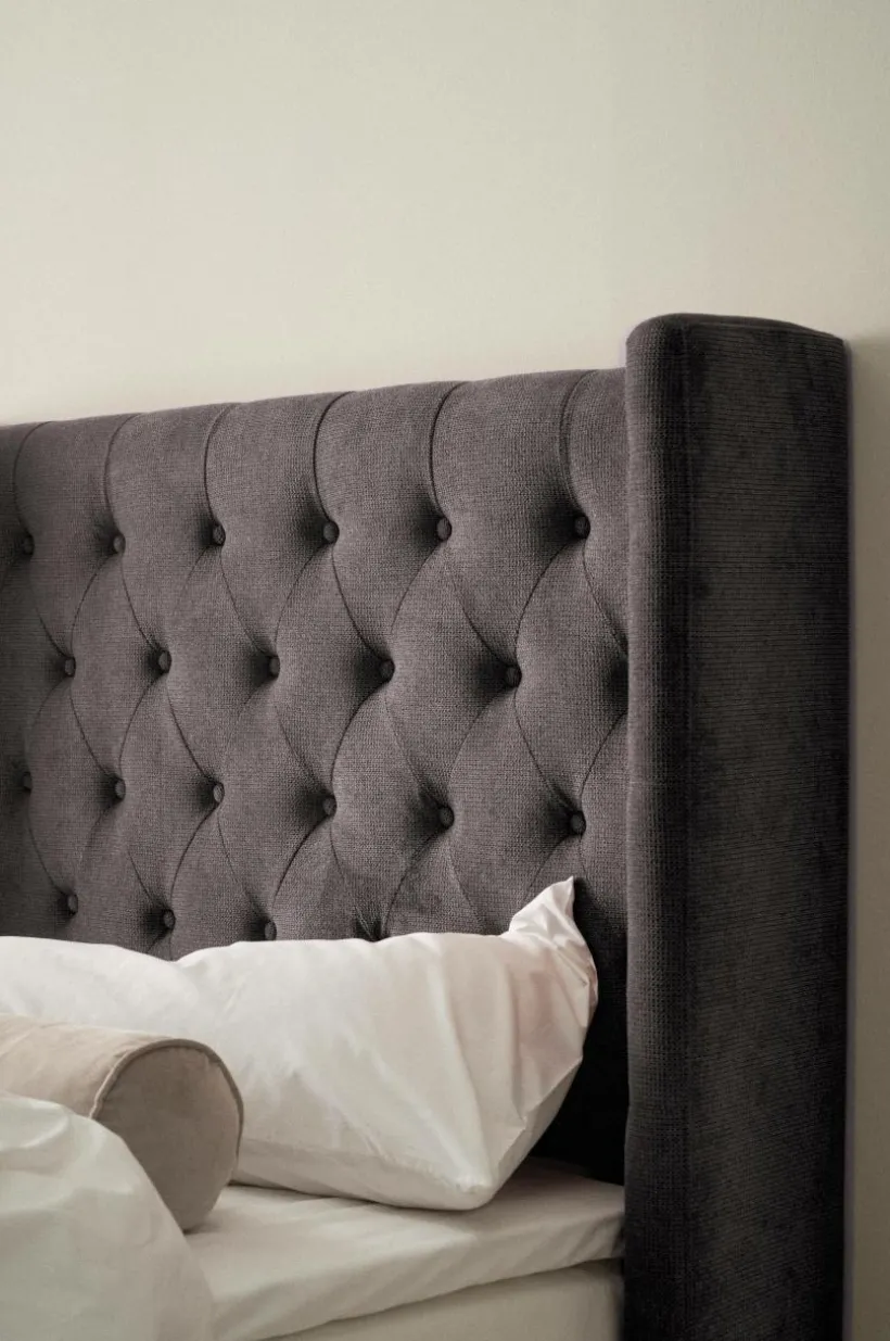 Fristående sänggavel klädd med ett enfärgat tyg som är mjukt och behagligt. Sänggaveln har vingar framåt och de djuphäftade, klädda knapparna ger en lyxig känsla. Stommen är av plywood och massivt trä som vadderats med skumgummifyllning. Väggfäste ingår, en ramp på baksidan gör det enkelt att hänga upp gaveln om du vill det. Du kan också klämma fast sänggaveln mellan sängen och väggen. Viss monterings krävs. Monteringsanvisning medföljer.
