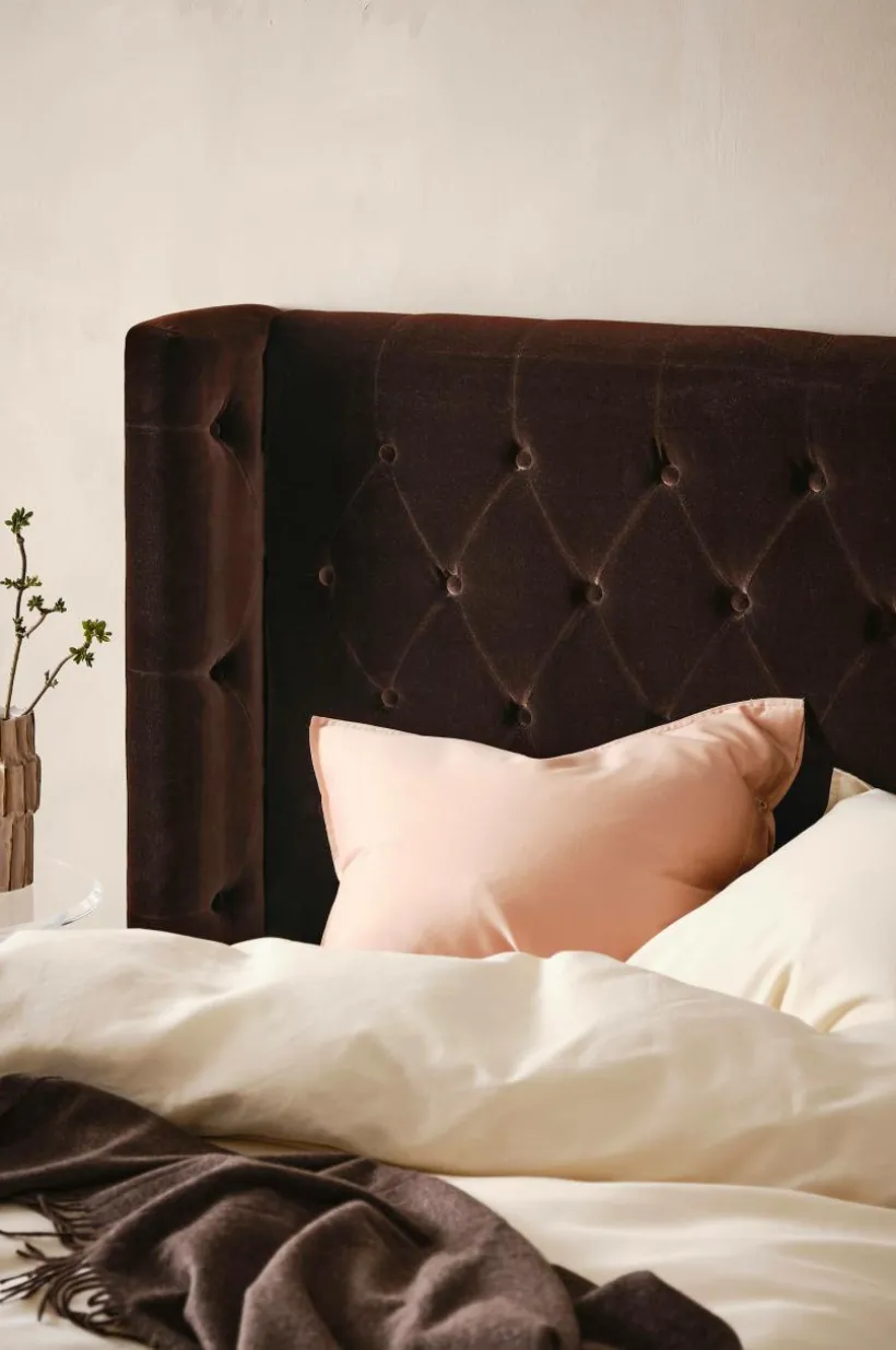 Fristående gavel klädd med sammet och djuphäftade klädda knappar. Går även att hänga upp på väggen. Du skapar en lyxig hotellkänsla hemma med en djuphäftad sänggavel med vingar. Allt i finaste sammet av bomullsmix.