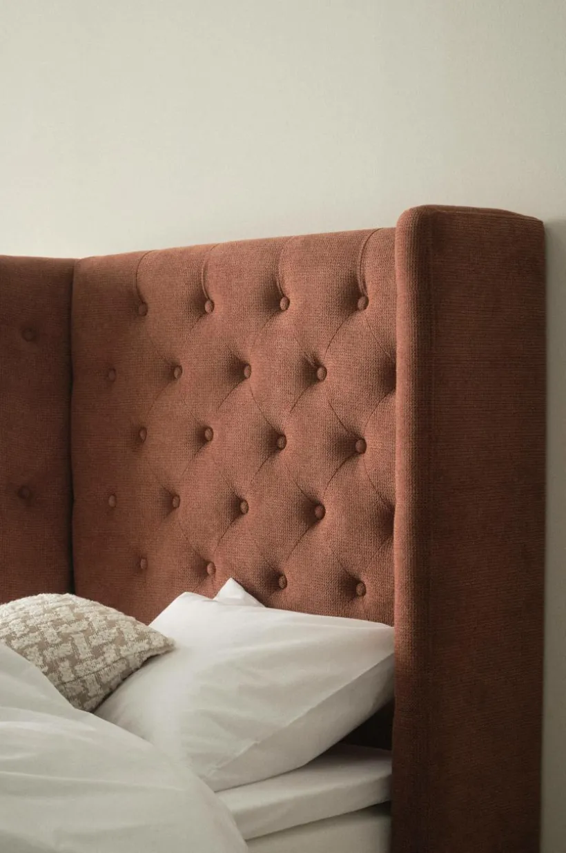 Fristående sänggavel klädd med ett enfärgat tyg som är mjukt och behagligt. Sänggaveln har vingar framåt och de djuphäftade, klädda knapparna ger en lyxig känsla. Stommen är av plywood och massivt trä som vadderats med skumgummifyllning. Väggfäste ingår, en ramp på baksidan gör det enkelt att hänga upp gaveln om du vill det. Du kan också klämma fast sänggaveln mellan sängen och väggen. Viss monterings krävs. Monteringsanvisning medföljer.