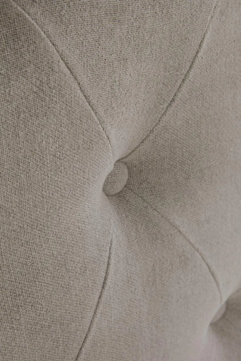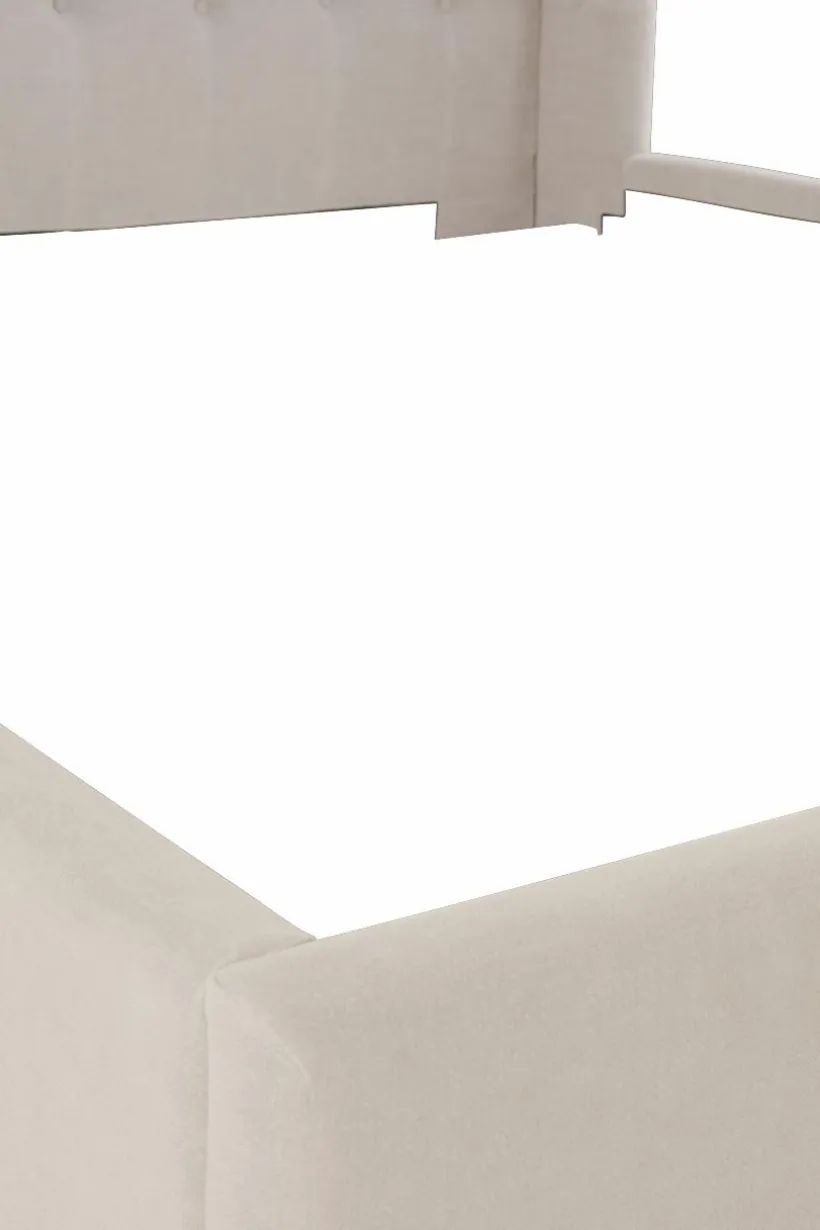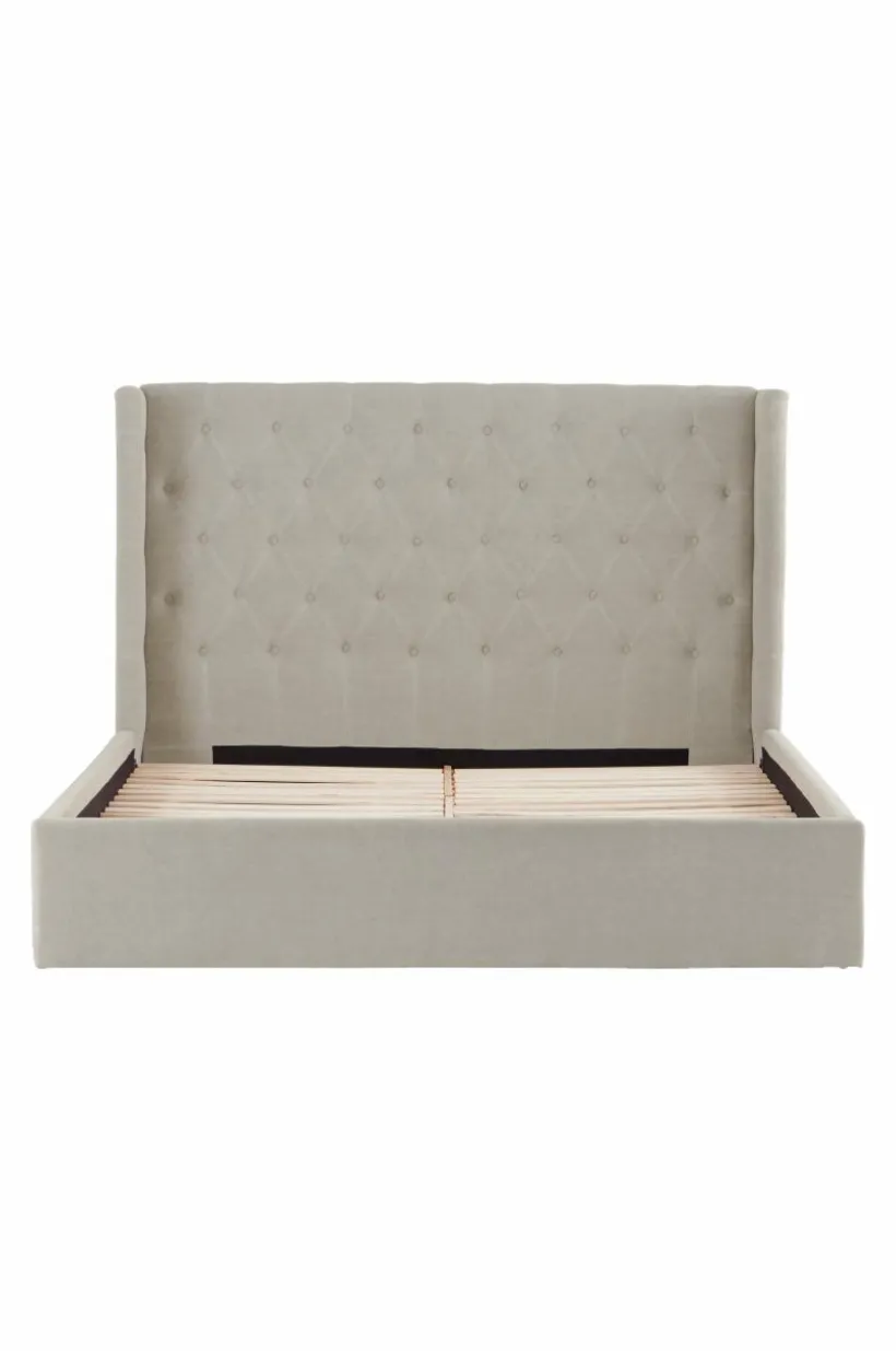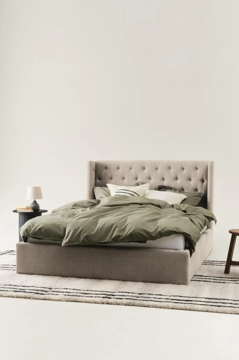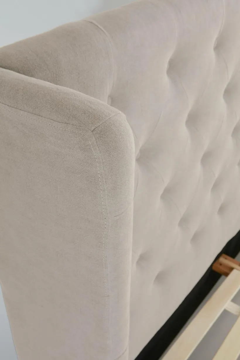Sängram klädd i vackert linnetyg med mjuk vaddering. Huvudgaveln har dekorativa, djuphäftade, klädda knappar och en vinge på vardera sidan skapar mysig inramning. Sidorna och fotgaveln är stilrent släta och ramen runt sängen går nästan ända ned till golvet, bara en liten luftspalt lämnas som gör att luften kan cirkulera under sängen. Sängramen har ribbotten av furu och du kompletterar med madrasser eller resårmadrasser beroende på vilket du föredrar. Madrass/resårmadrass ingår ej.