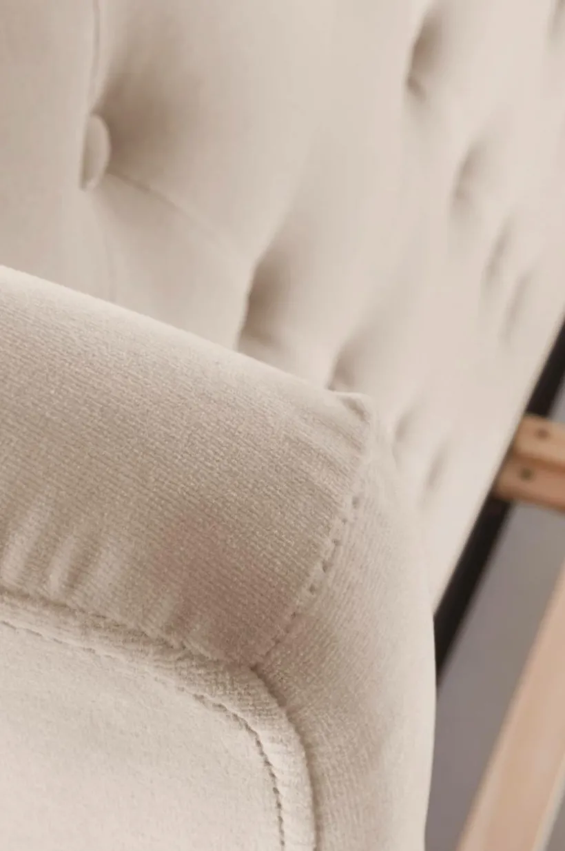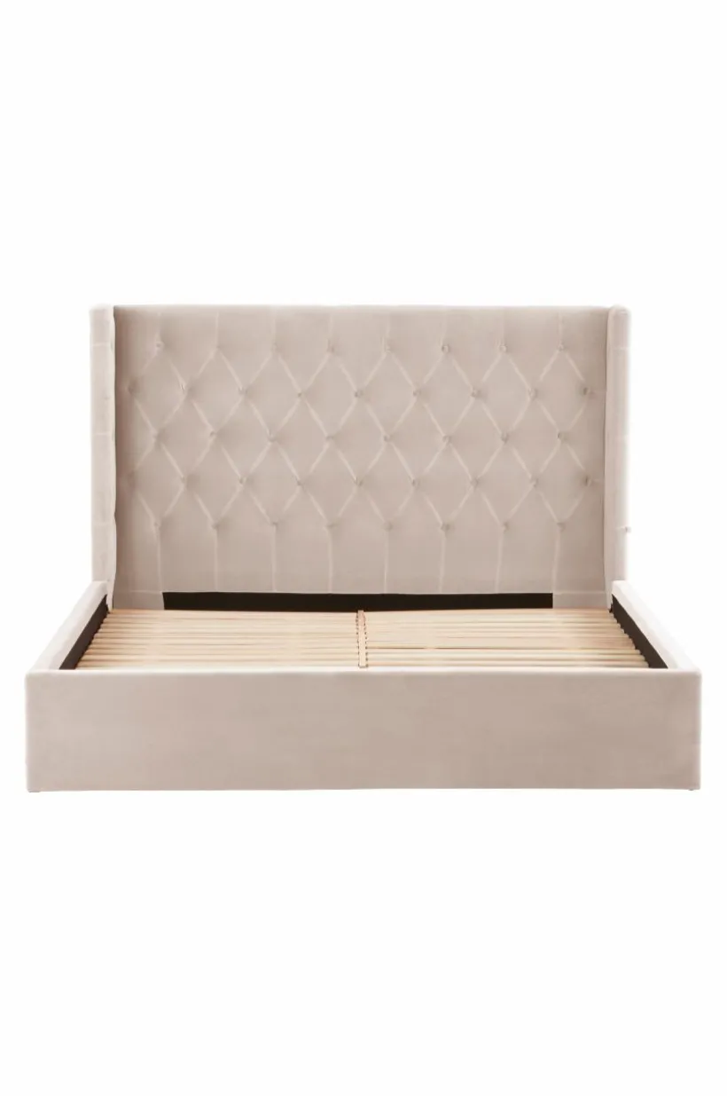Sängram klädd i vackert sammetstyg med mjuk vaddering. Huvudgaveln har dekorativa, djuphäftade, klädda knappar och vinge på vardera sidan skapar mysig inramning. Sidorna och fotgaveln är stilrent släta och ramen runt sängen går nästan ända ned till golvet, bara en liten luftspalt lämnas som gör att luften kan cirkulera under sängen. Sängramen har ribbotten av furu och du kompletterar med madrasser eller resårmadrasser beroende på vilket du föredrar. Madrass/resårmadrass ingår ej.