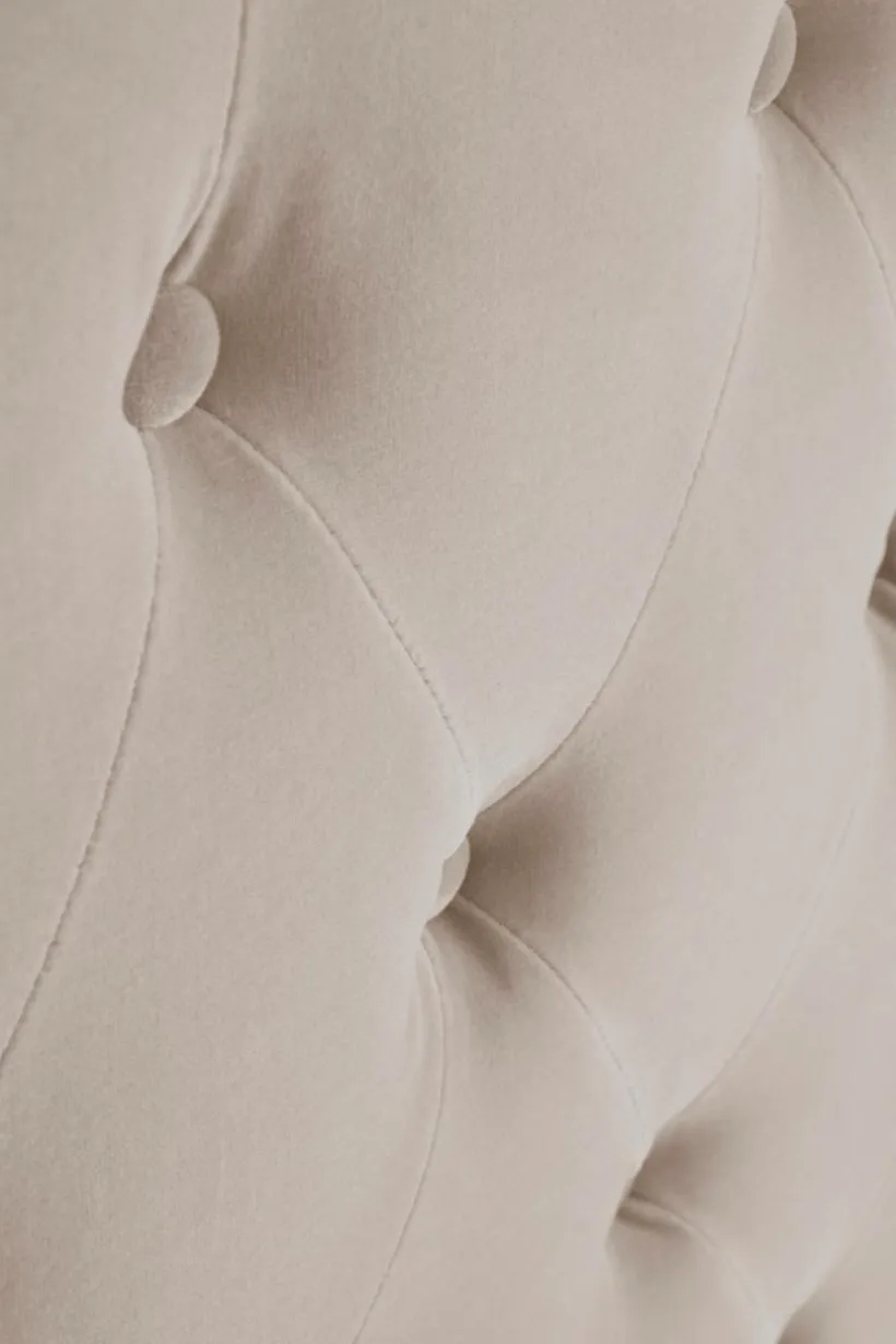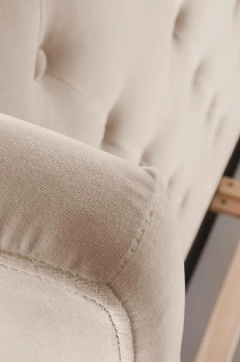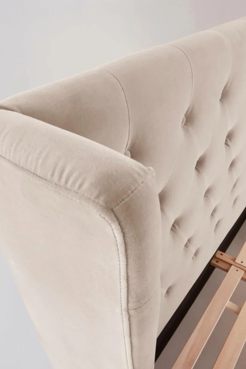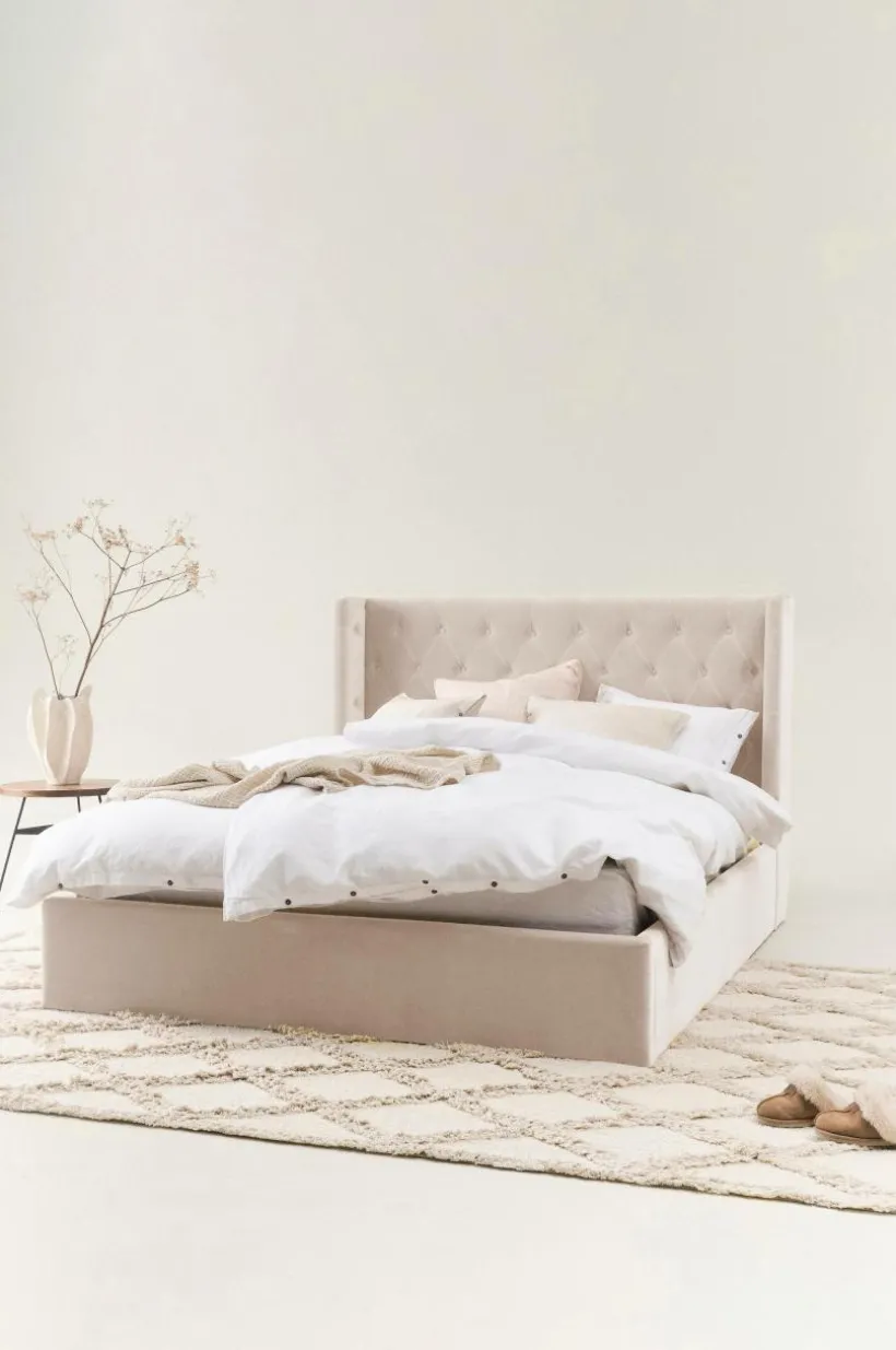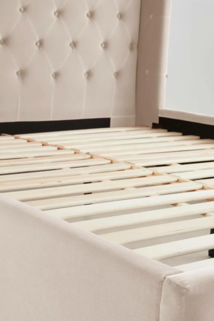 Sängram klädd i vackert sammetstyg med mjuk vaddering. Huvudgaveln har dekorativa, djuphäftade, klädda knappar och vinge på vardera sidan skapar mysig inramning. Sidorna och fotgaveln är stilrent släta och ramen runt sängen går nästan ända ned till golvet, bara en liten luftspalt lämnas som gör att luften kan cirkulera under sängen. Sängramen har ribbotten av furu och du kompletterar med madrasser eller resårmadrasser beroende på vilket du föredrar. Madrass/resårmadrass ingår ej.