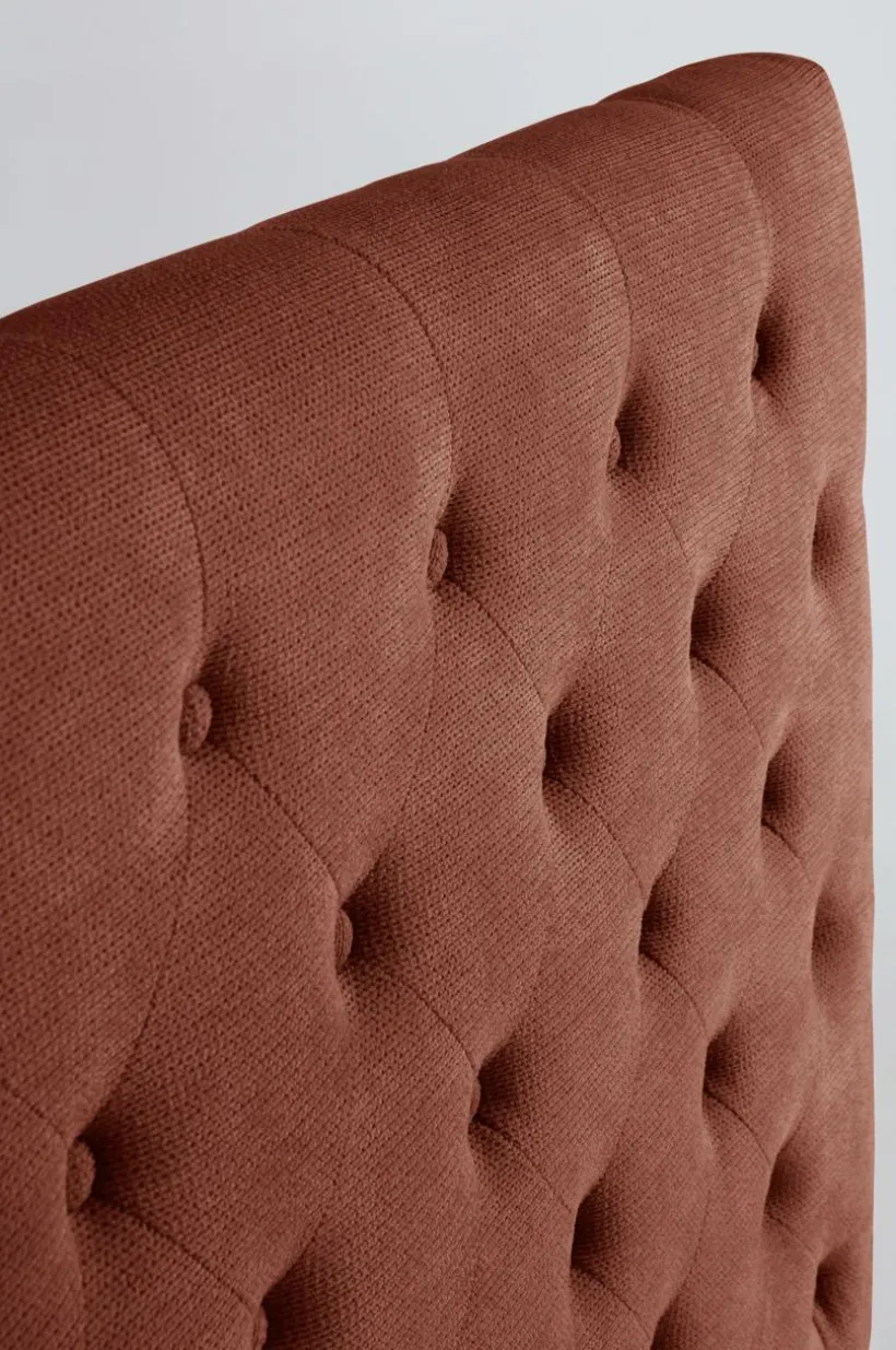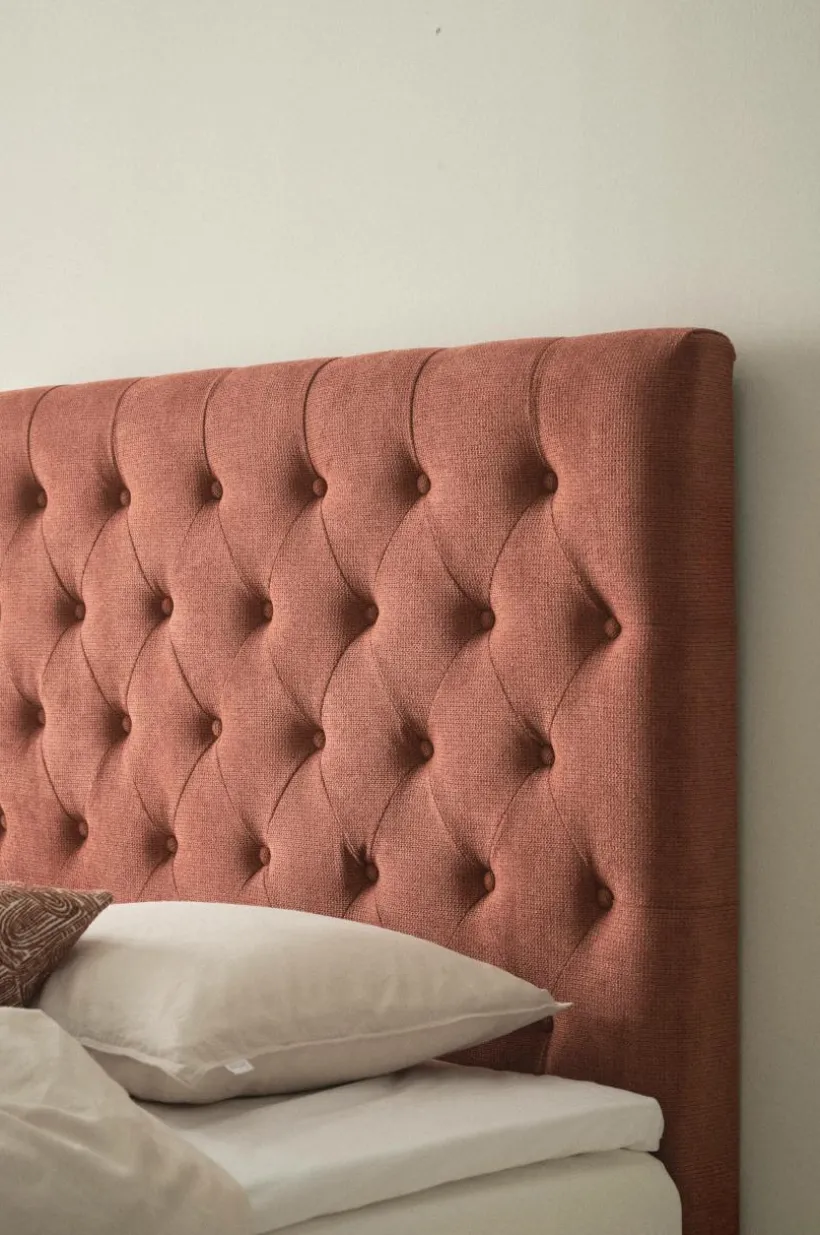 Fristående sänggavel klädd med ett enfärgat tyg som är mjukt och behagligt. De djuphäftade, klädda knapparna ger en lyxig känsla. Stommen är av plywood och massivt trä som vadderats med skumgummifyllning. Väggfäste ingår, en ramp på baksidan gör det enkelt att hänga upp gaveln om du vill det. Du kan också klämma fast sänggaveln mellan sängen och väggen. Viss monterings krävs. Monteringsanvisning medföljer.