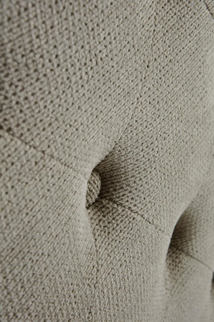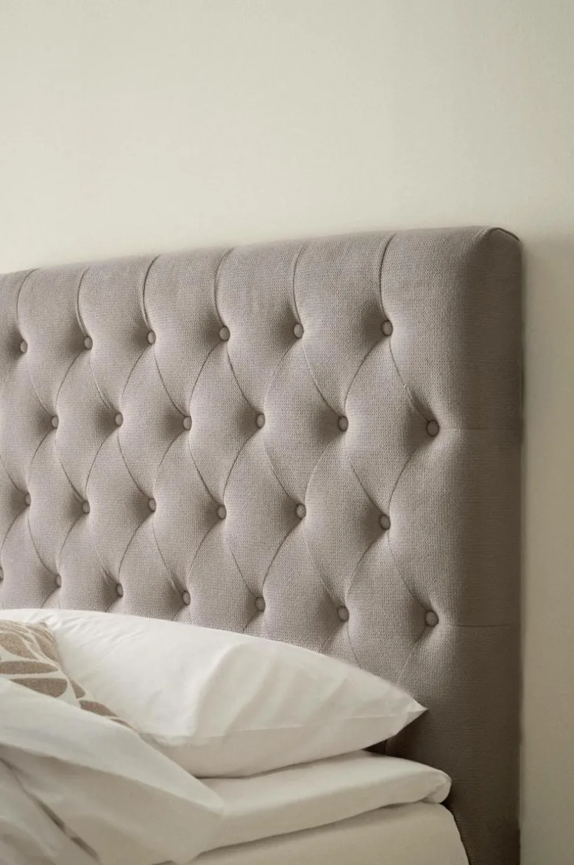 Fristående sänggavel klädd med ett enfärgat tyg som är mjukt och behagligt. De djuphäftade, klädda knapparna ger en lyxig känsla. Stommen är av plywood och massivt trä som vadderats med skumgummifyllning. Väggfäste ingår, en ramp på baksidan gör det enkelt att hänga upp gaveln om du vill det. Du kan också klämma fast sänggaveln mellan sängen och väggen. Viss monterings krävs. Monteringsanvisning medföljer.