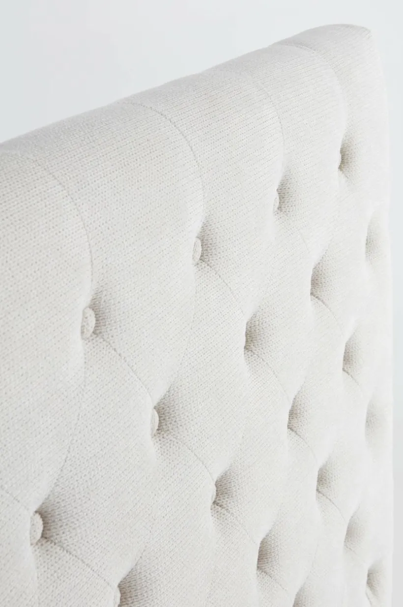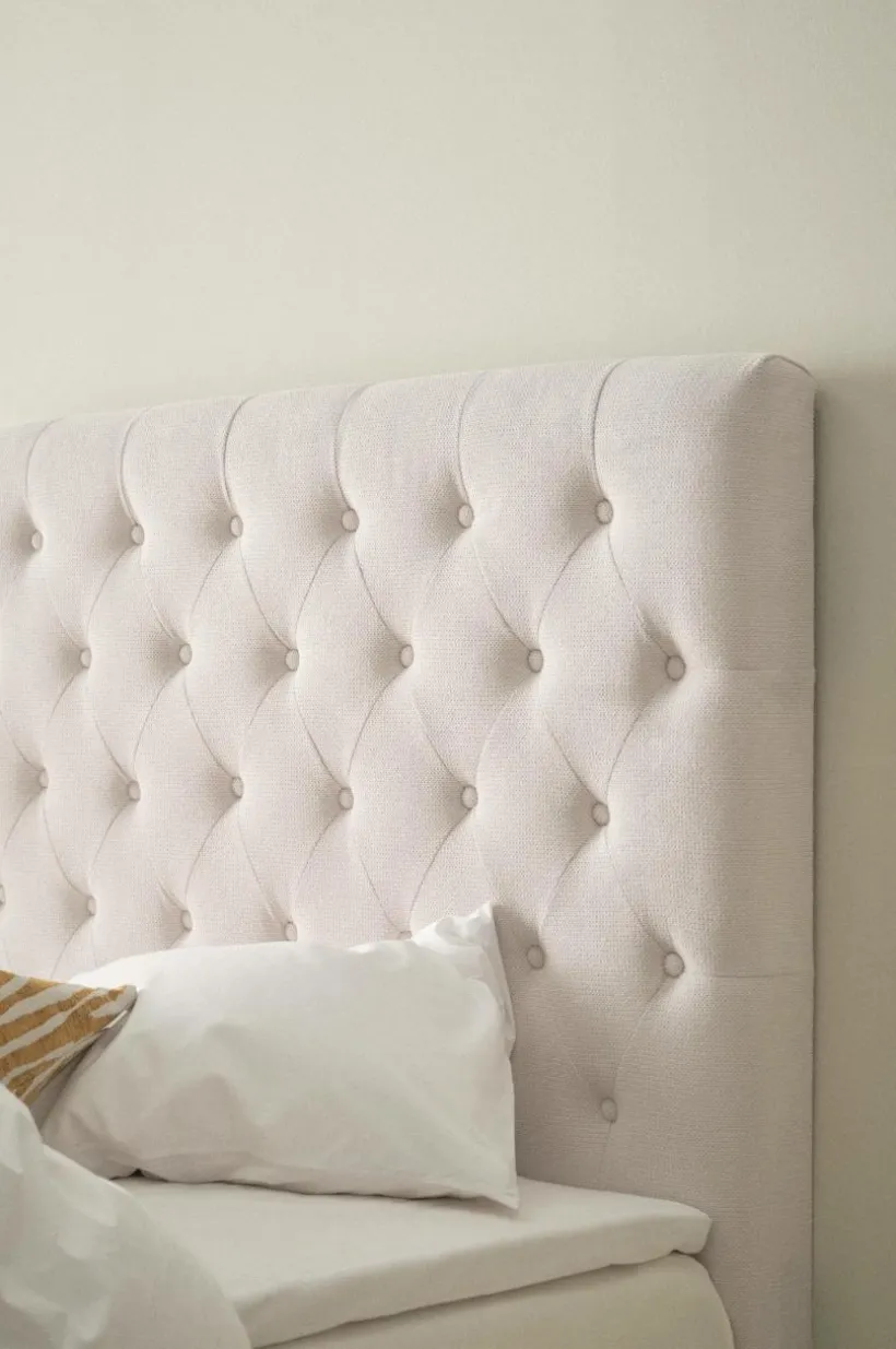 Fristående sänggavel klädd med ett enfärgat tyg som är mjukt och behagligt. De djuphäftade, klädda knapparna ger en lyxig känsla. Stommen är av plywood och massivt trä som vadderats med skumgummifyllning. Väggfäste ingår, en ramp på baksidan gör det enkelt att hänga upp gaveln om du vill det. Du kan också klämma fast sänggaveln mellan sängen och väggen. Viss monterings krävs. Monteringsanvisning medföljer.