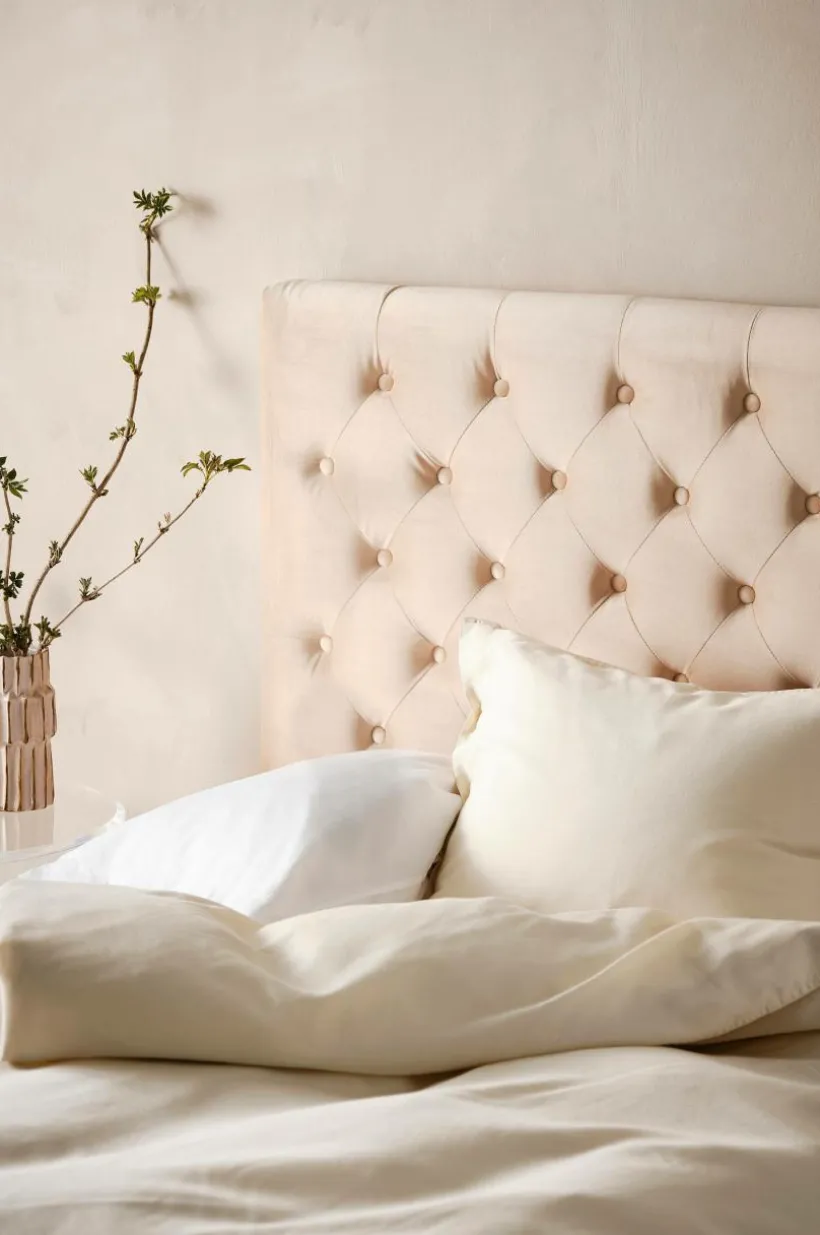 Fristående gavel klädd med sammet och djuphäftade klädda knappar. Skapa en personlig stil och lyxig känsla i sovrummet med en gedigen sänggavel i mjuk sammet. Tygets slitstyrka är på 28000 Martindale. Väggfästen medföljer.