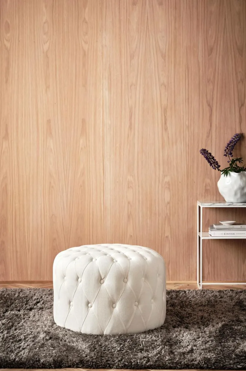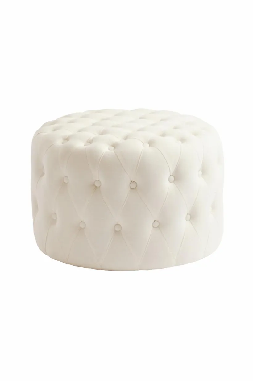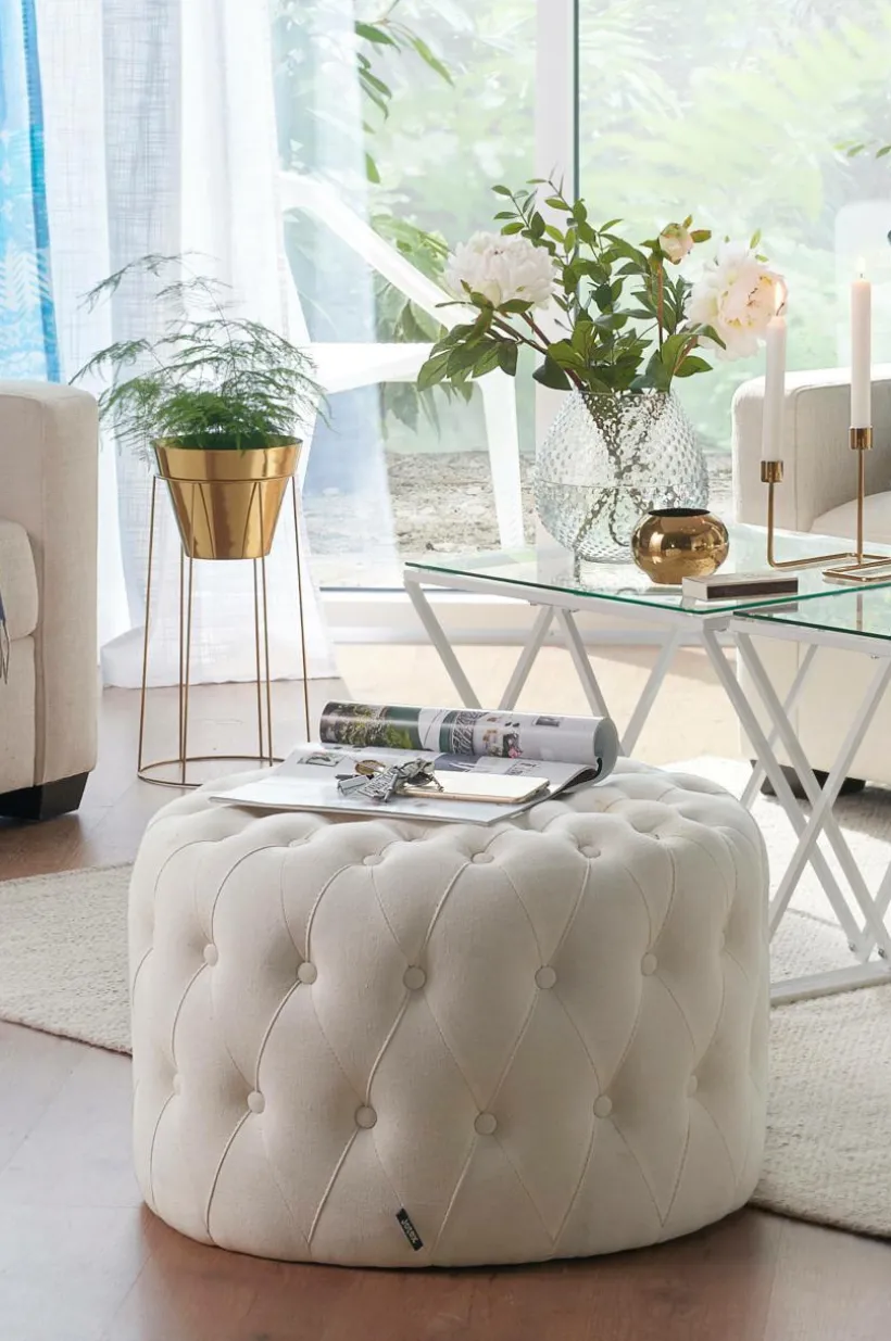 Sittpuff med djuphäftade och klädda knappar. Kombinationen zickzackfjädrar, resårkärna och skumgummifyllningen maximerar sittkomforten. En sittpuff kan vara en värdefull sittplats om gästerna blir många.