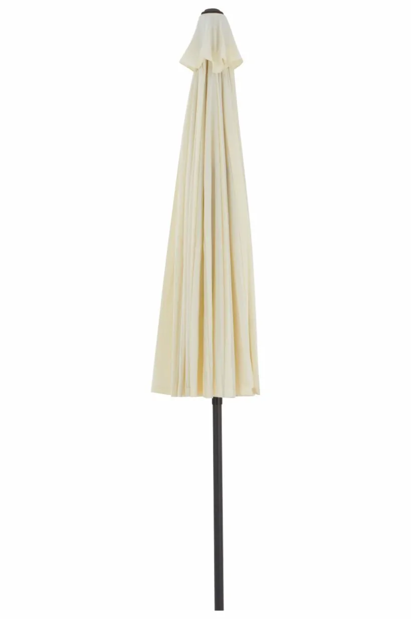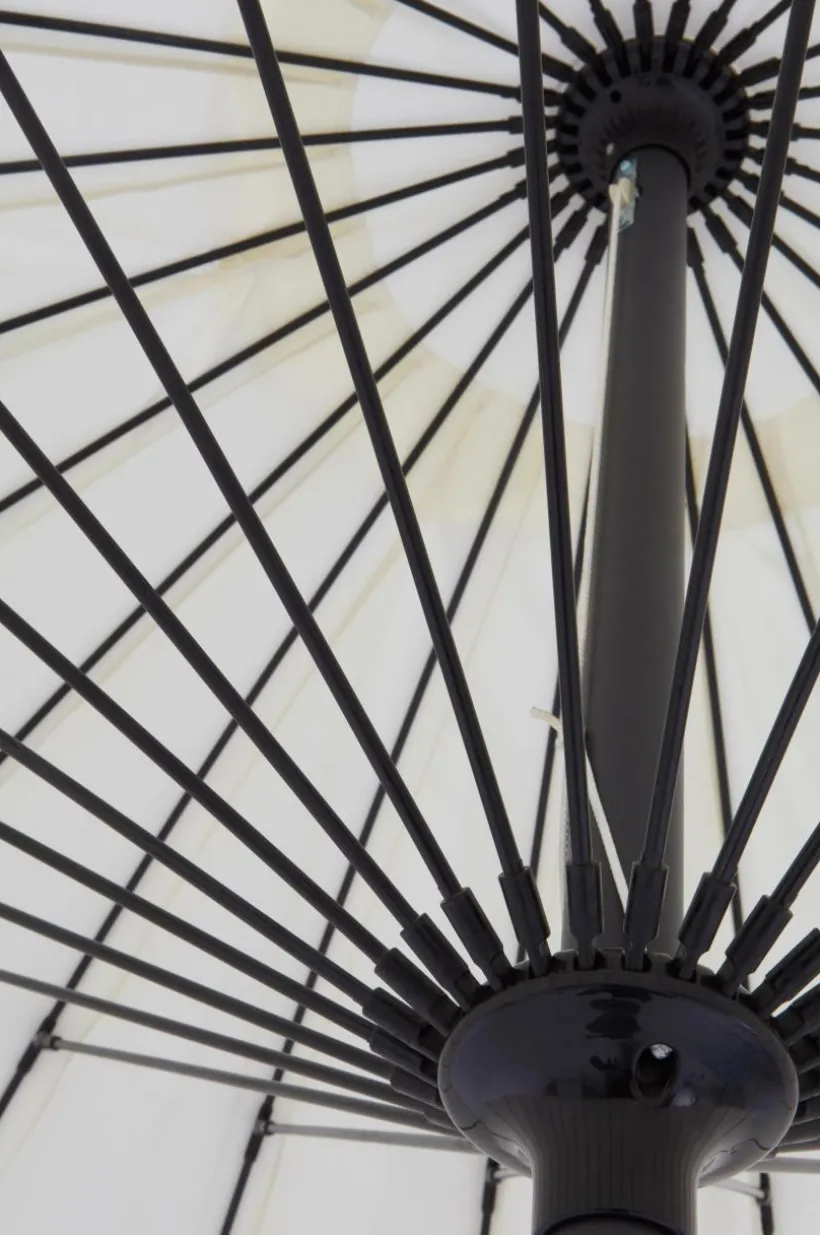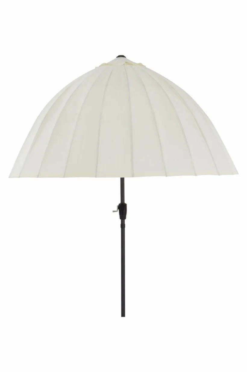 Parasoll i en härligt rundad form som är mycket dekorativ och som ger härligt solskydd. Parasollet har tåligt tyg i polyester. Den tvådelade stången är av aluminium medan de 24 ribborna under parasollet är av glasfiber. Klassisk låsanordning gör parasollet enkelt att fälla upp och ned. Höjden kan justeras. Den spetsiga nederdelen på stången gör att du kan ta med parasollet till stranden en vindstilla dag och sticka ner det i sanden för härligt solskydd. Parasollfot ingår ej. Parasollet ska inte vara uppfällt i stark vind och regnväder.
