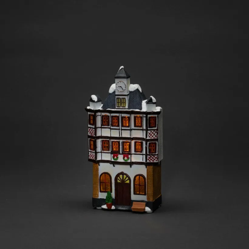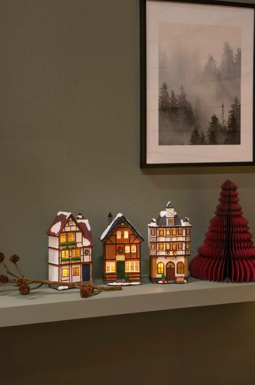 3 små separata hus med 6 varmvita led. Drivs antingen med 6 st aaa batterier (ingår ej) eller usb. Juldekorationen har en timerfunktion på 6 timmar. 3×1,8 meter usb kabel medföljer. Höjd 20,5-23,5 cm, bredd 12-13 cm djup 7-7,5 cm.