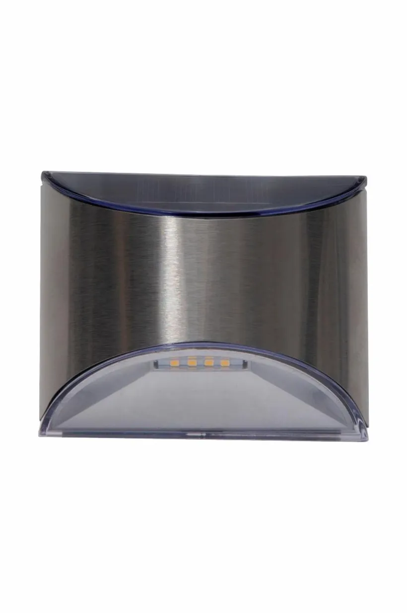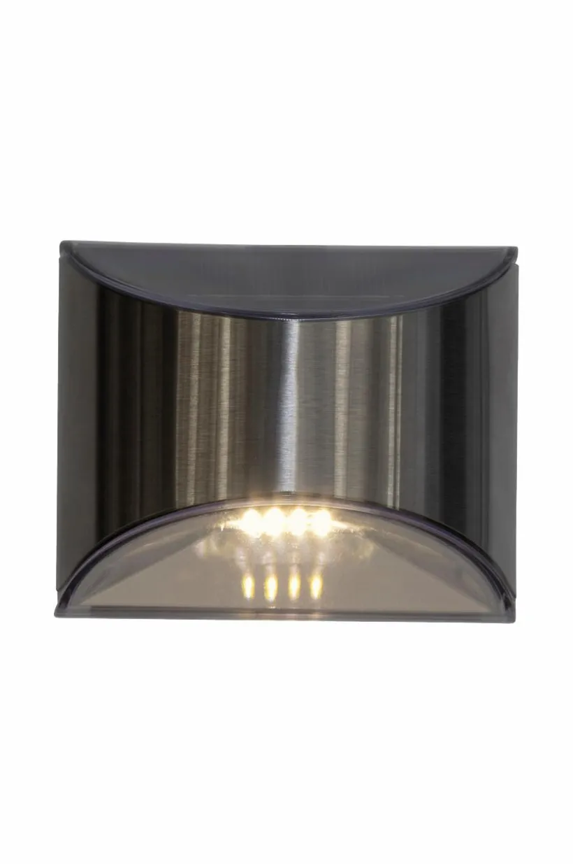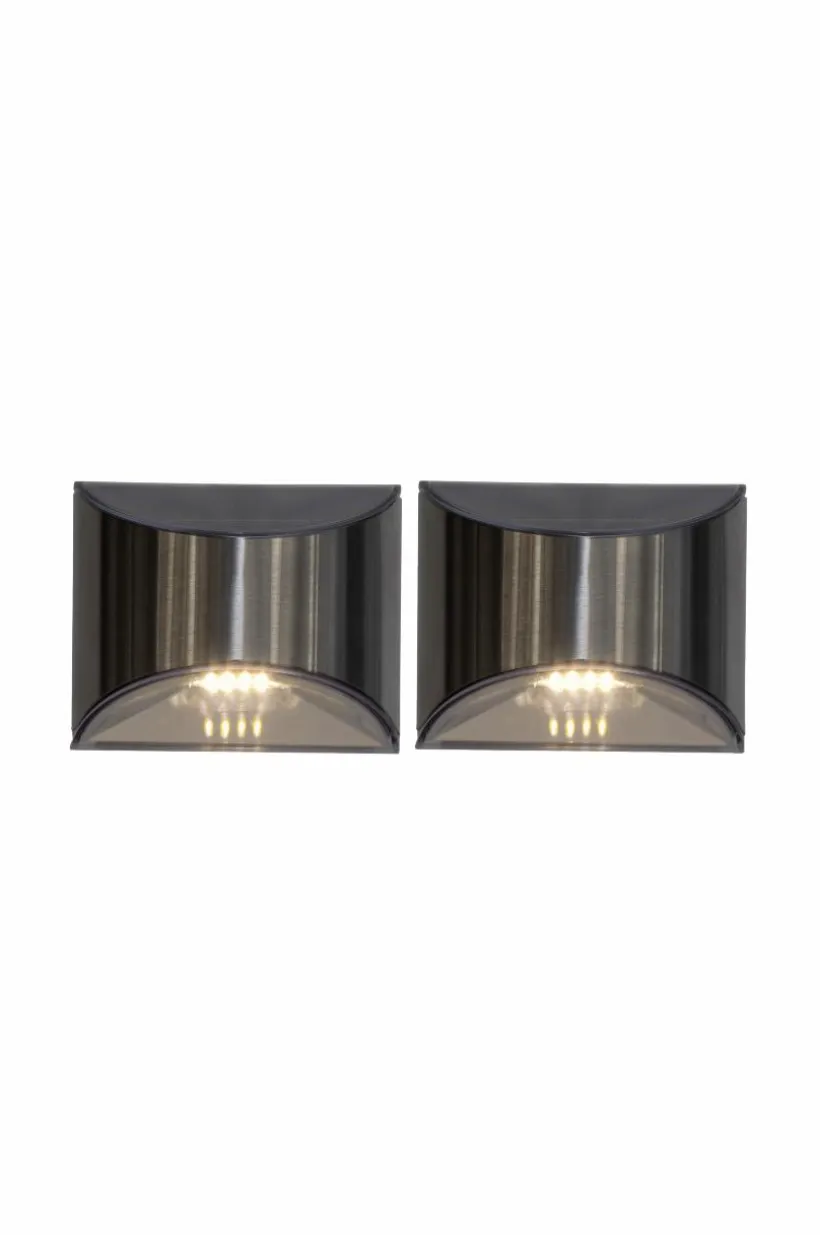Solcellsdriven väggbelysning som under natten lyser med 10 Lumen. Säljs i 2 pack. Höjd 8 cm, bredd 10 cm och djup 5 cm. Ledljuskälla (4 st per lampa) ingår samt 2 batterier till till ljusrelät. Varmvitt sken.