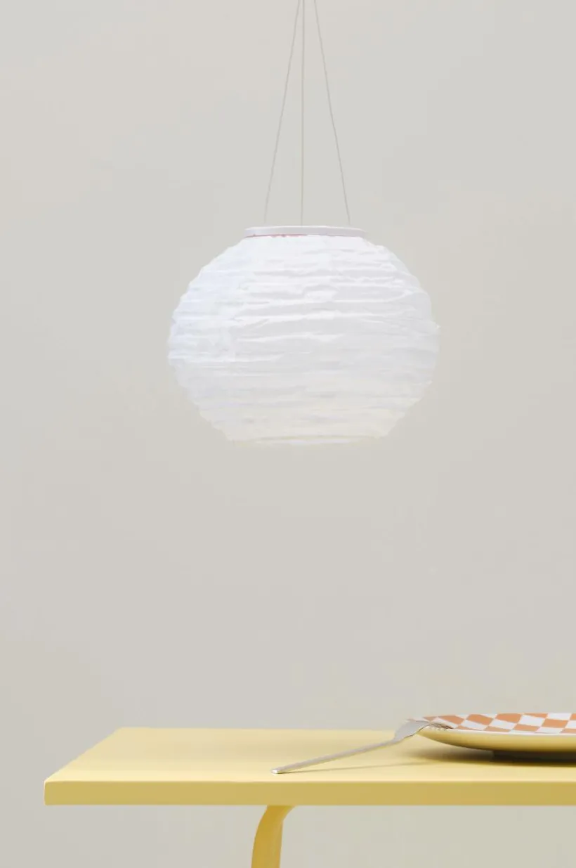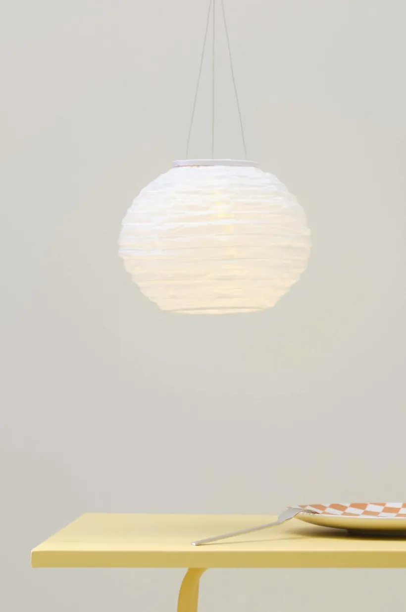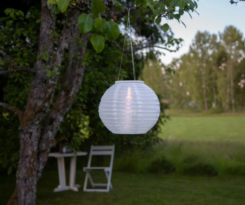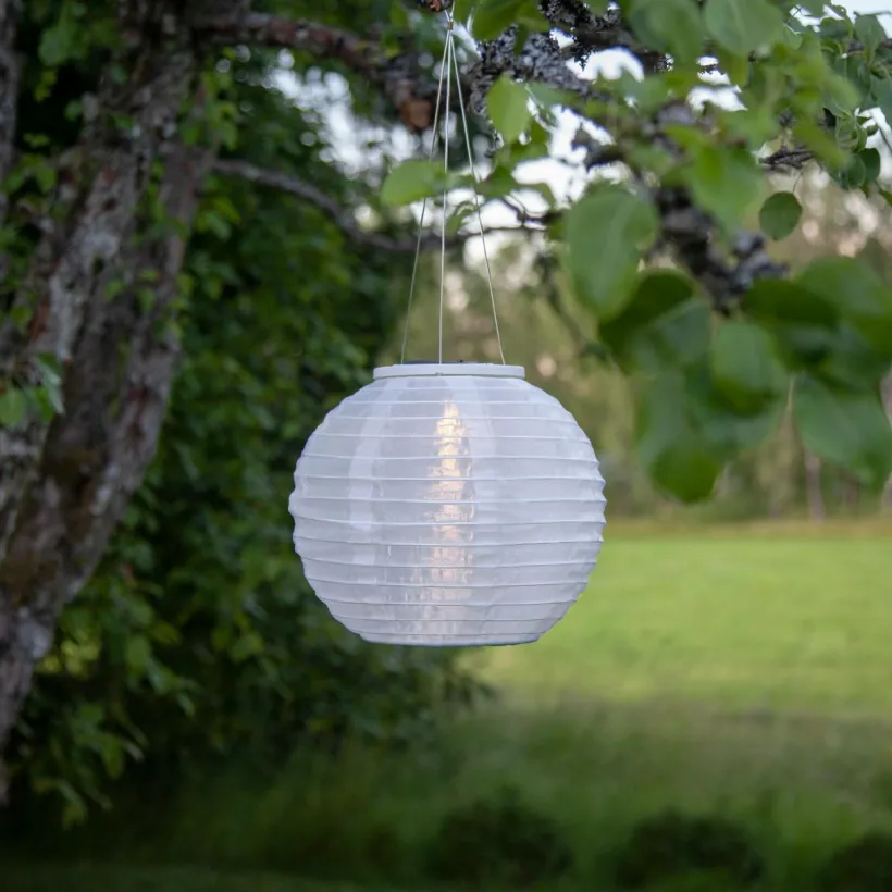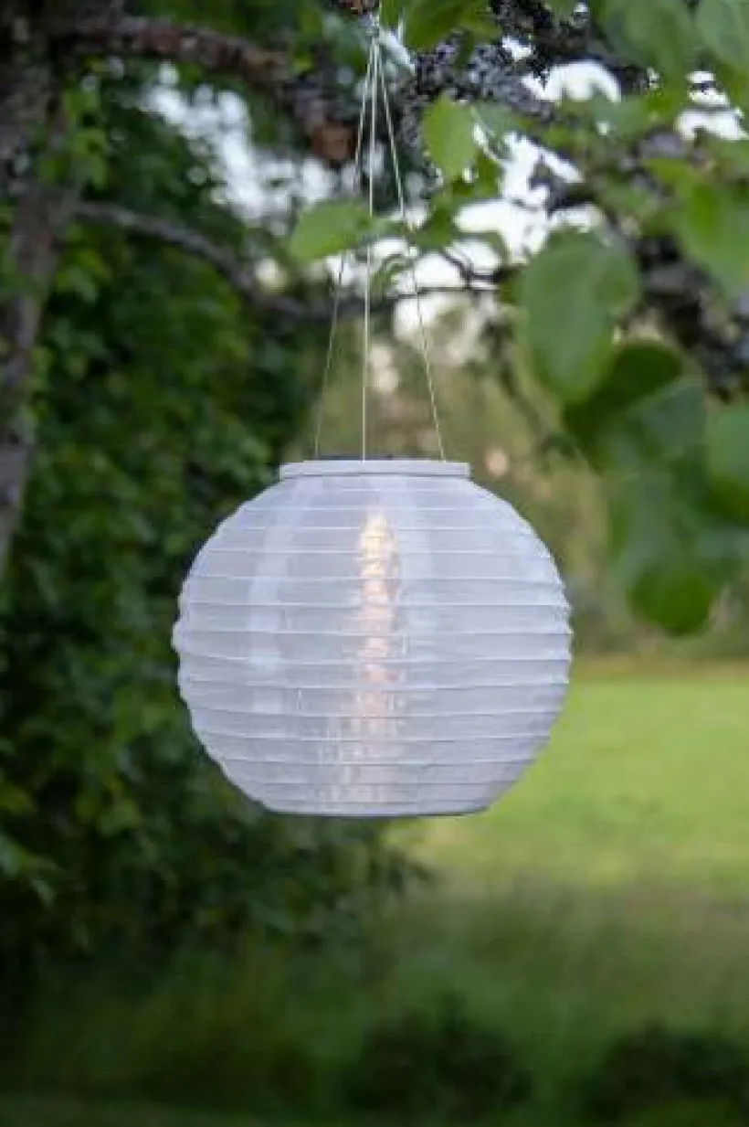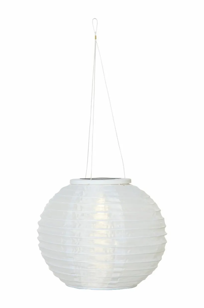 Solcellsdriven risbollslykta i vit polyester. 25cm i diameter och cirka 20cm i höjd. Denna solcellsdekoration är fin att dekorera med i trädgården eller på en balkong. Placera belysningen där solen kan nå panelen under dagen för att få ultimat laddning till det medföljande batteriet.
