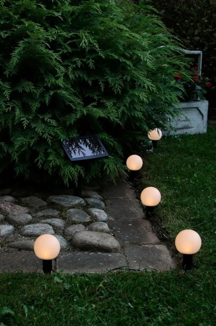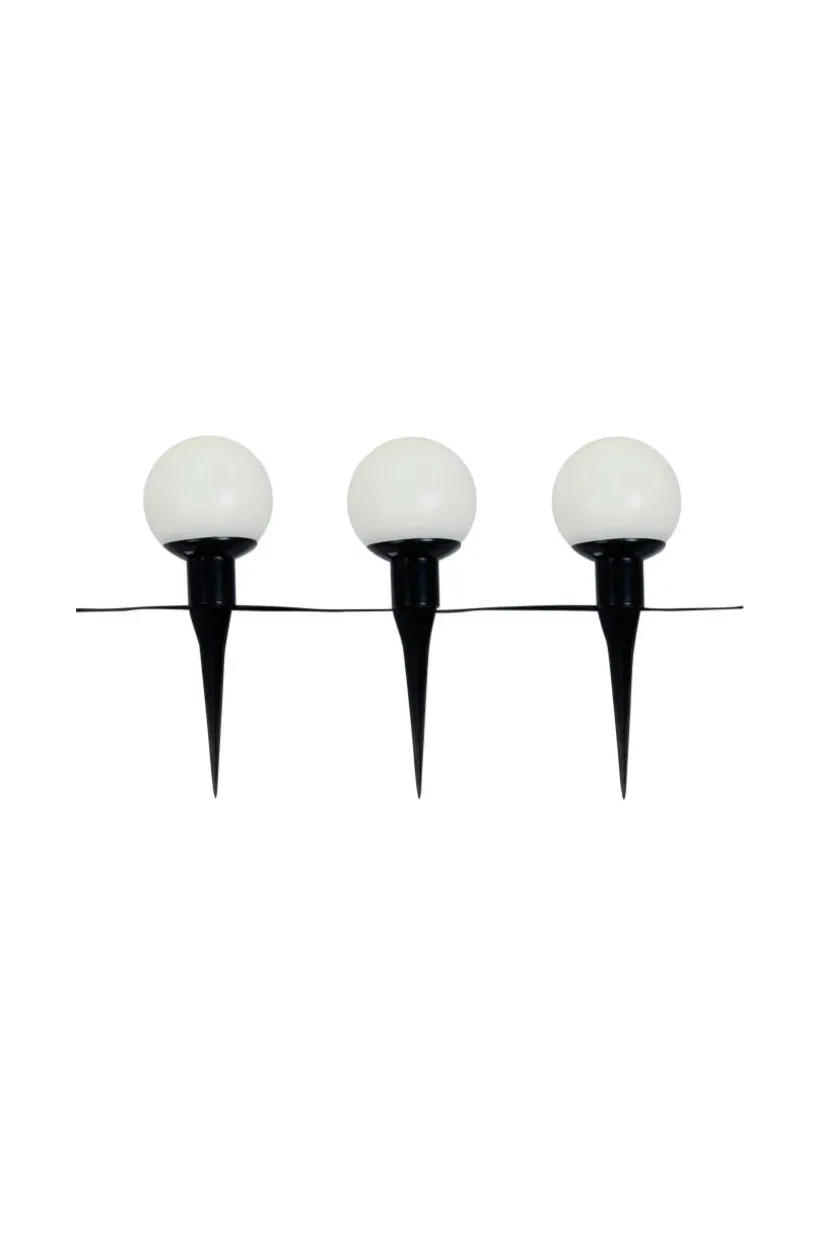 Solcellsbollar i plast. LED. Går att ha både som slinga och trädgårdsspett. Mått: Längd 700 cm. Djup 8 cm. Höjd 8/22 cm. Batteri ingår.