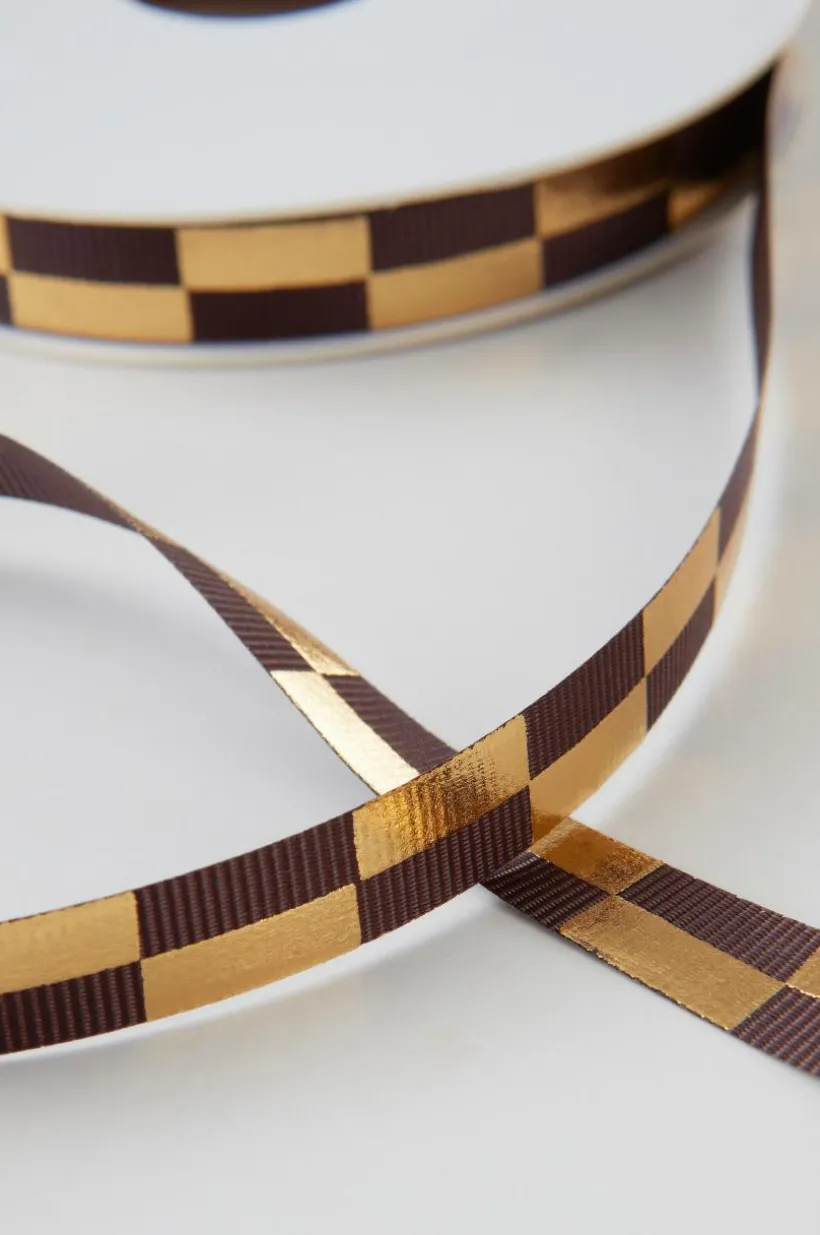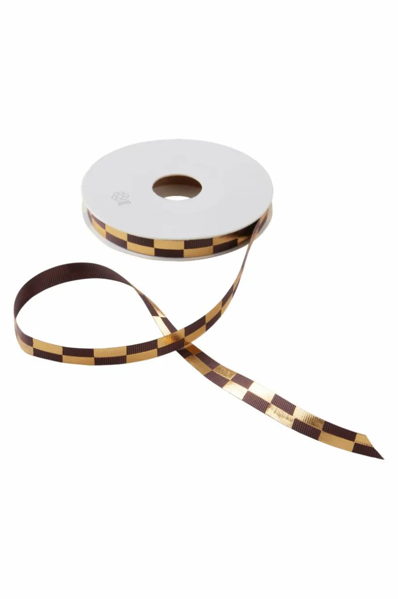 Rutigt dekorationsband av glansig satin. Bandet kan göra dina presenter och julklappar extra fina.