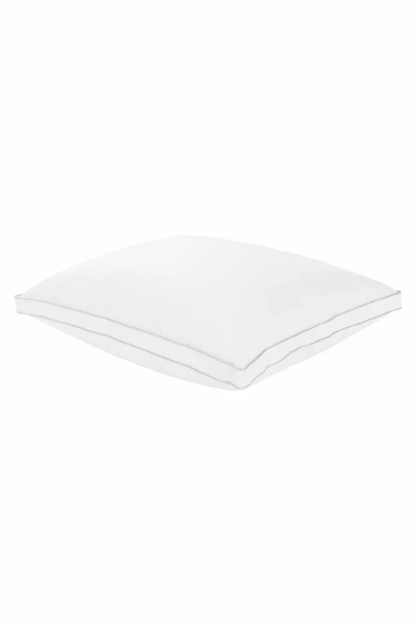 Det vita yttertyget är av tät bomull som inte läcker dun och har två silvergrå passpoalkanter runt om. Dunkudden levereras i en tygväska av bomull. .