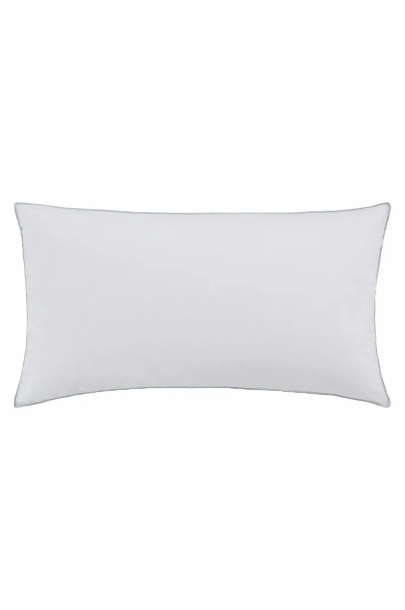 Det vita yttertyget är av tät bomull som inte läcker dun och har två silvergrå passpoalkanter runt om. Dunkudden levereras i en tygväska av bomull. .
