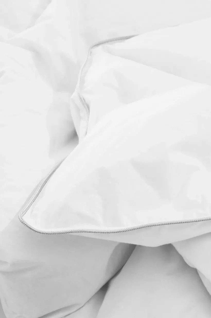 Det vita yttertyget är av tät bomull som inte läcker dun och har silvergrå passpoalkant runt om. Duntäcket levereras i en tygväska av bomull. .