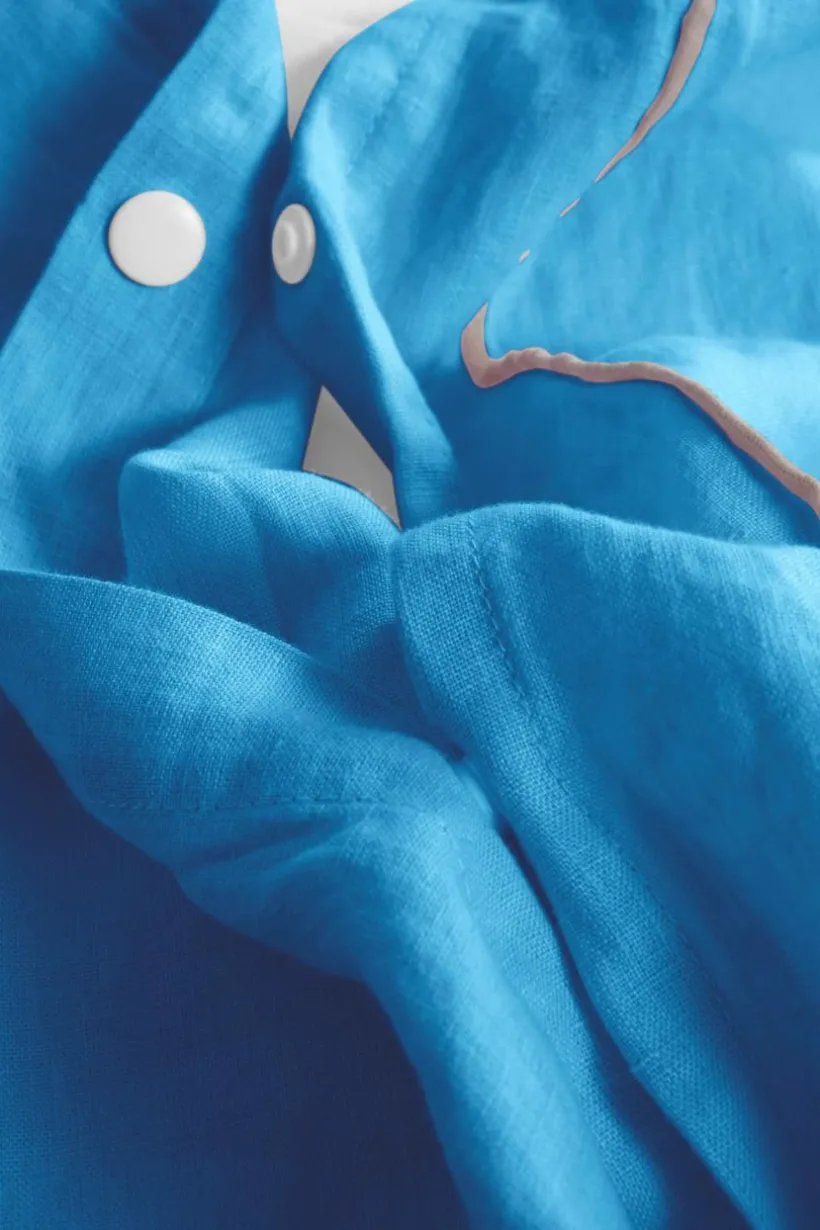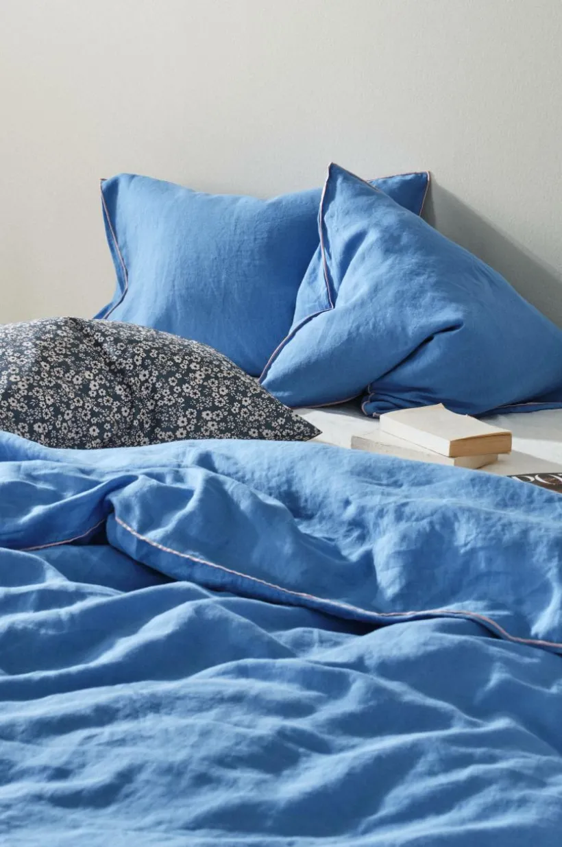 Påslakanset i tre delar med ett extra brett påslakan och två örngott av lin, som tvättas för en extra mjuk känsla. STICH står för schyssta sängkläder i ett tidlöst material. Linnetyget är enfärgat och den snygga overlocksömmen runt om är kontrastfärgad i en pigg färg. Lin är ett fint naturmaterial med speciella egenskaper och härlig känsla. Linne värmer när det är kallt och är svalt att sova i när det är varmt. När linet tvättas får det ännu mjukare struktur som är behaglig mot huden. Öppning i övre hörnen på påslakanet, som underlättar att trä påslakanet över täcket. Knappar för tillslutning i påslakanet. Trådtäthet på 104 tc. (Trådtätheten talar om antalet trådar, thread counts, per kvadrattum i ett tyg. Ju högre trådtäthet desto högre kvalité. Med undantag för linne som ofta vävs glesare för att få den rätta känslan.)
