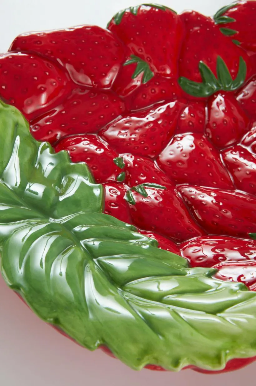 Somrigt serveringsfat av dolomitporslin med blank och färgstark glasyr. Fatet har formen av en läskande jordgubbe och det du vill servera får läcker inramning.