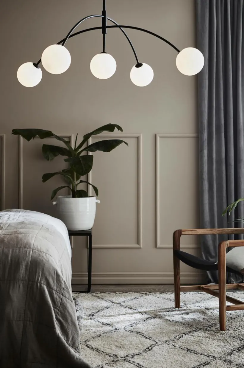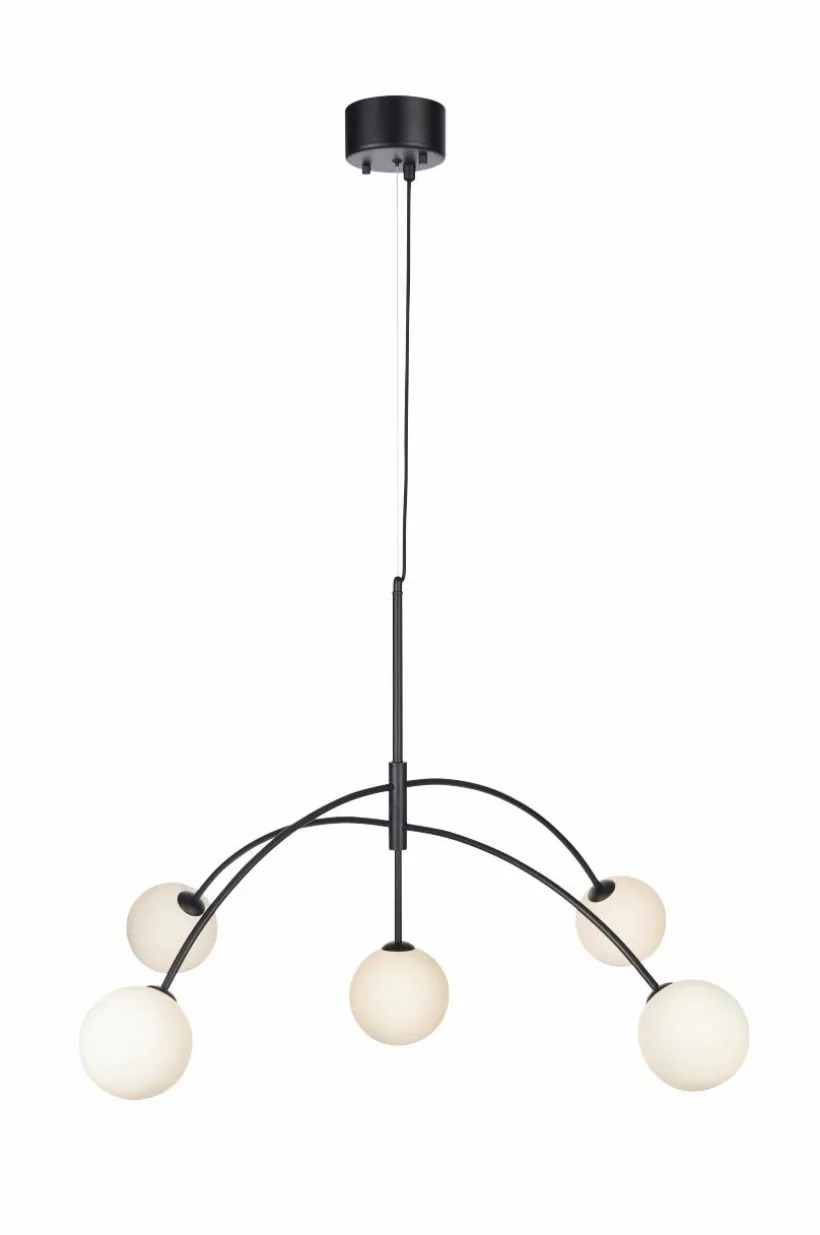 Taklampa med bas i metall och fem skärmar i vitt glas som ger en fantatisk ljusspridning i rummet.