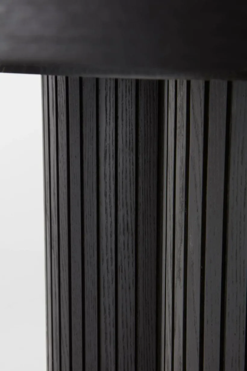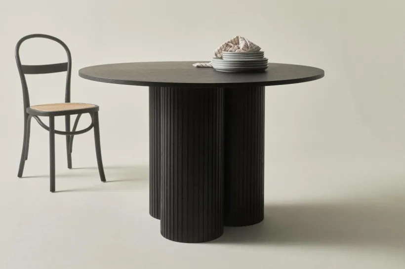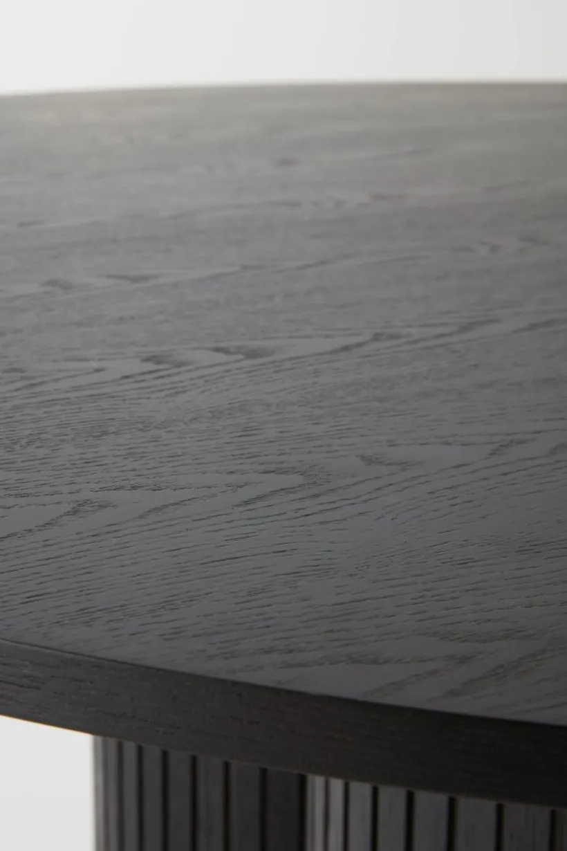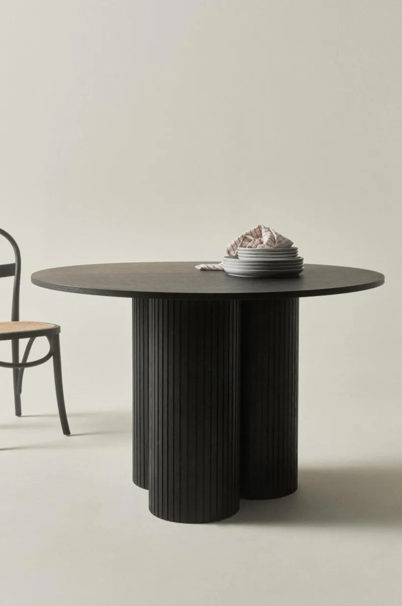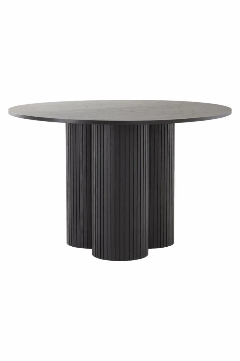 Runt matbord av FSC-certifierad MDF som fått faner med målad finish. Bordet är ett modernt pelarbord med kraftig fot i mitten. Foten består av tre runda pelare med vertikal randstruktur. Viss montering krävs. Monteringsanvisning medföljer.