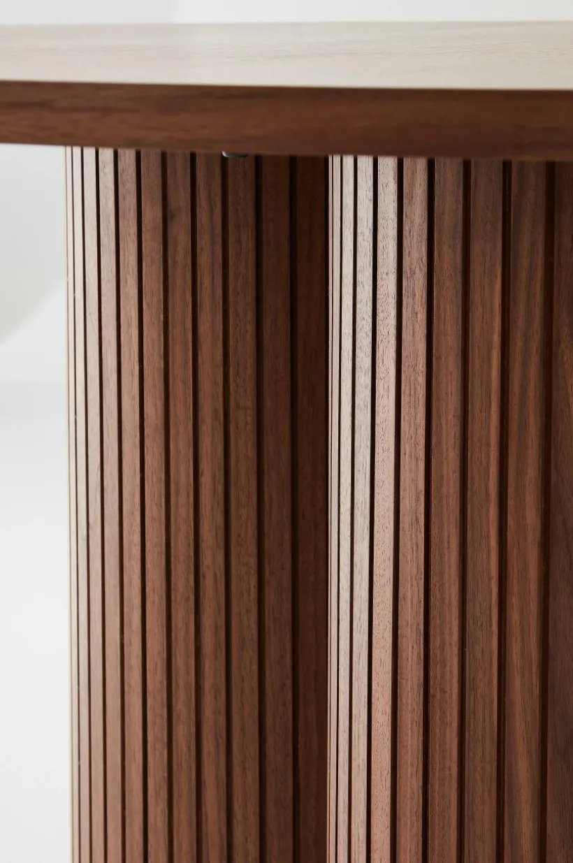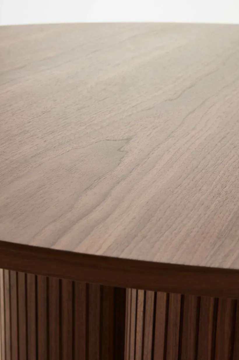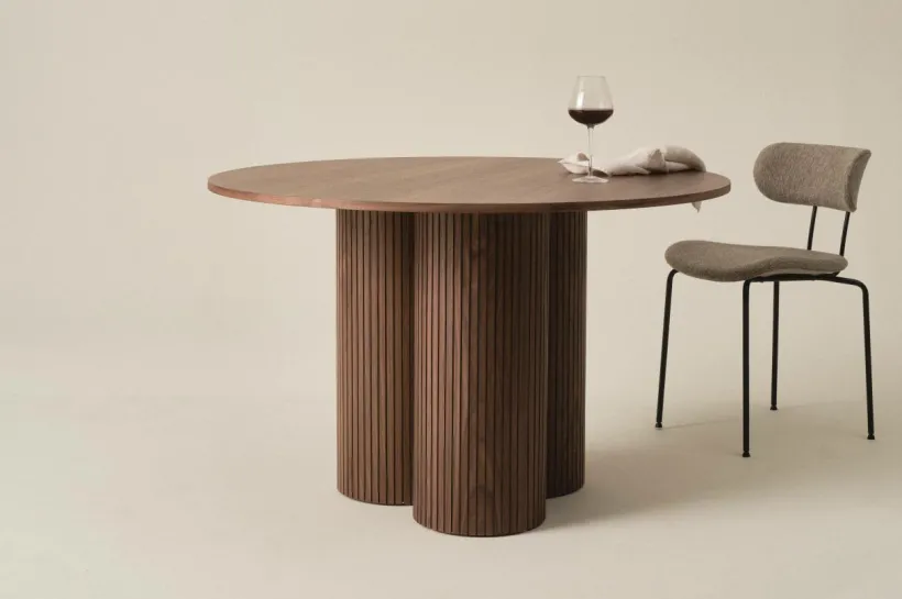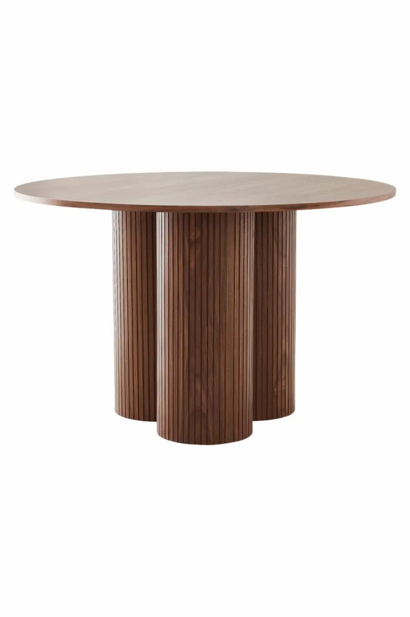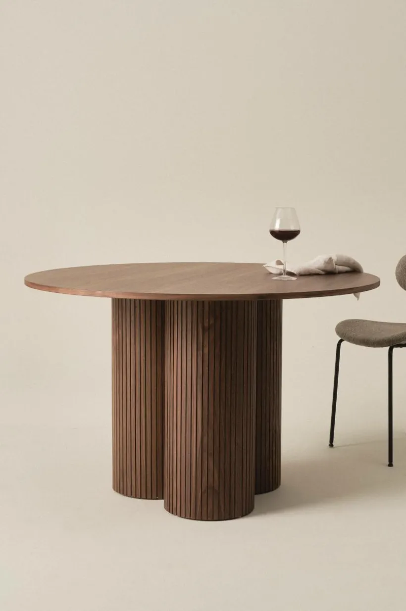 Runt matbord av FSC-certifierad MDF som fått faner med målad finish. Bordet är ett modernt pelarbord med kraftig fot i mitten. Foten består av tre runda pelare med vertikal randstruktur. Viss montering krävs. Monteringsanvisning medföljer.
