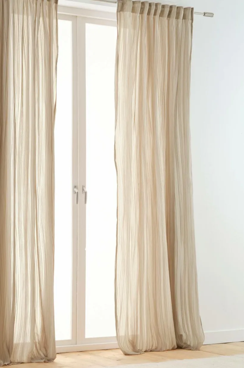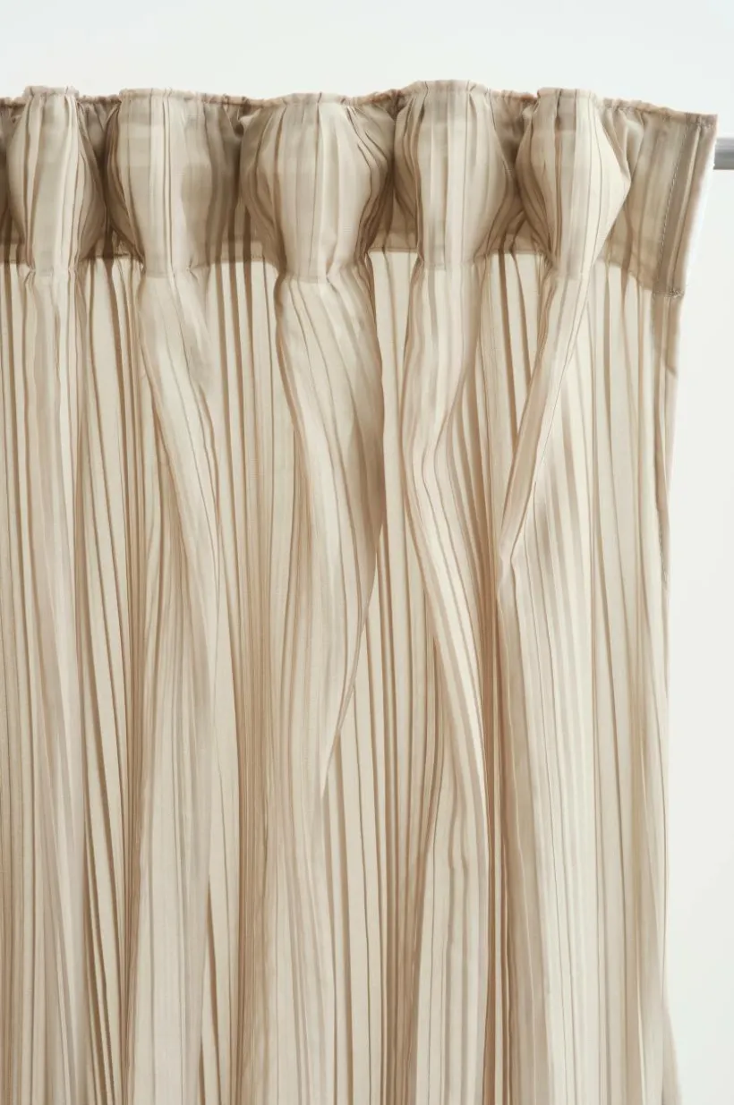 Två gardinlängder i plisserad polyester och med påsytt multifunktionsband. Det skira tyget har små lagda veck som gör längderna speciella. Nederkanten har en tät overlocksöm så att plisseringen får ett smidigt avslut och vecken faller fint. Gardinen kan hängas upp med fingerkrokar, kanal samt dold hälla.