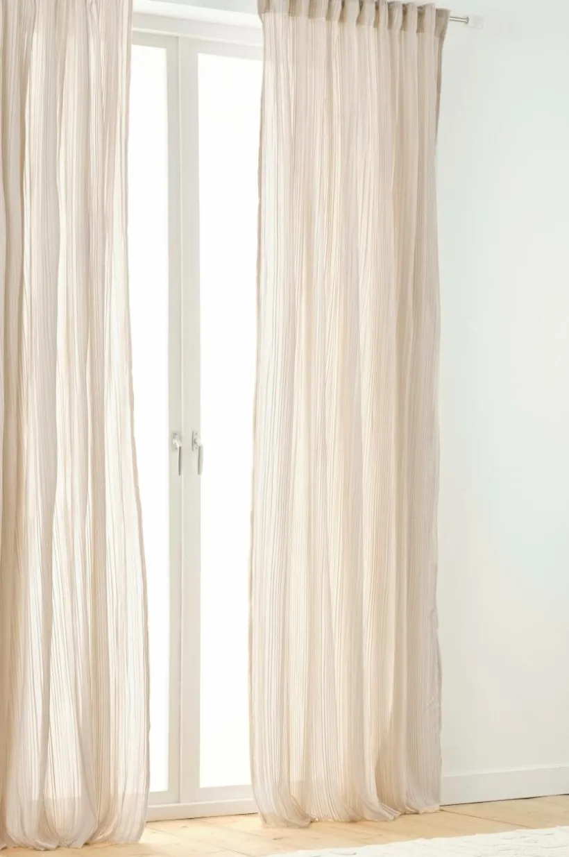 Två gardinlängder i plisserad polyester och med påsytt multifunktionsband. Det skira tyget har små lagda veck som gör längderna speciella. Nederkanten har en tät overlocksöm så att plisseringen får ett smidigt avslut och vecken faller fint. Gardinen kan hängas upp med fingerkrokar, kanal samt dold hälla.