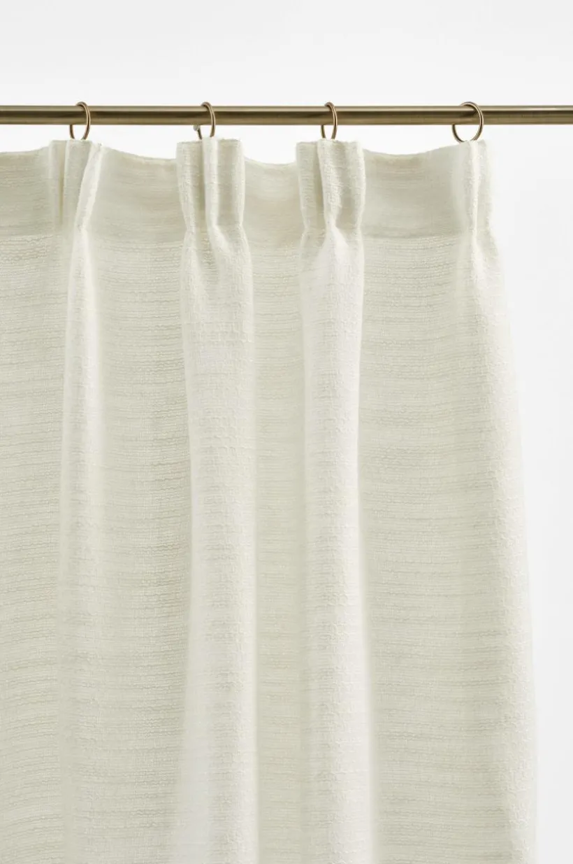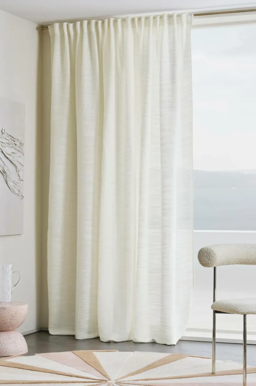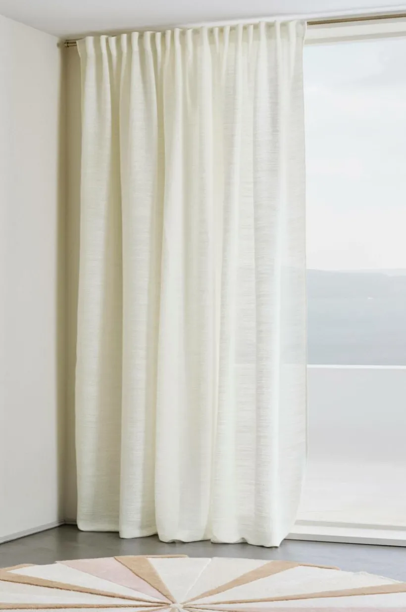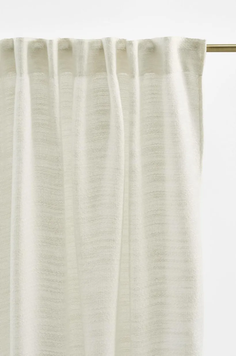 En extra bred gardinlängd i ett vackert tyg där trådar i olika tjocklek och kvalité vävts så att ett livfullt mönster skapas. Gardinerna har ett klassiskt och fräscht uttryck och passar in i många olika stilar. TESS har påsytt multifunktionsband och gardinen kan hängas upp med fingerkrokar, kanal samt dold hälla. Tygets gramvikt 240 g/m².