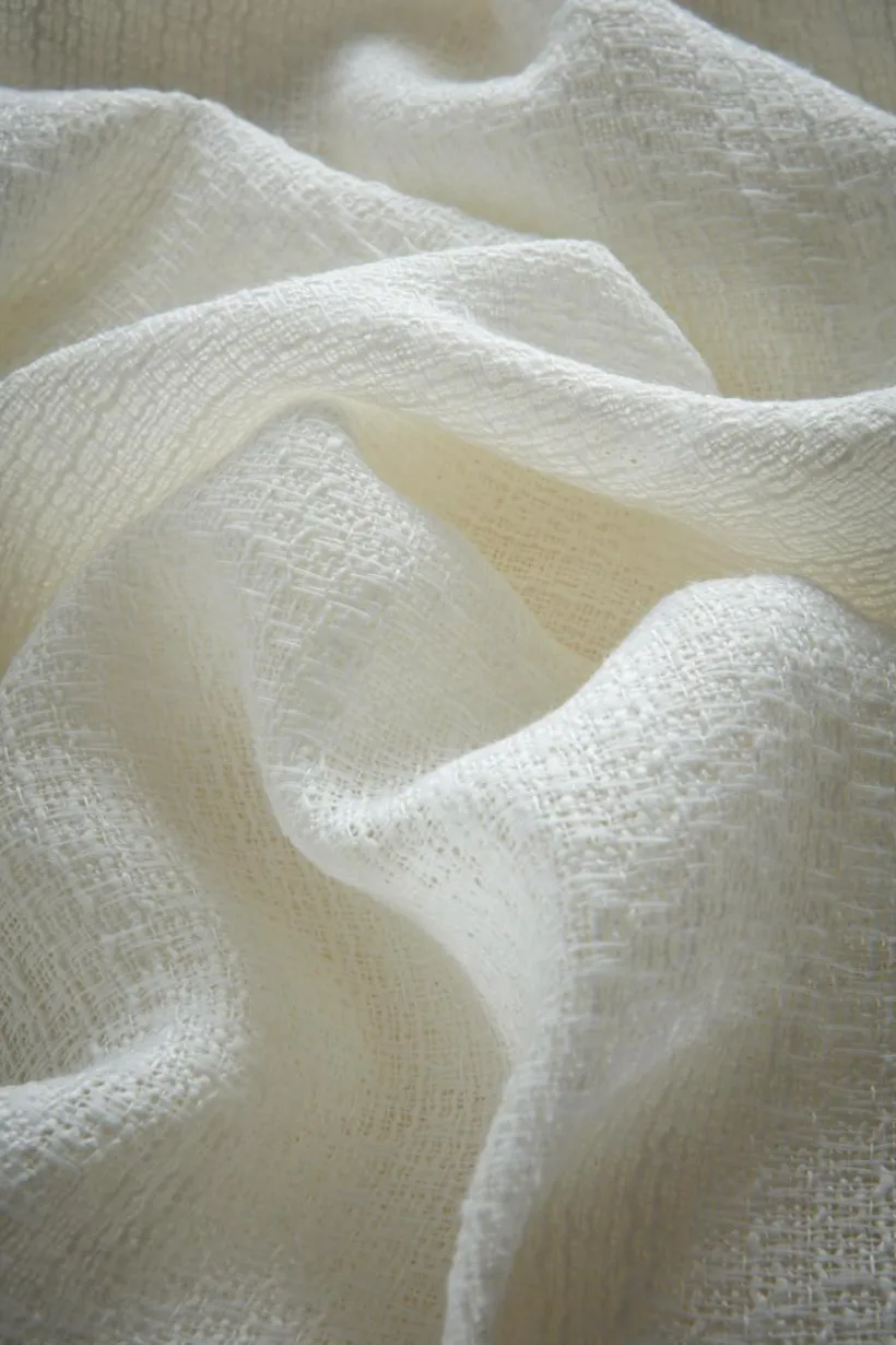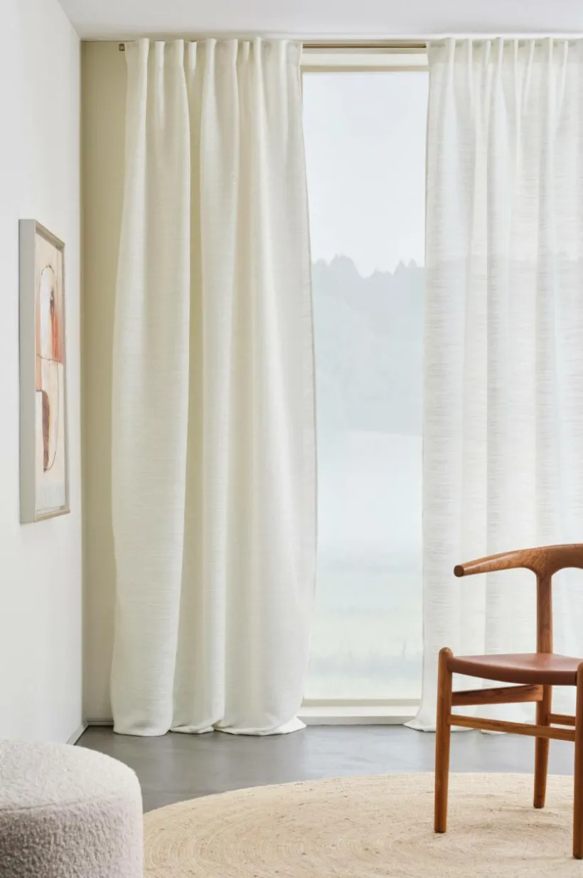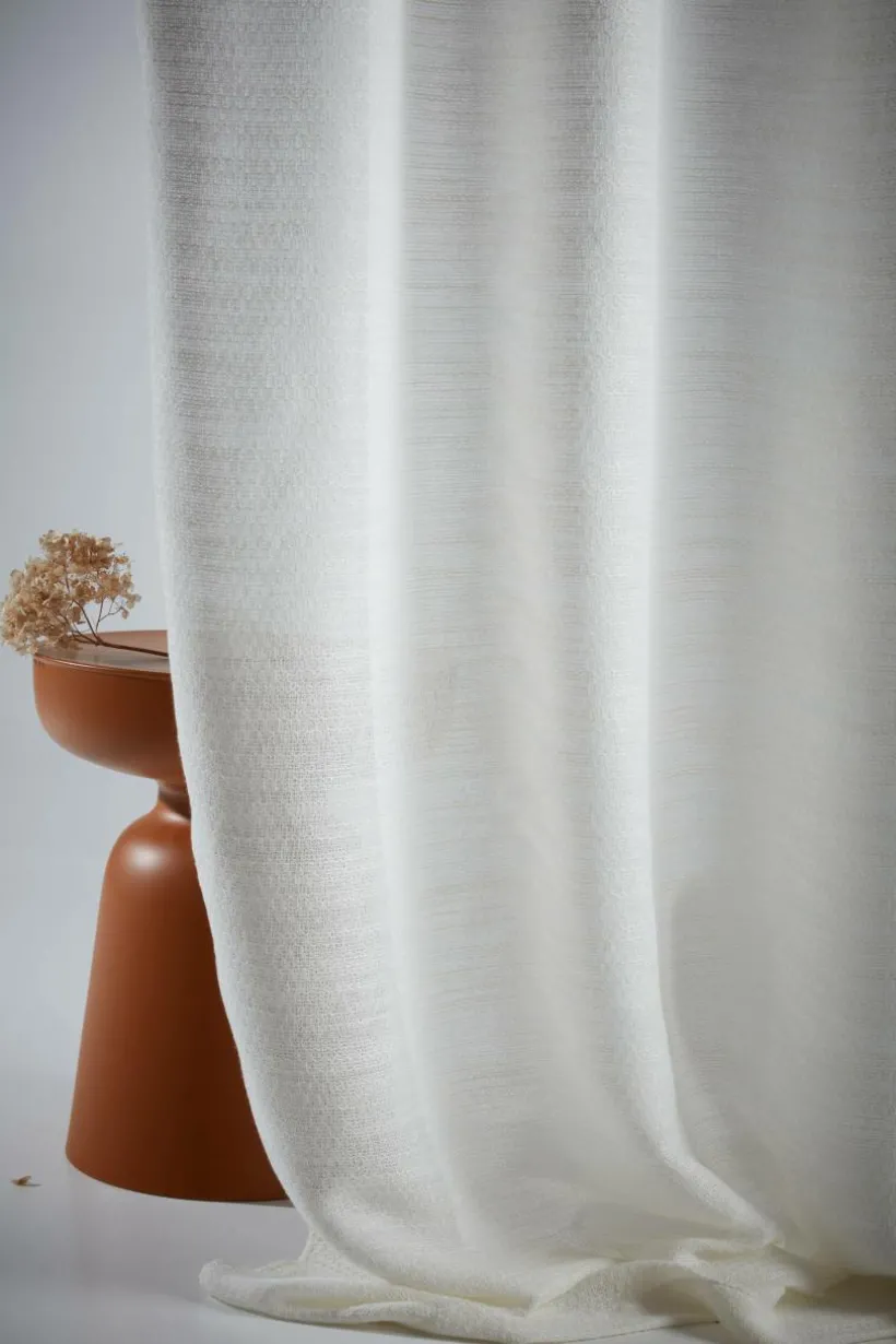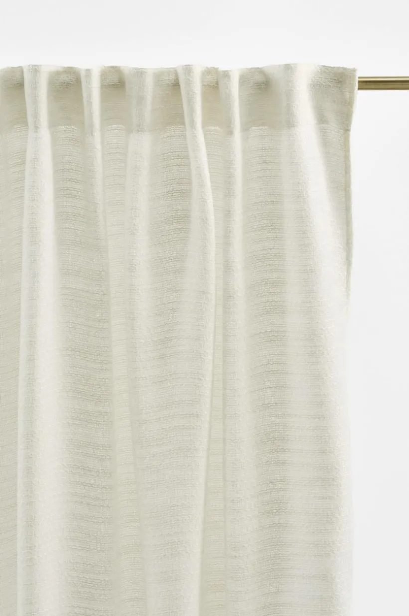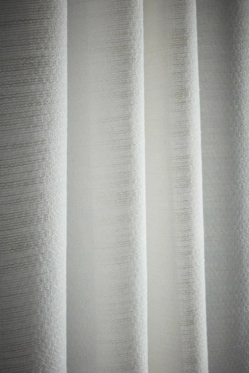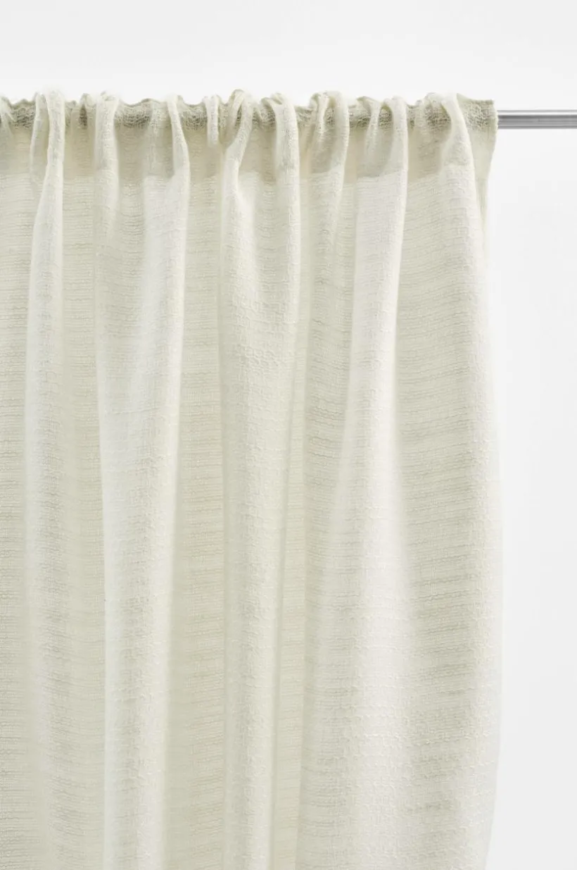 Två gardinlängder i ett vackert tyg där trådar i olika tjocklek och kvalité vävts så att ett livfullt mönster skapas. Gardinerna har ett klassiskt och fräscht uttryck och passar in i många olika stilar. TESS har påsytt multifunktionsband och gardinen kan hängas upp med fingerkrokar, kanal samt dold hälla. Tygets gramvikt 240 g/m².