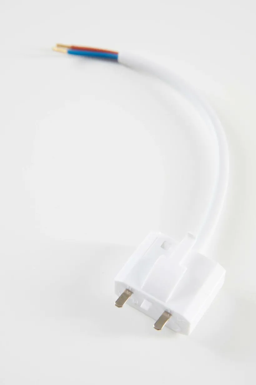 DCL 2-polig takplugg med vit sladd för plintanslutning. Denna är ojordad (klass 2) och kan endast användas med ojordade lampor. För inomhusbruk. Följer ny standard för lampkontakter och uttag som EU införde 1 april 2019.