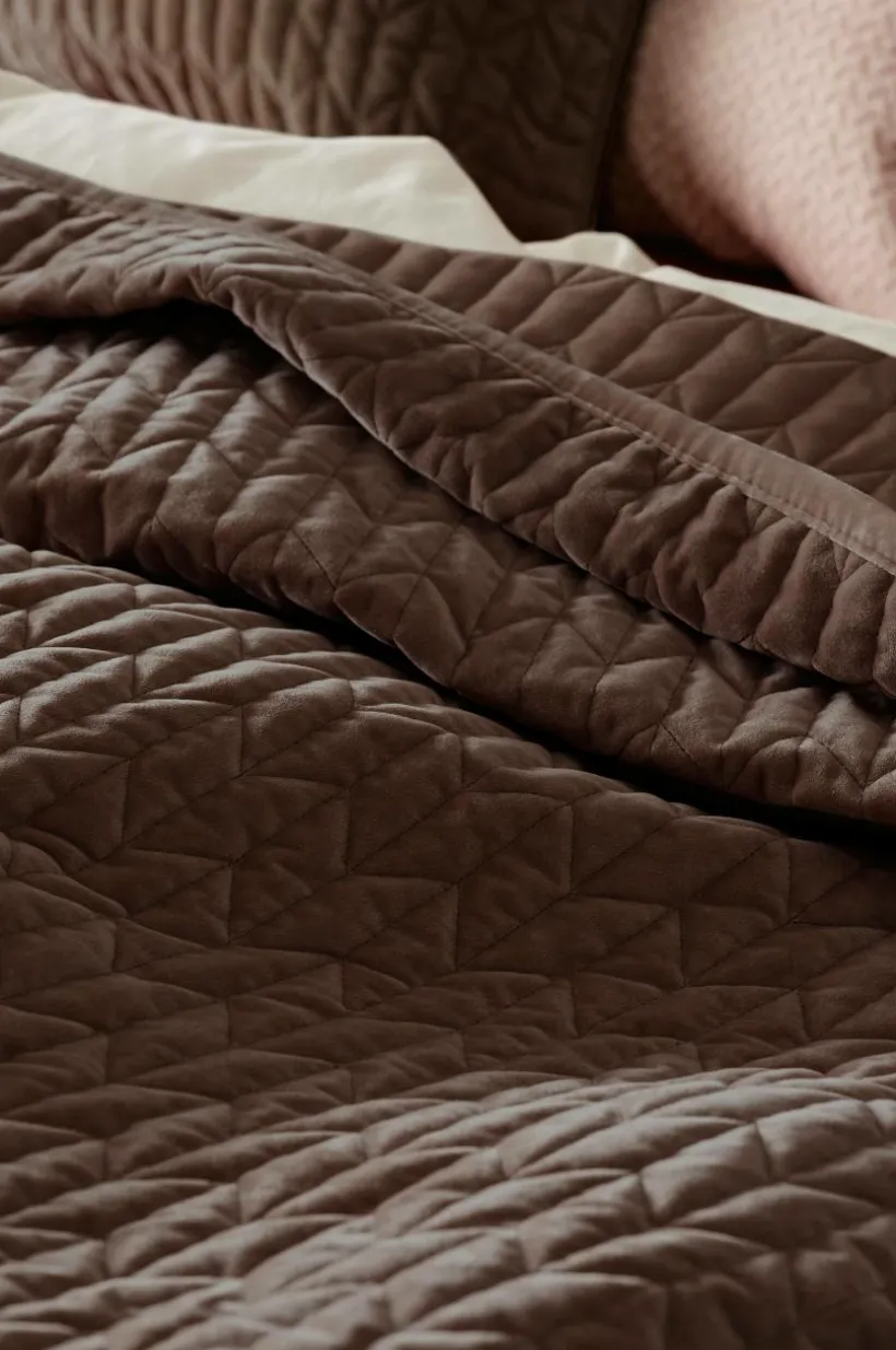 Bäddpaket med överkast i quiltad sammet med dekorativa sömmar och piping runt om.