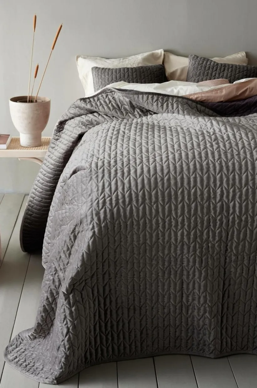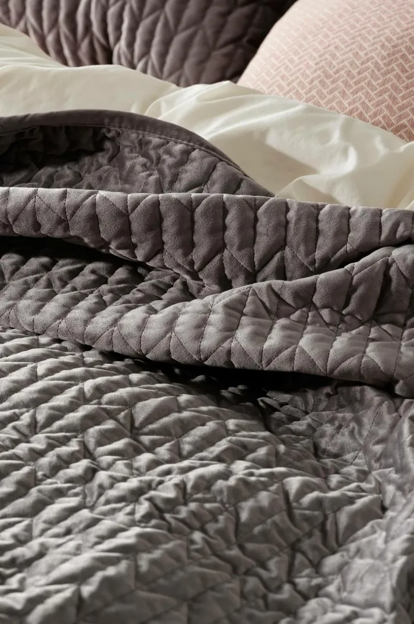 Överkast i quiltad sammet med dekorativa sömmar och piping runt om.