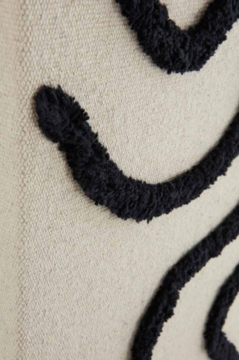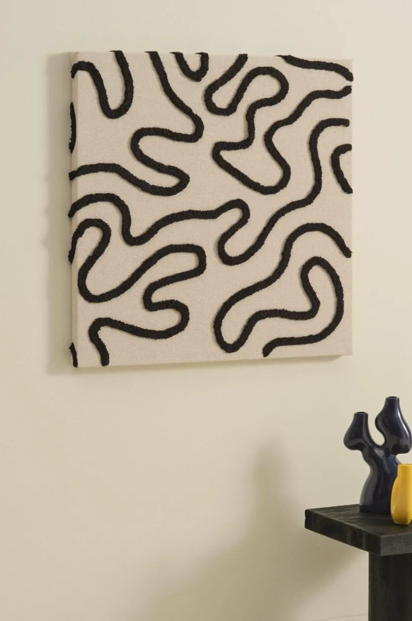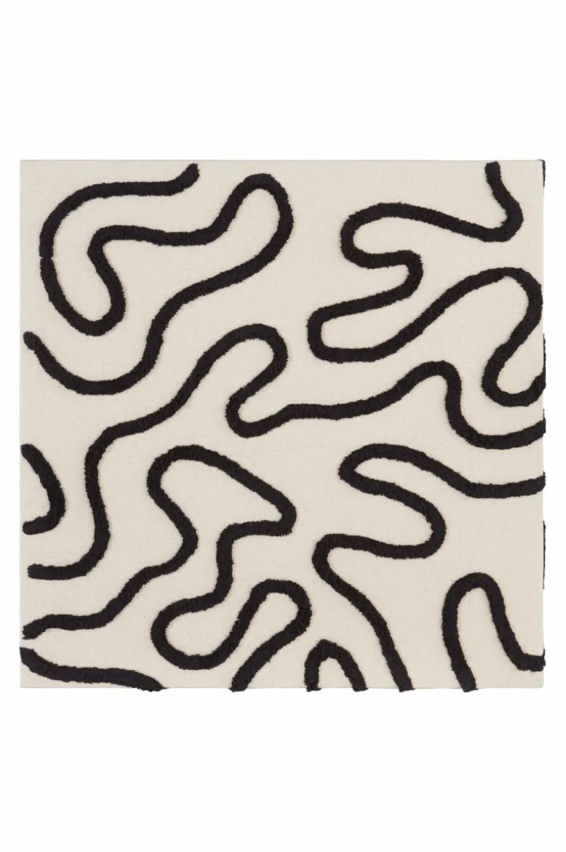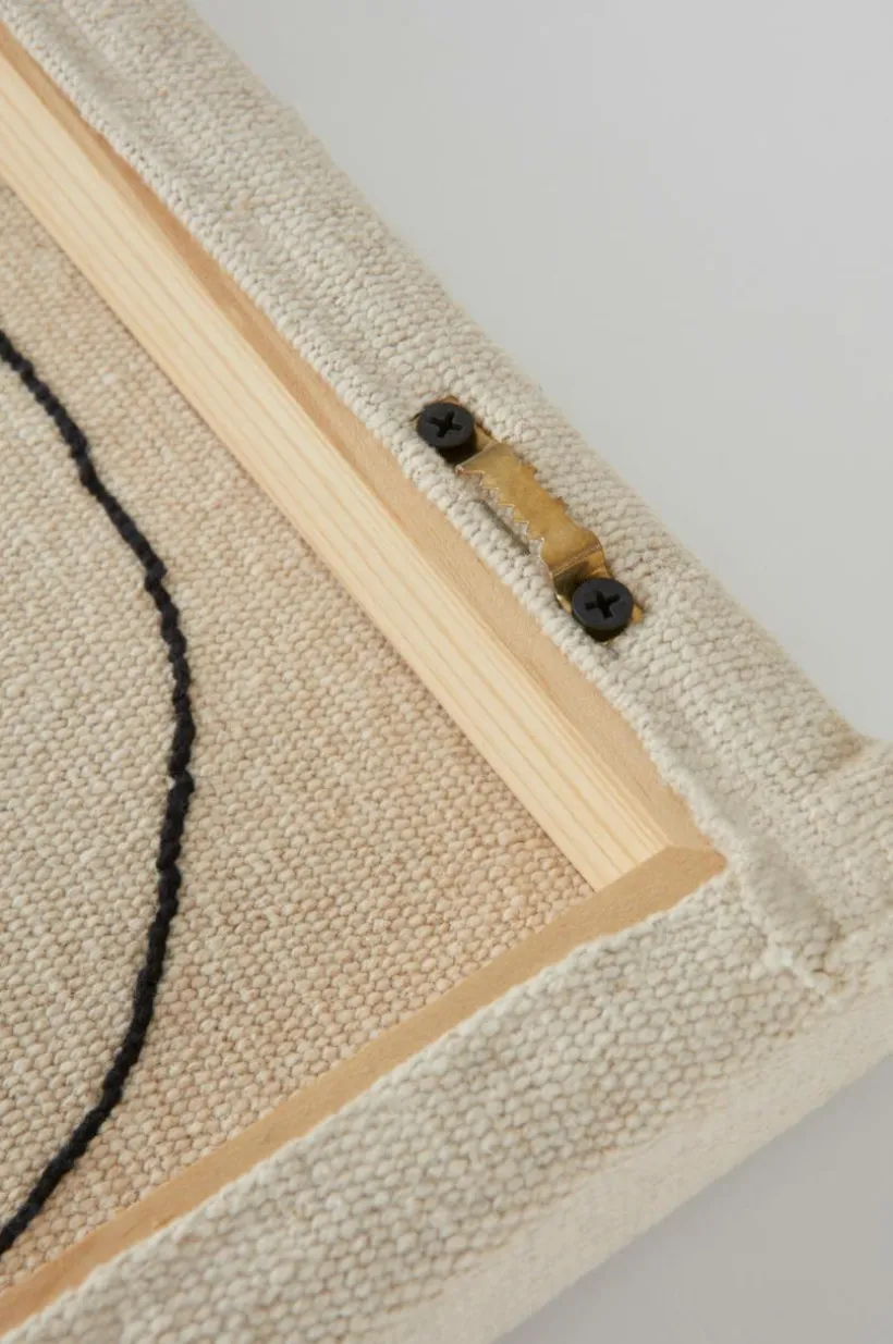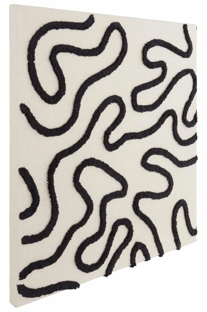 Väggdekoration som är tuftad av bomull på vävd botten även den av bomull. Den tuftade mattan är uppspänd på träram vilket blir mycket dekorativt samtidigt som textilier kan ha dämpande effekt på ljudnivån. Två våggfästen på baksidan.