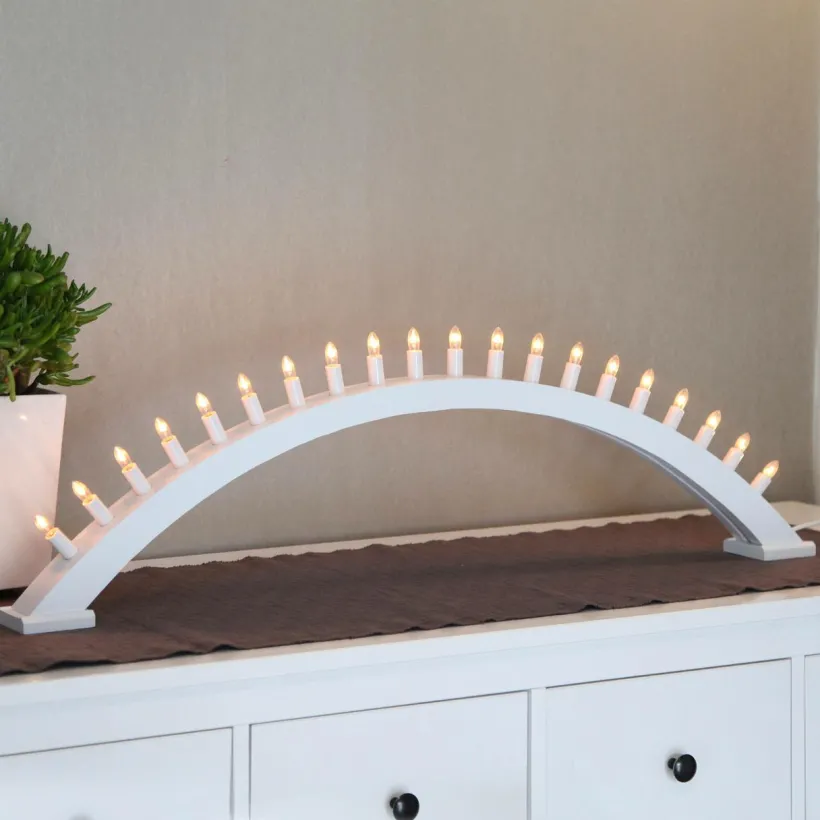 Mått: Bredd 105 cm. Djup 7 cm. Höjd 30 cm. Träljusstake Kulle 20 ljus. 230 V. Sladd 1,8 m.
