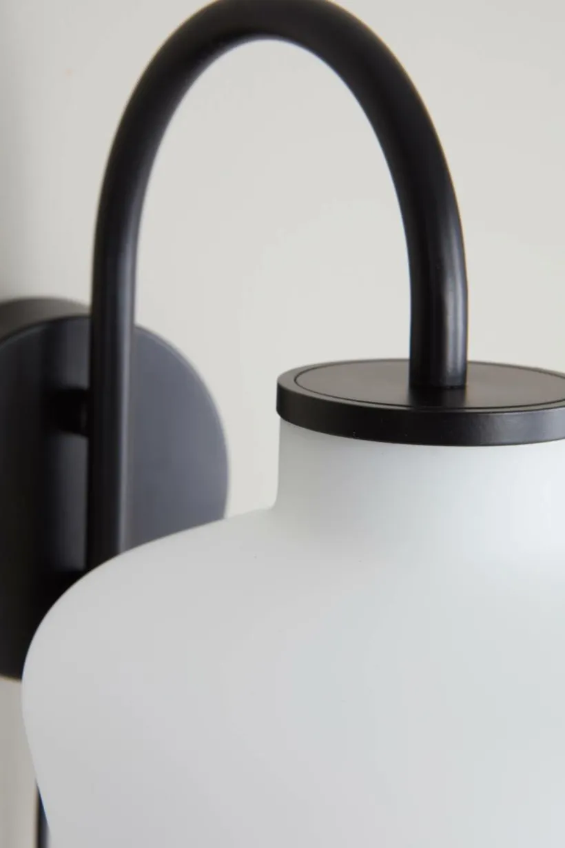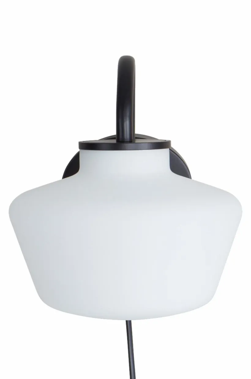 Vägglampa med rundat lampfäste av järn och fint formad glaskupa. Lampan skapar en inbjudande och gammaldags atmosfär. Sladd av PVC med strömbrytare på sladden. Lampan är ojordad, klass 2.