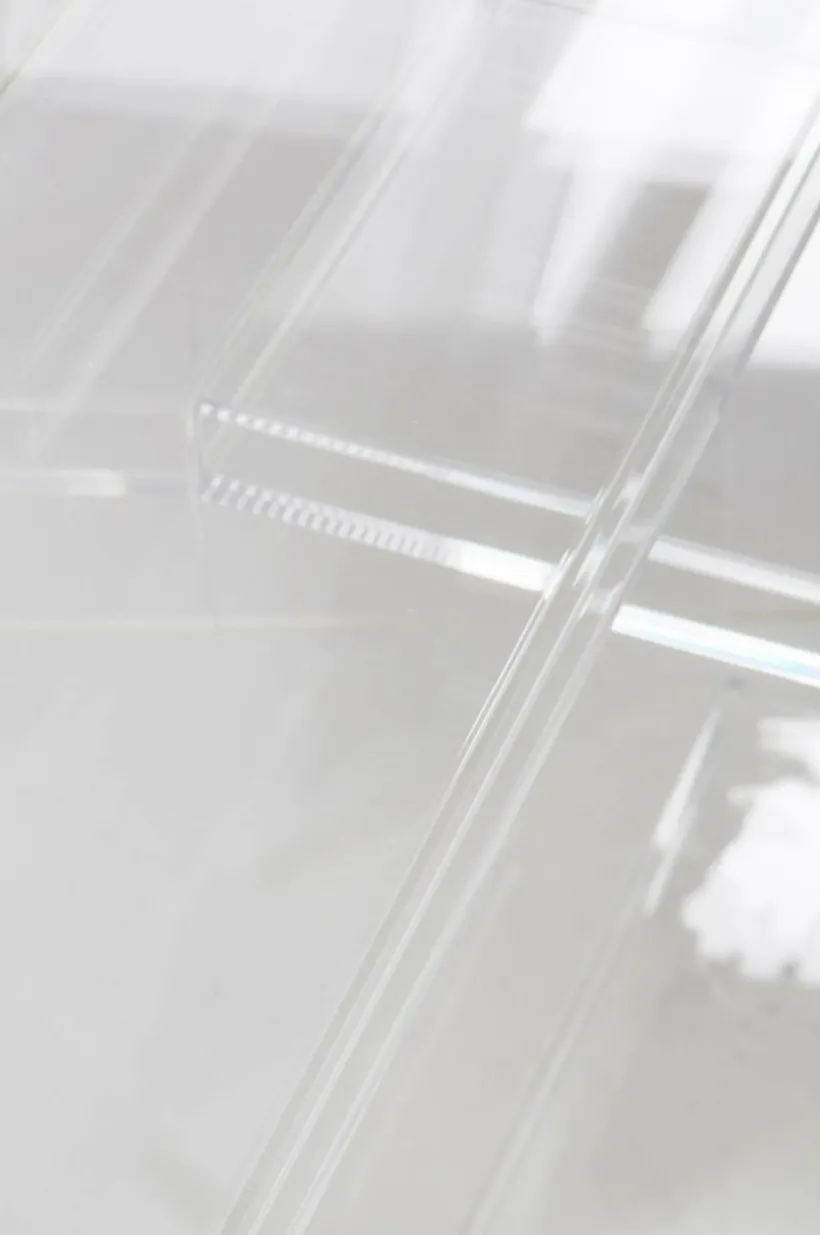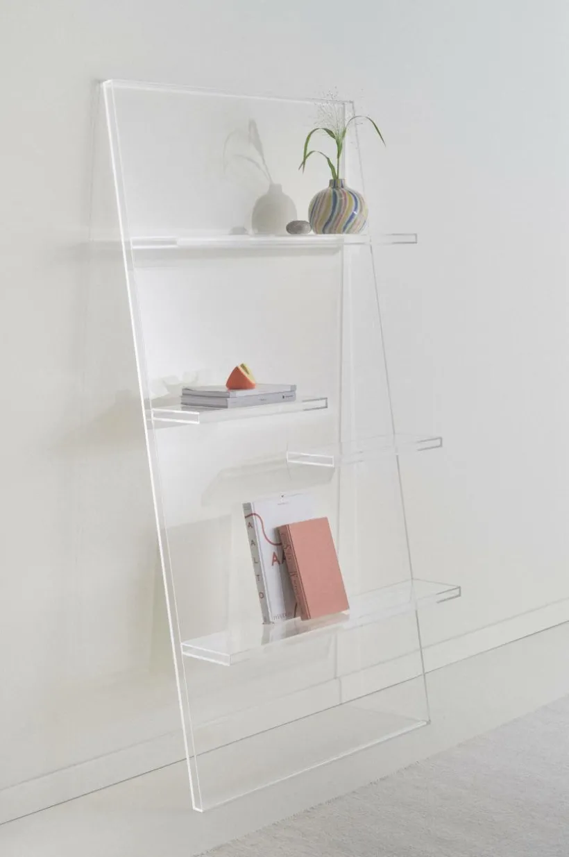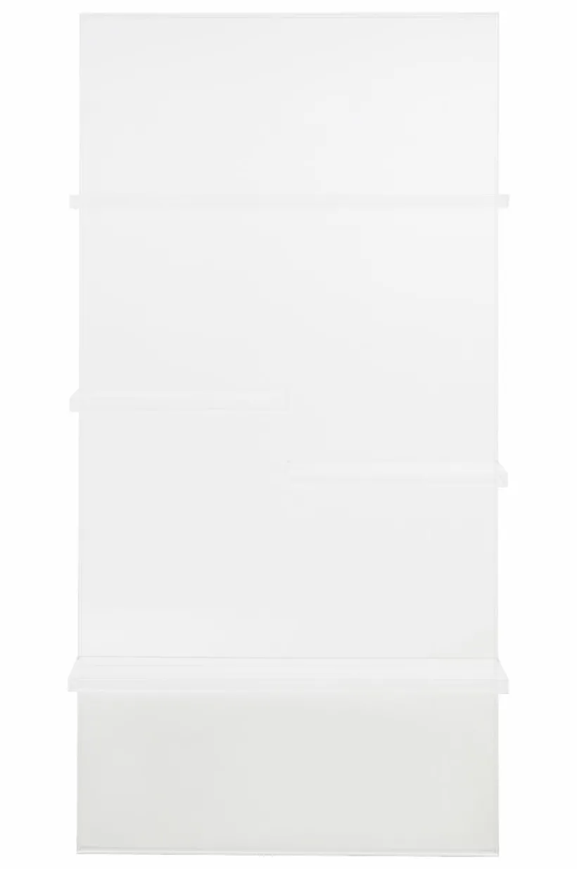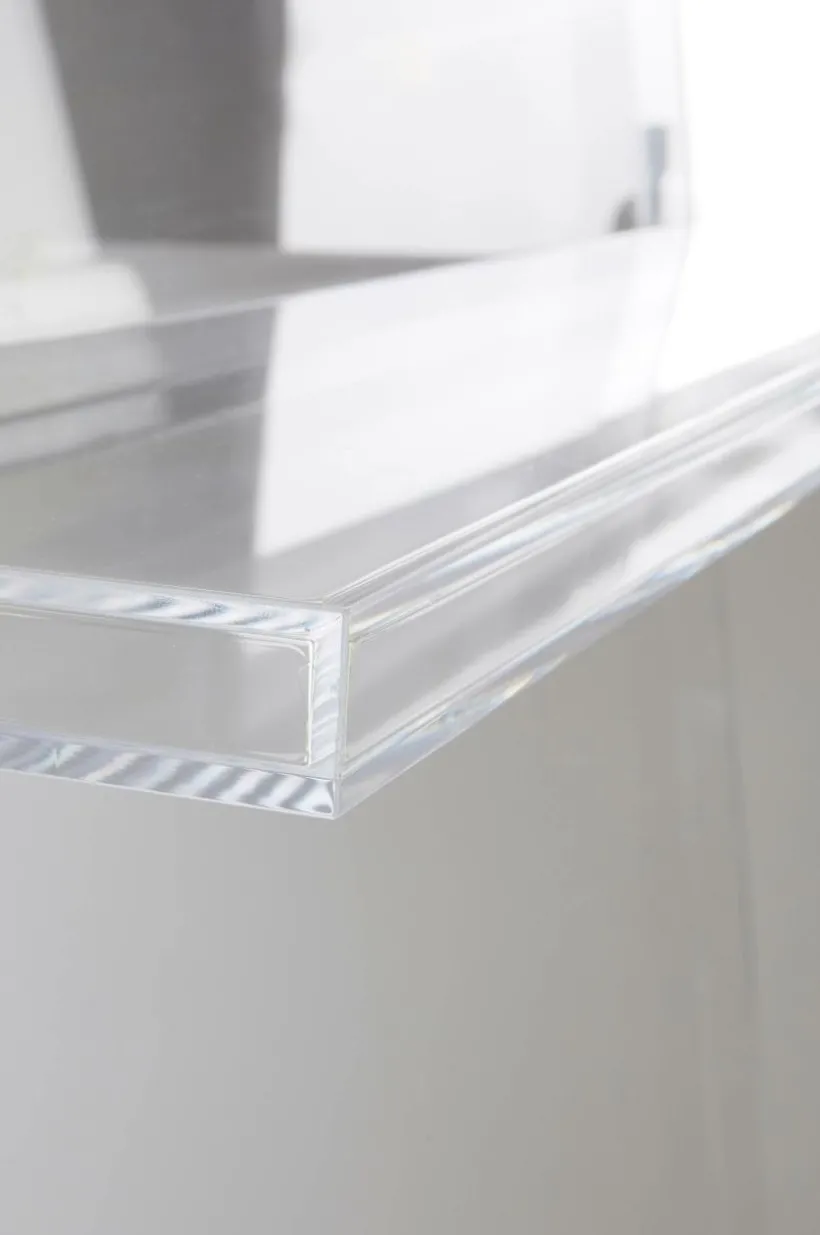 Vägghylla av transparent akrylglas. Hyllan har snyggt placerade hyllplan och exponerar saker som du tycker extra mycket om på ett öppet och fint sätt och den ger skön, futuristisk känsla.