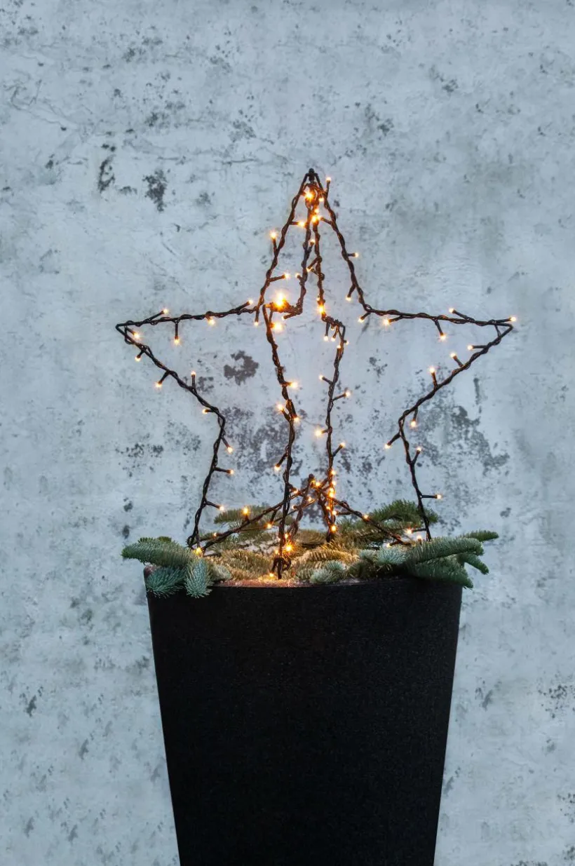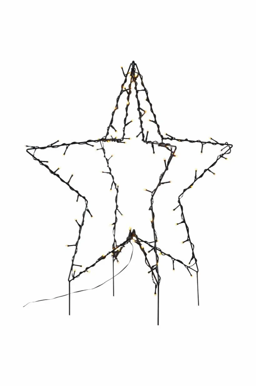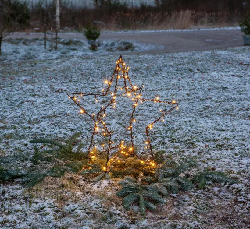 Vacker utomhusdekoration för din trädgård. Lättplacerad i kruka eller på marken. 10 cm långa markpinnar i nederkant av stjärnan som skall tryckas ner i marken. Svart anslutningskabel, 300 cm. Höjd 55 cm, bredd/längd 60 cm och djup 60 cm. Antal LED ljuskällor 90 stycken. Total effekt 3,60W.