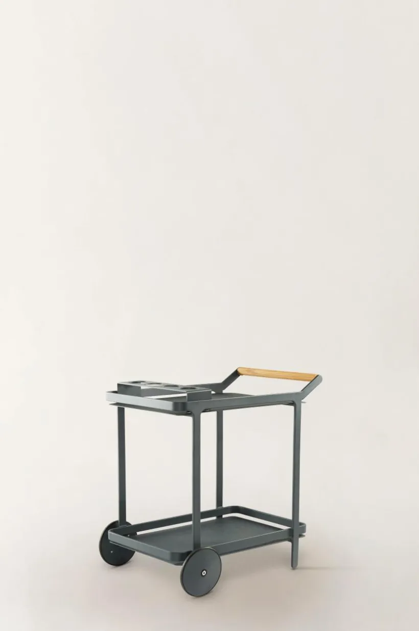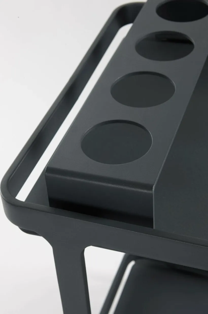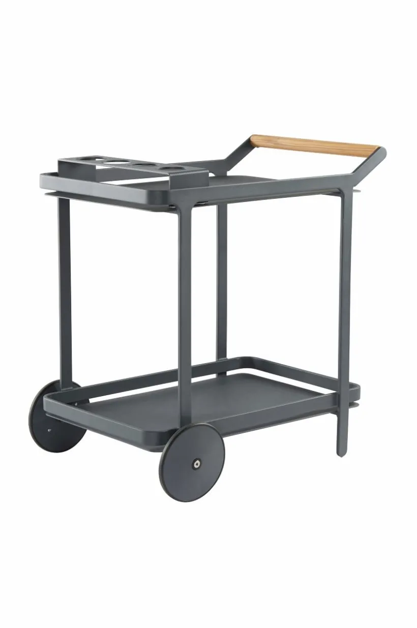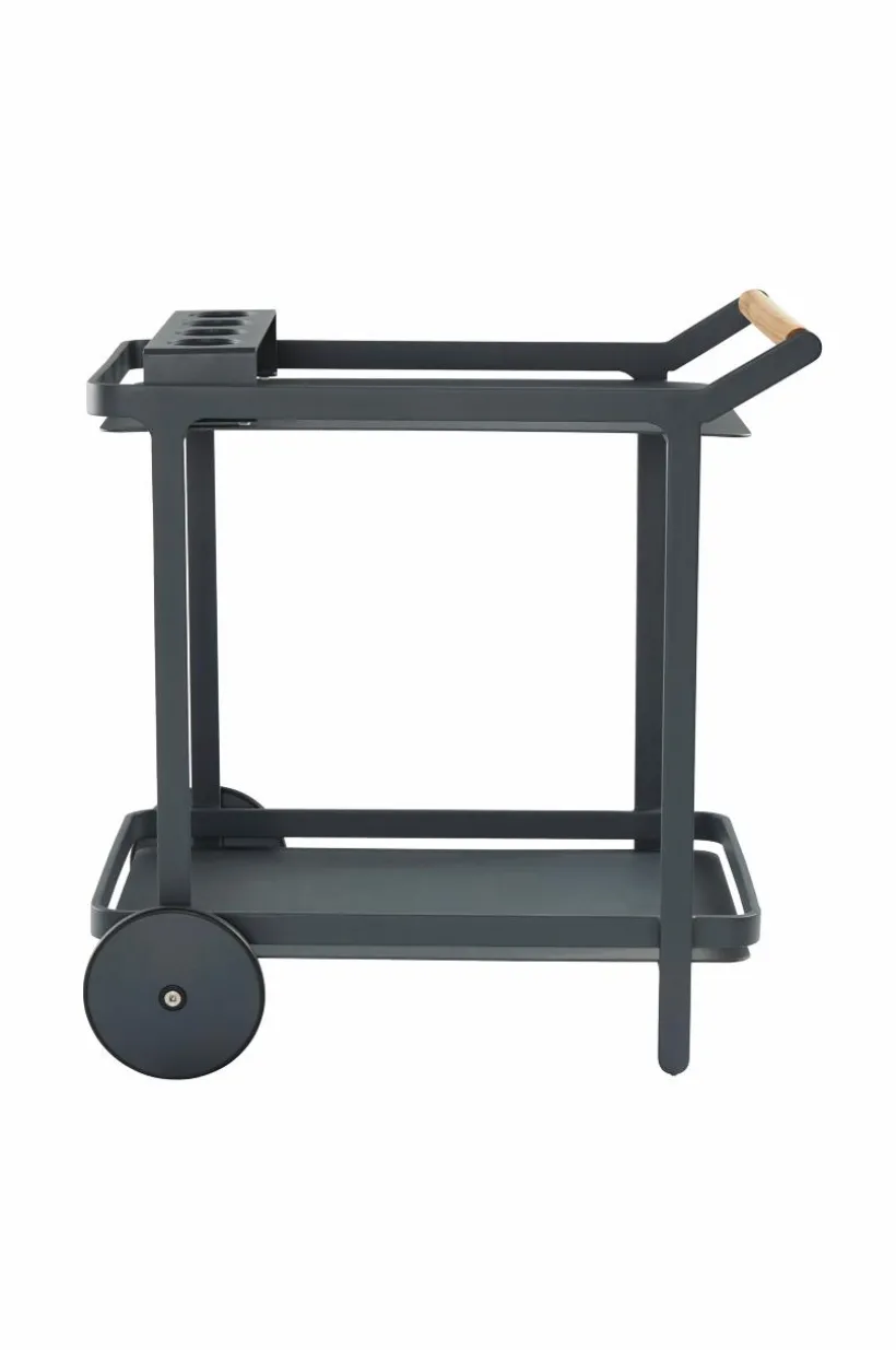 Serveringsvagn av pulverlackerad aluminium med matt yta och bekvämt, runt handtag av trä. VENEZIA gör livet på altanen enklare till exempel när du ska servera vid bordet eller vid grillen som tillbehörsvagn. En praktisk hållare för fyra glas eller flaskor ingår och matchar vagnen perfekt. Den kan du placera var du vill på vagnen. Hjulparet i framkant gör den enkel att köra, du bara lyfter och rullar fram och serveringsvagnen står stabilt eftersom den bara har ett hjulpar. Aluminium är ett bra och tåligt material utomhus och det rostar inte. Viss montering krävs.