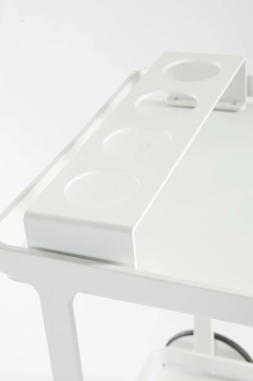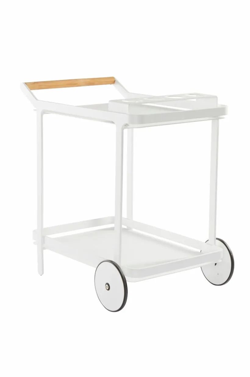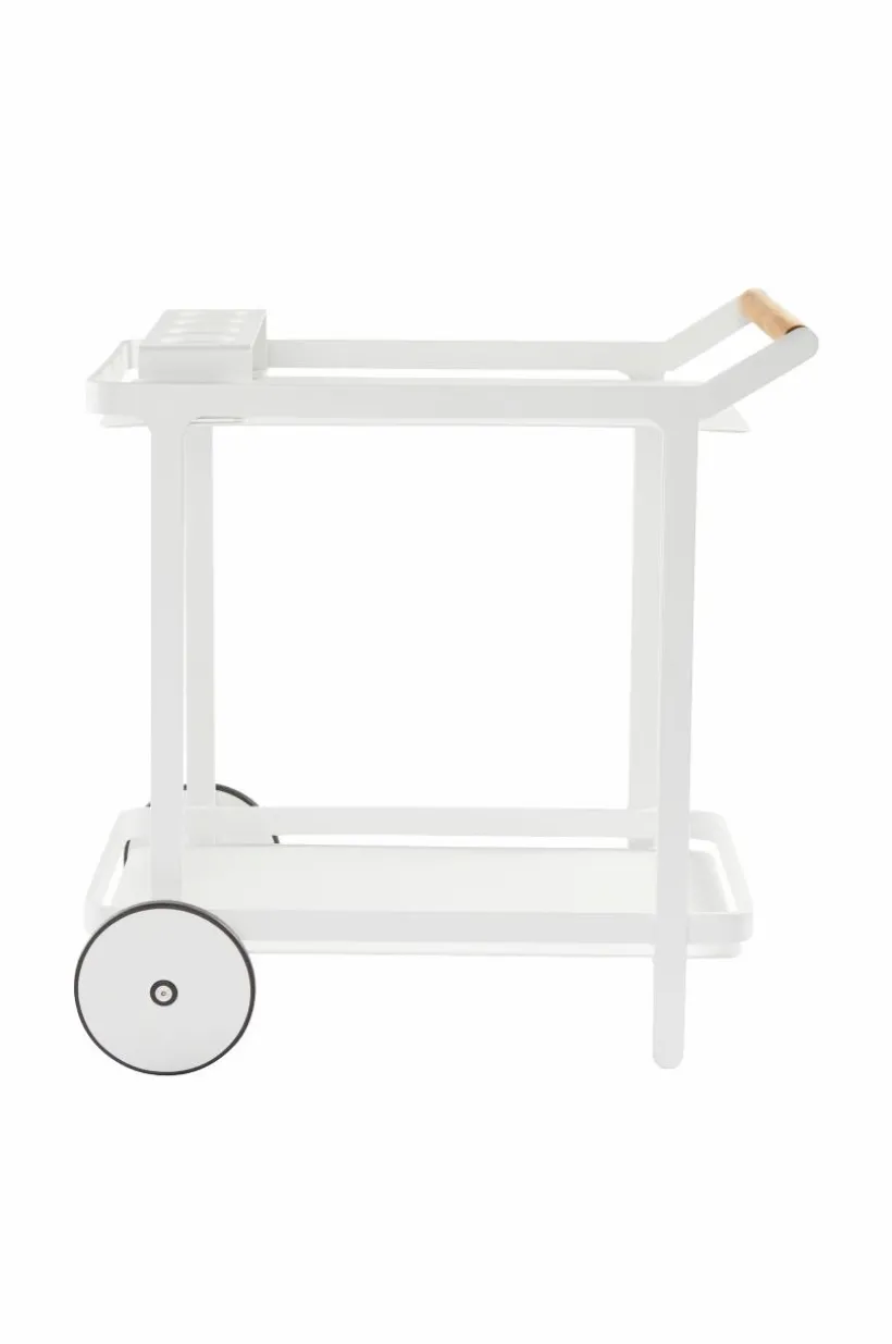 Serveringsvagn av pulverlackerad aluminium med matt yta och bekvämt, runt handtag av trä. VENEZIA gör livet på altanen enklare till exempel när du ska servera vid bordet eller vid grillen som tillbehörsvagn. En praktisk hållare för fyra glas eller flaskor ingår och matchar vagnen perfekt. Den kan du placera var du vill på vagnen. Hjulparet i framkant gör den enkel att köra, du bara lyfter och rullar fram och serveringsvagnen står stabilt eftersom den bara har ett hjulpar. Aluminium är ett bra och tåligt material utomhus och det rostar inte. Viss montering krävs.